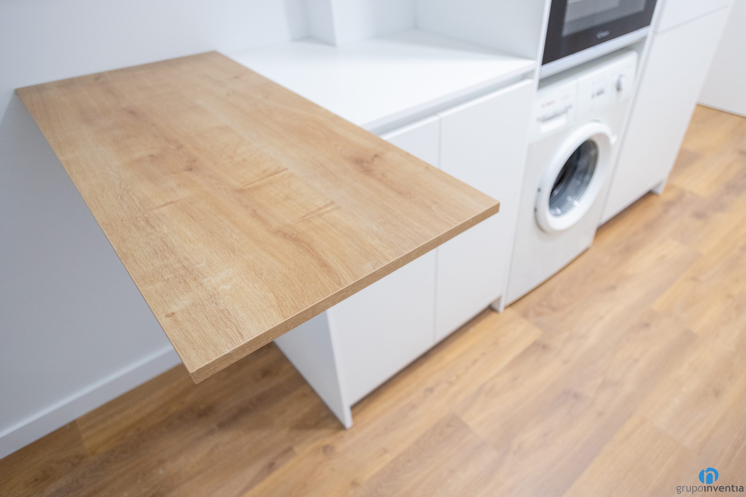 A la banda esquerra s’ha col·locat la resta del mobiliari de cuina. Es tracta d’un moble amb buits a mida per col·locar-hi diversos electrodomèstics. Concretament un forn, una rentadora i una nevera que queda camuflada per les portes de l’armari de cuina. Es completa amb diversos armaris per a lemmagatzematge i una barra de cuina.