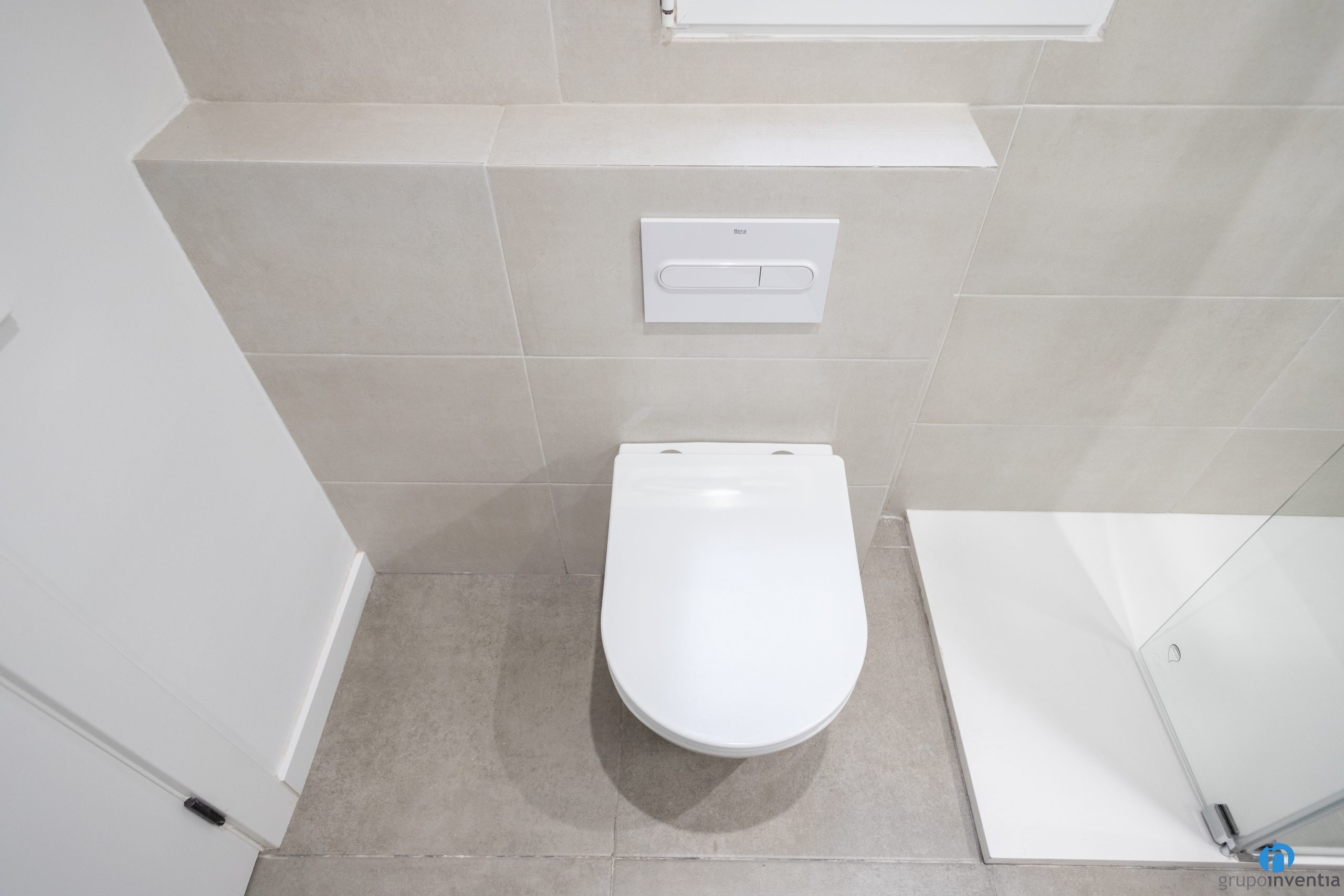 Pel nou equipament sanitari s’ha optat per tres peces sanitàries. Hem col·locat un lavabo flotant amb dos calaixos per a l’emmagatzematge. Just al costat trobem el nou plat de dutxa. Té forma rectangular i està protegit per una mampara transparent. També hem instal·lat un vàter flotant amb la cisterna oculta a la paret.