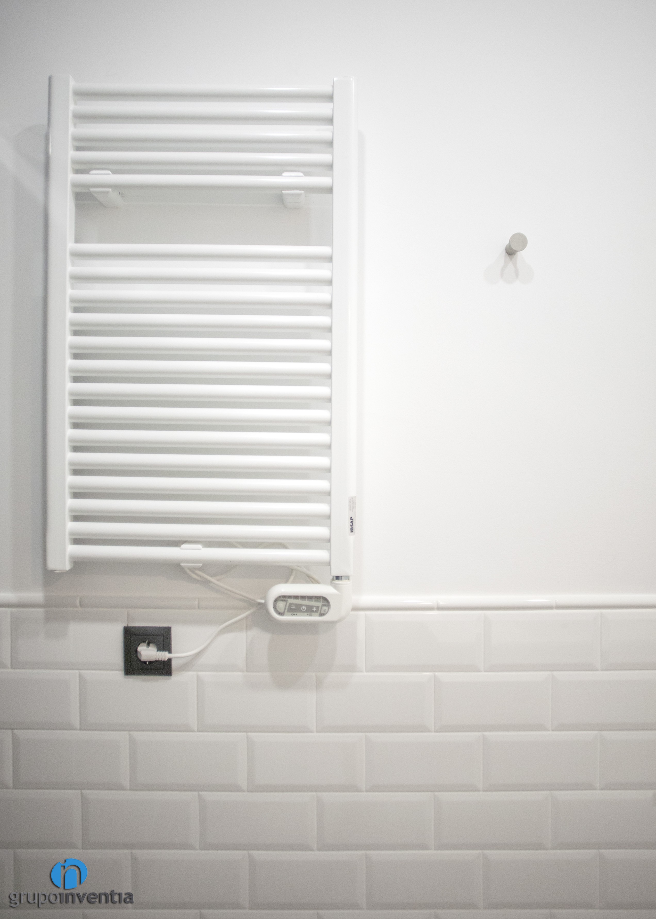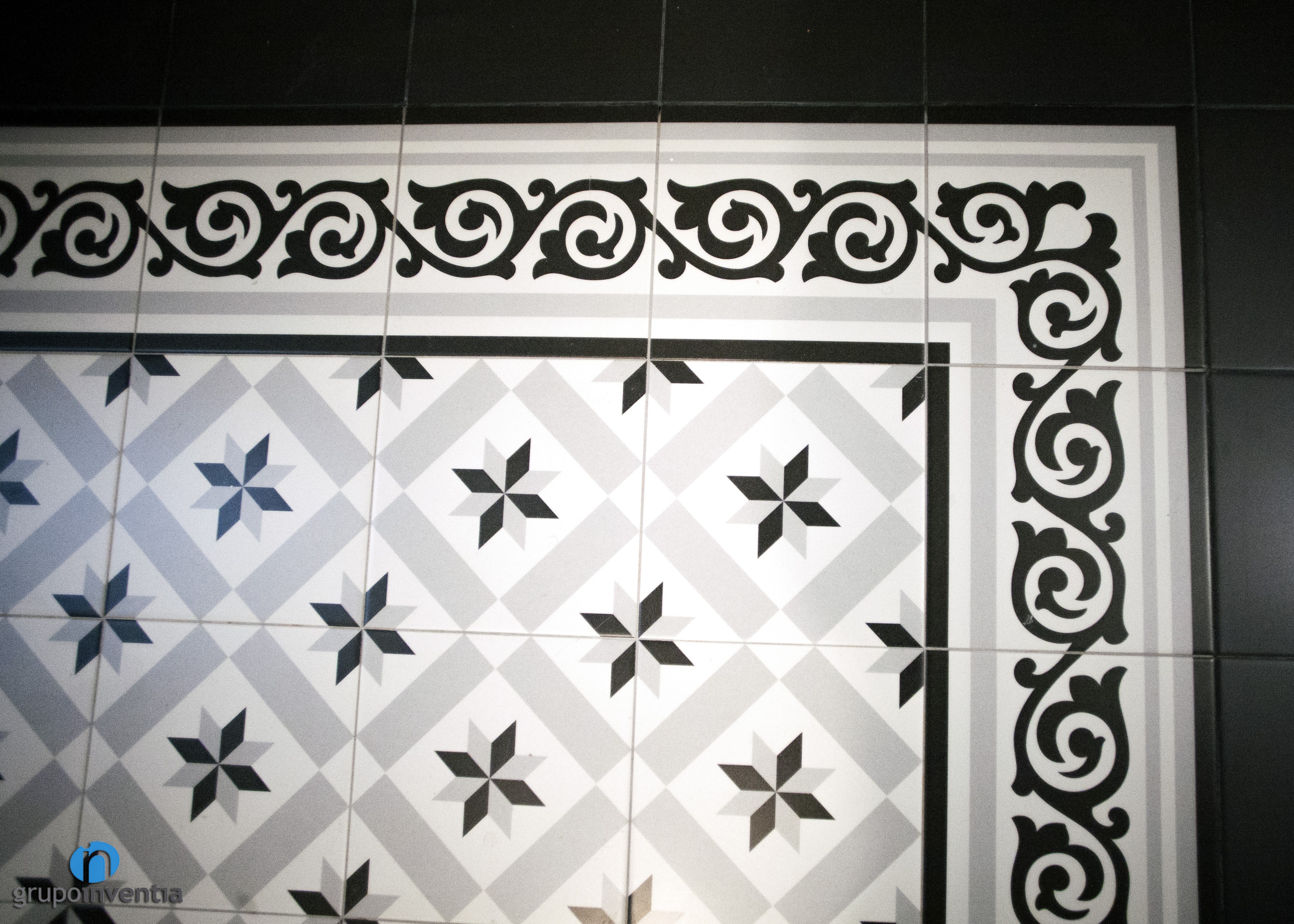 Les parets de la cambra de bany es van enrajolar a mitja alçada amb rajoles bisellades de color blanc, mateix color amb què es va pintar la resta de la paret. Un altre detall en el disseny interior d’aquesta estançaa és el paviment, un terra hidràulic en blanc i negre.