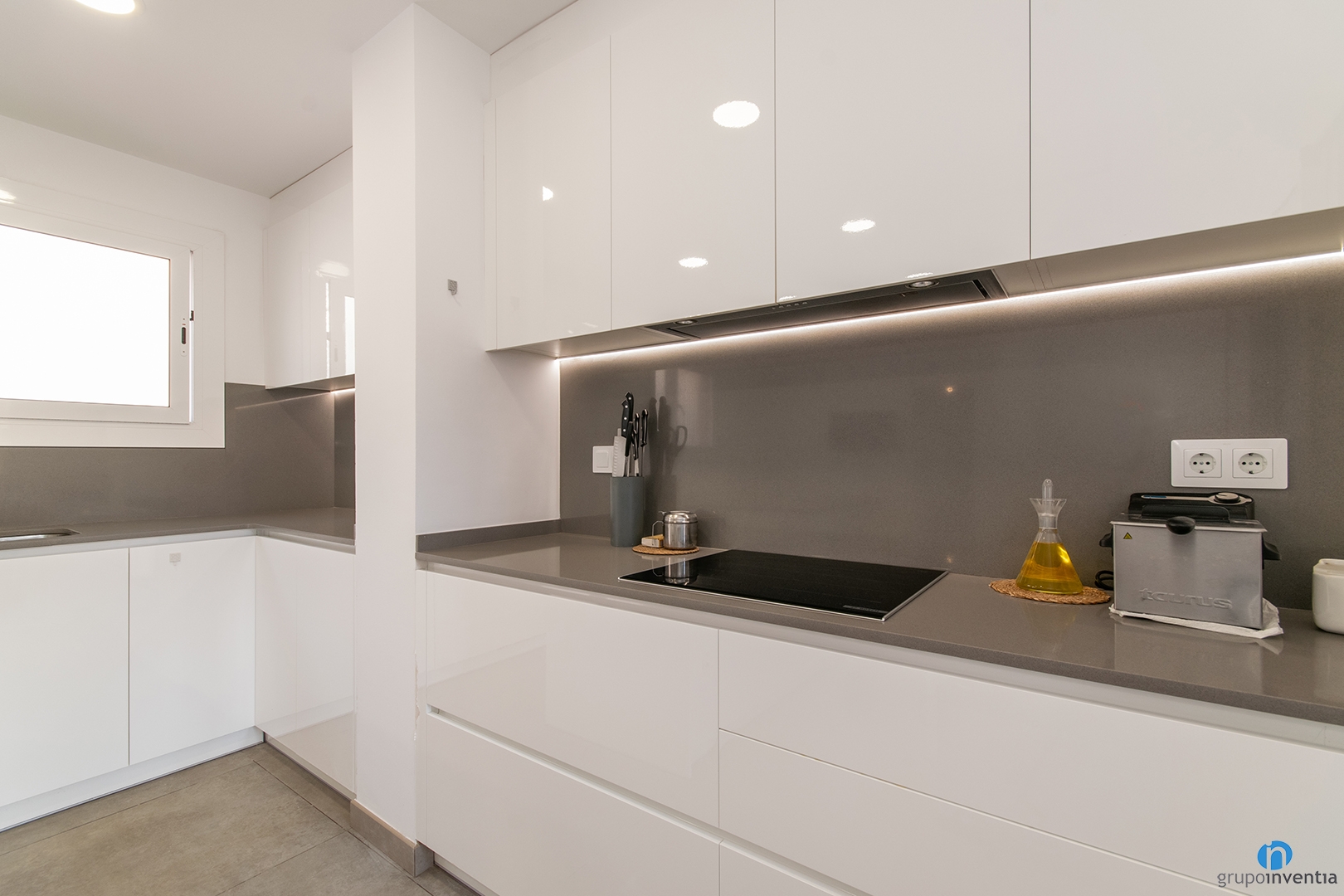 El moble de cuina té forma de L i disposa demmagatzematge tant a la part inferior com superior. L’acabat és de color blanc i contribueix a potenciar la lluminositat de l’estança. Els taulells s’han equipat amb una pica doble i una placa d’inducció. Disposa de prou espai per col·locar tot tipus de petits electrodomèstics.