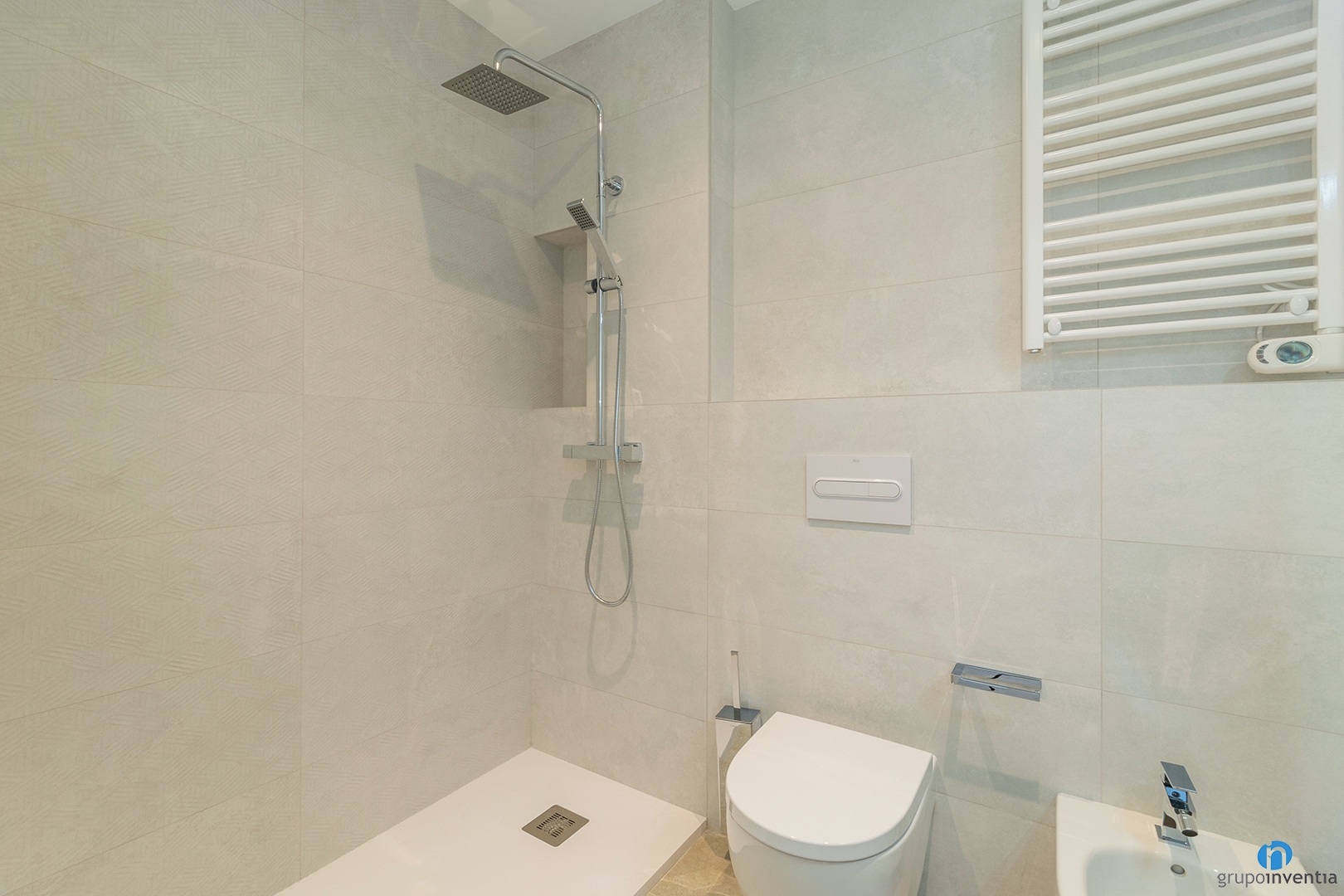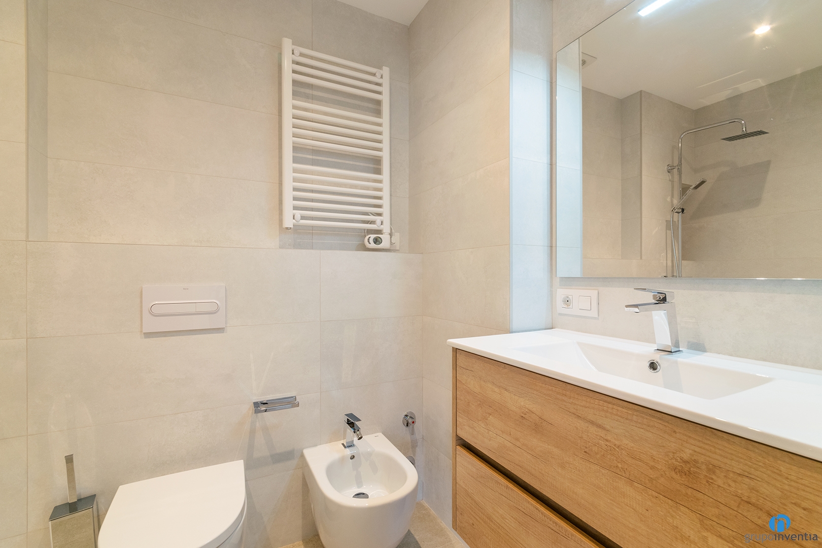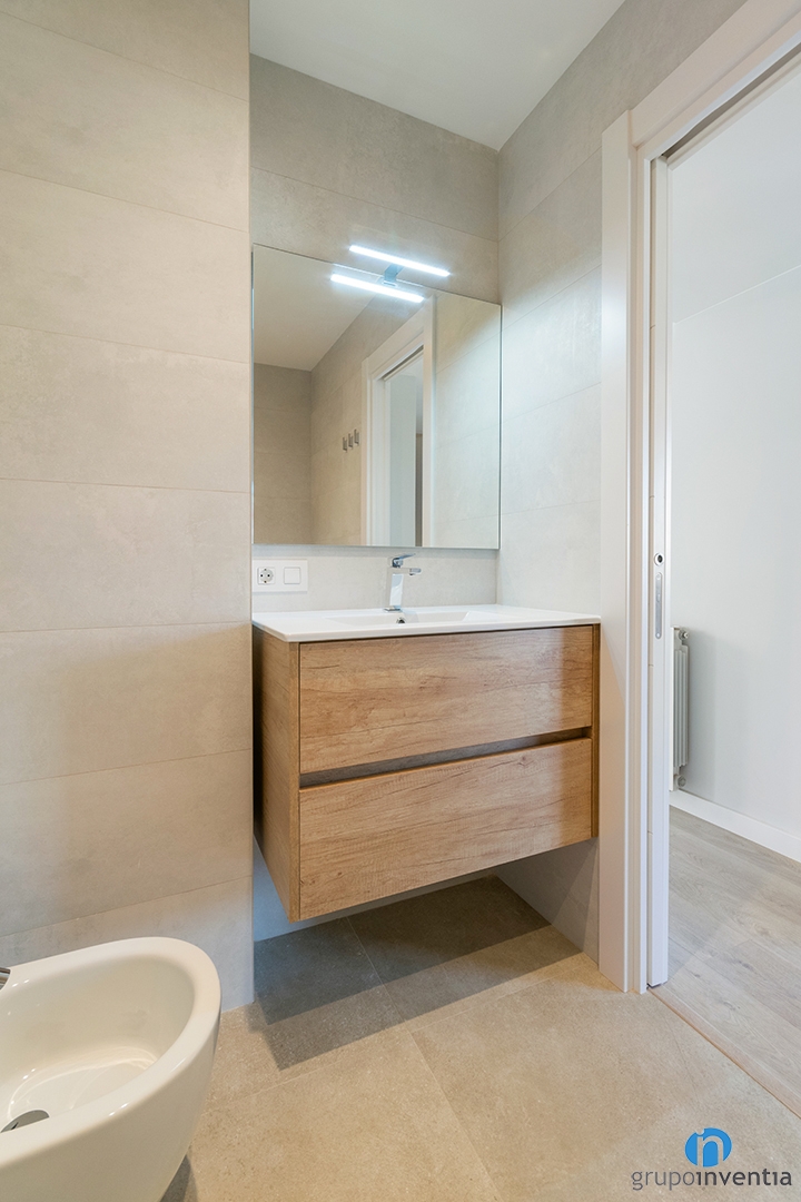Hem enrajolat les parets amb rajoles de to gris, combinant panells llis amb unes rajoles amb relleu a la dutxa. A la zona d’aigües també hem creat fornícules per col·locar productes d’higiene. Els sanitaris es completen amb vàter i bidet flotants i un lavabo amb moble de magatzematge.