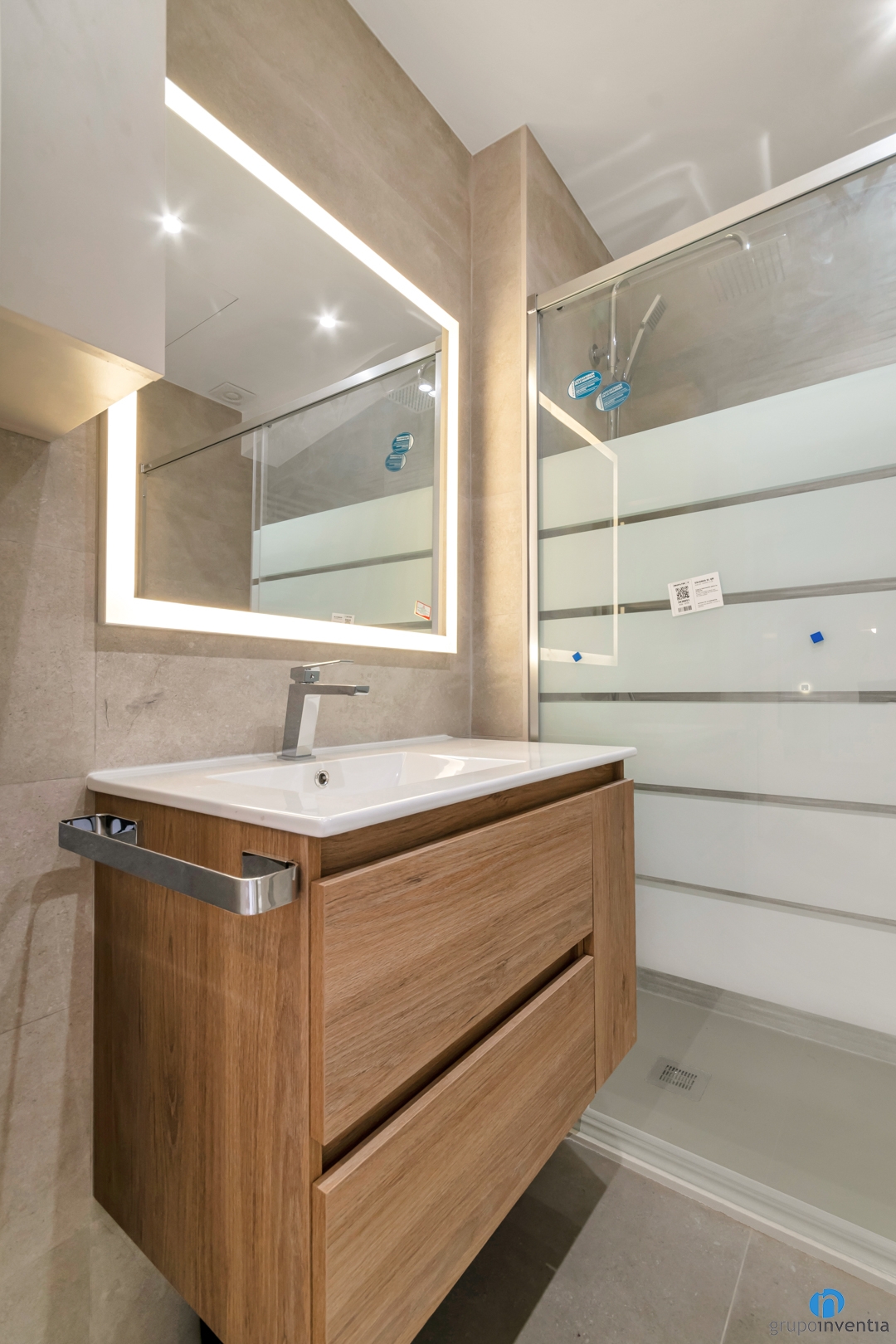 Cada bany disposa de nous sanitaris compostos per lavabo amb moble d’emmagatzematge, vàter i plat de dutxa. És un equipament altament funcional i amb característiques modernes. Pel disseny de bany s’ha seguit la imatge contemporani de la resta del pis. D’aquesta manera les parets s’han enrajolat amb rajoles de tons neutres, beix i grisos.