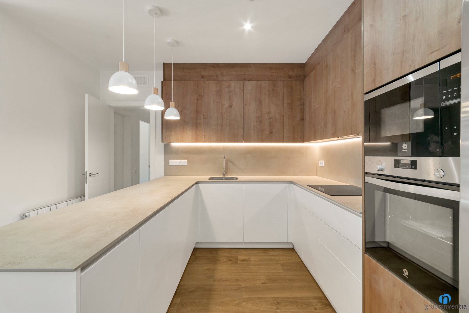 Un dels punts forts d’aquesta reforma integral ha estat la renovació completa de la cuina, que ara tenen acabats d’alta qualitat i un disseny funcional en forma d’U. Amb la nova distribució la cuina s’ha convertit en el cor de la llar, amb un mobiliari optimitzat i un equipament de darrera generació. Tot això facilita tant la vida diària com lorganització de reunions familiars i esdeveniments socials. Aquesta reforma de cuina millora l’estètica del pis i n’eleva la funcionalitat.
