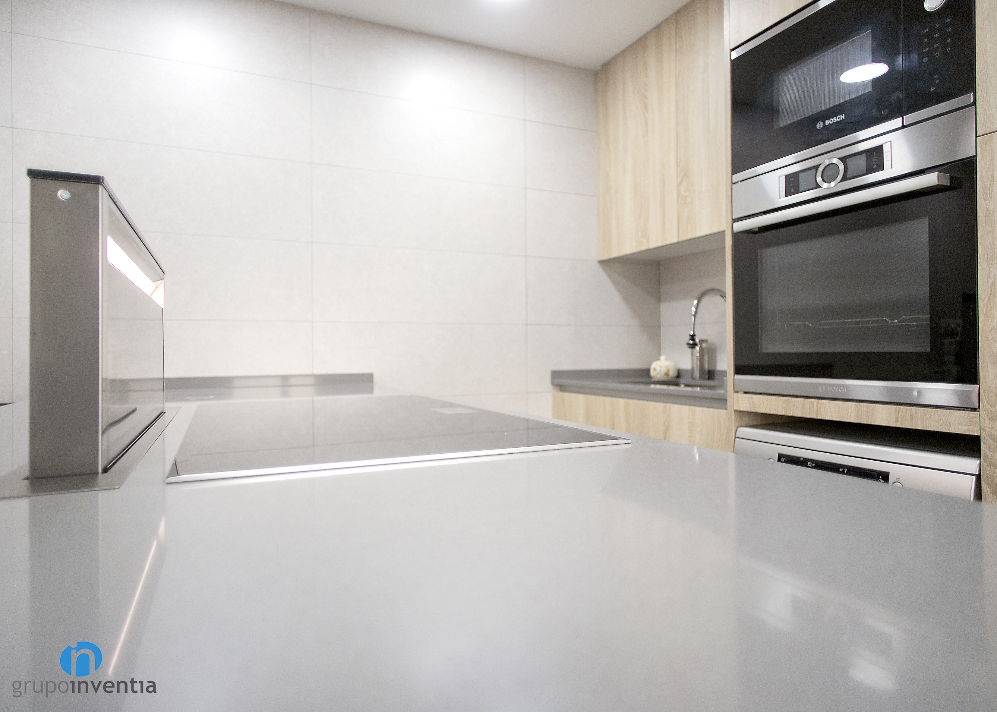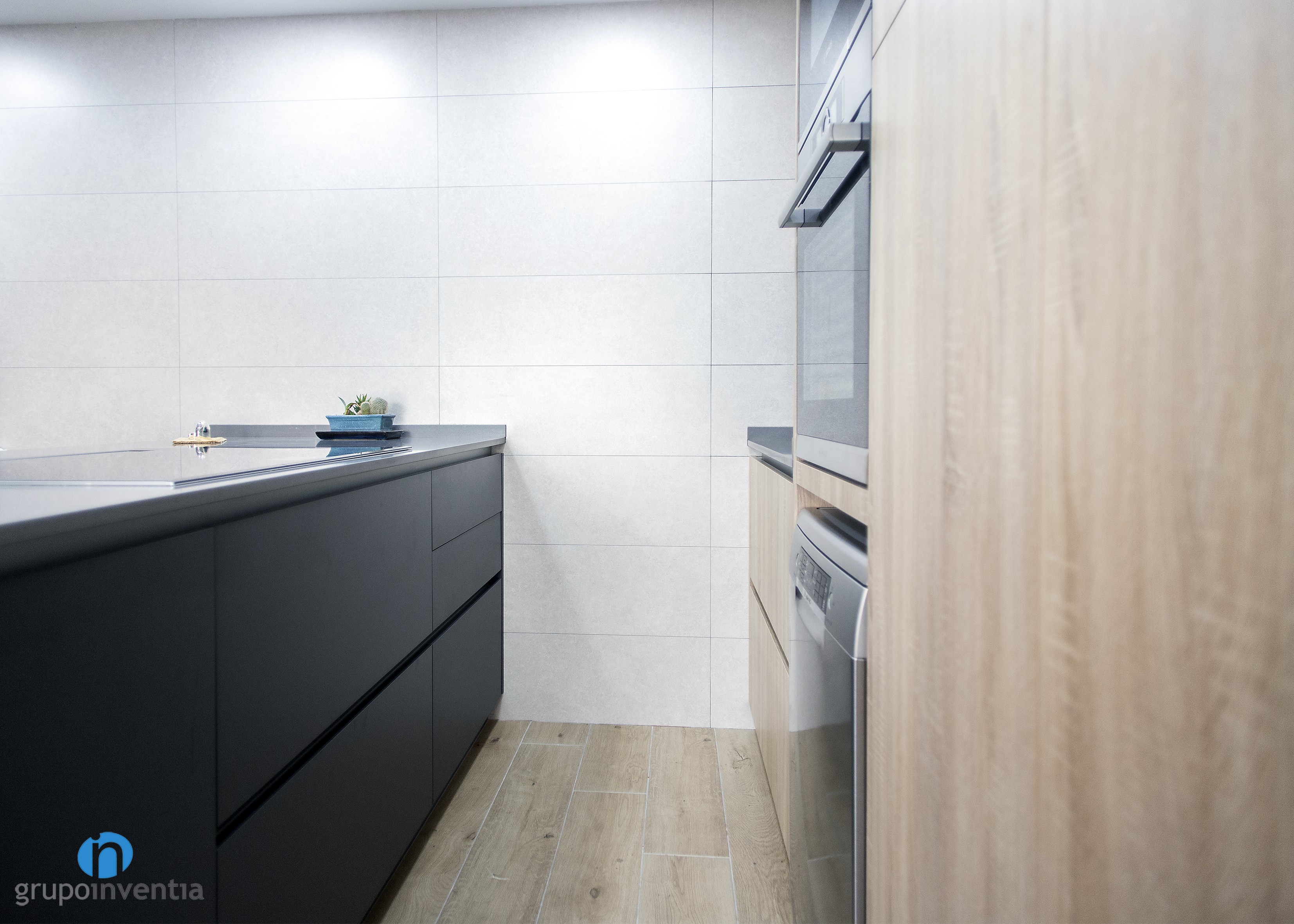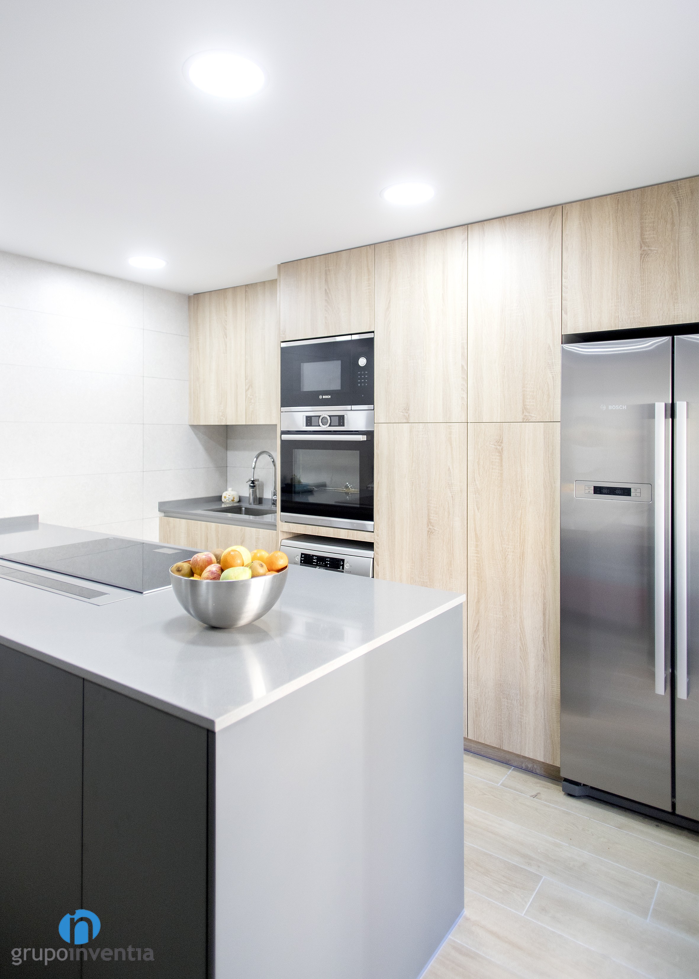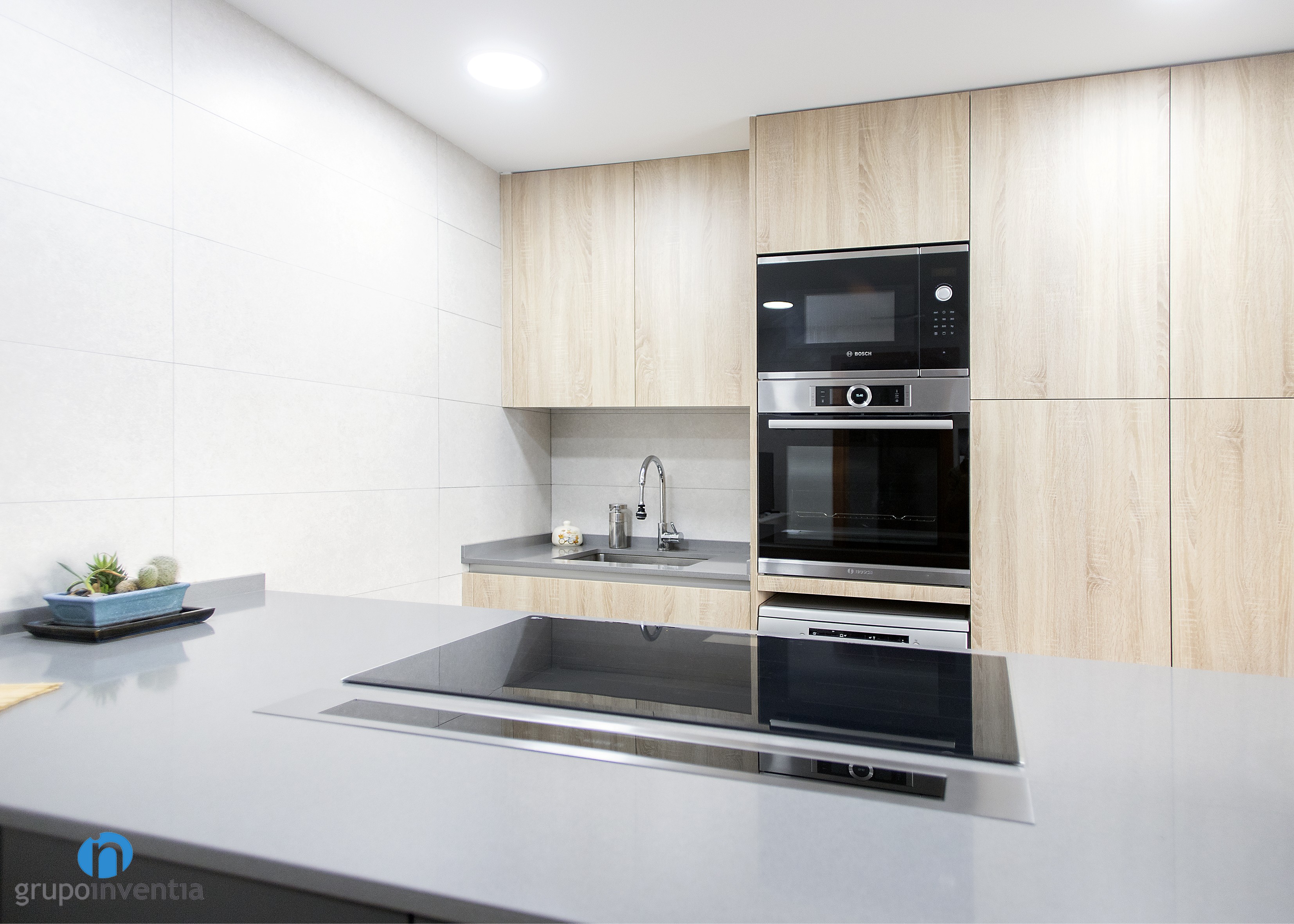 Per a la nova imatge de la reforma de cuina es va apostar per tonalitats neutres que generessin un espai ampli i lluminós, amb una atmosfera perfecta per al dia a dia. Per a això, el moble de cuina es presenta amb acabats en fusta i es combina amb els taulells grisos. Per al paviment es van escollir rajoles que imiten l’acabat en fusta.