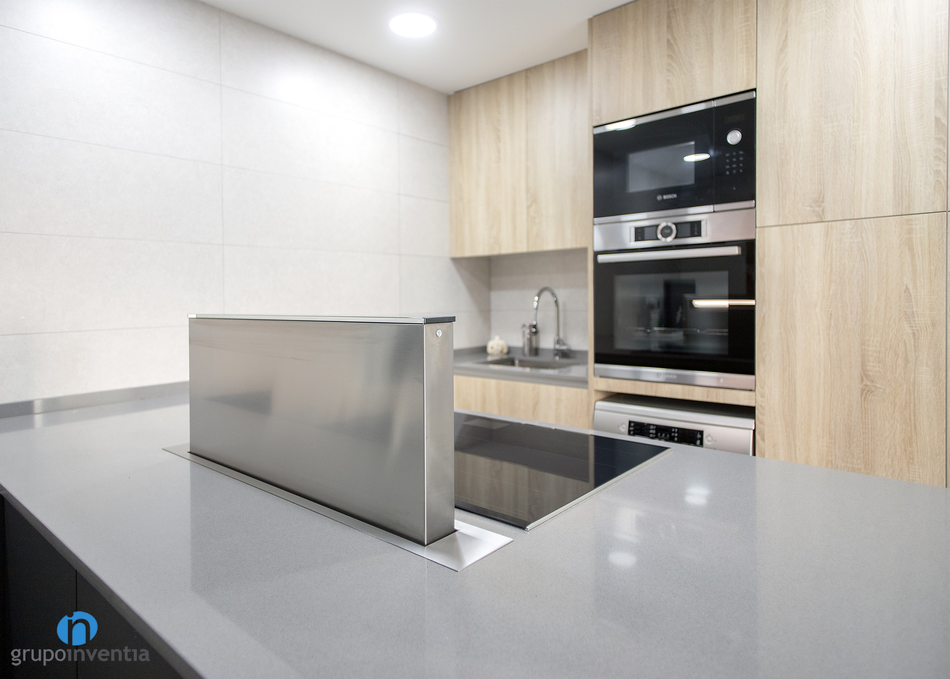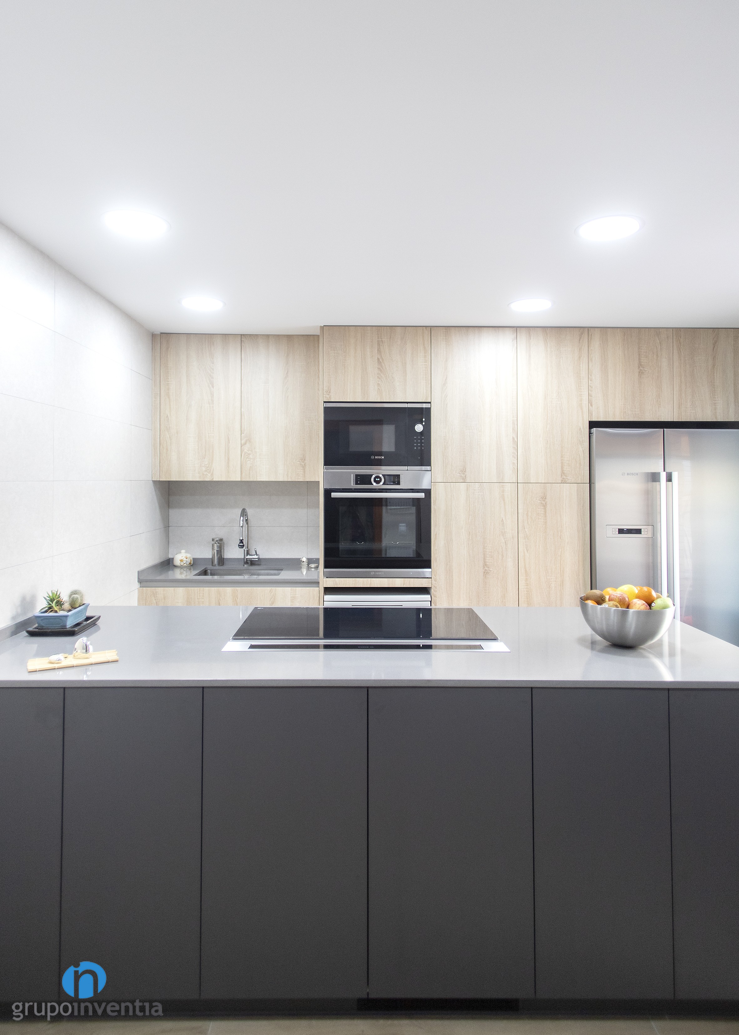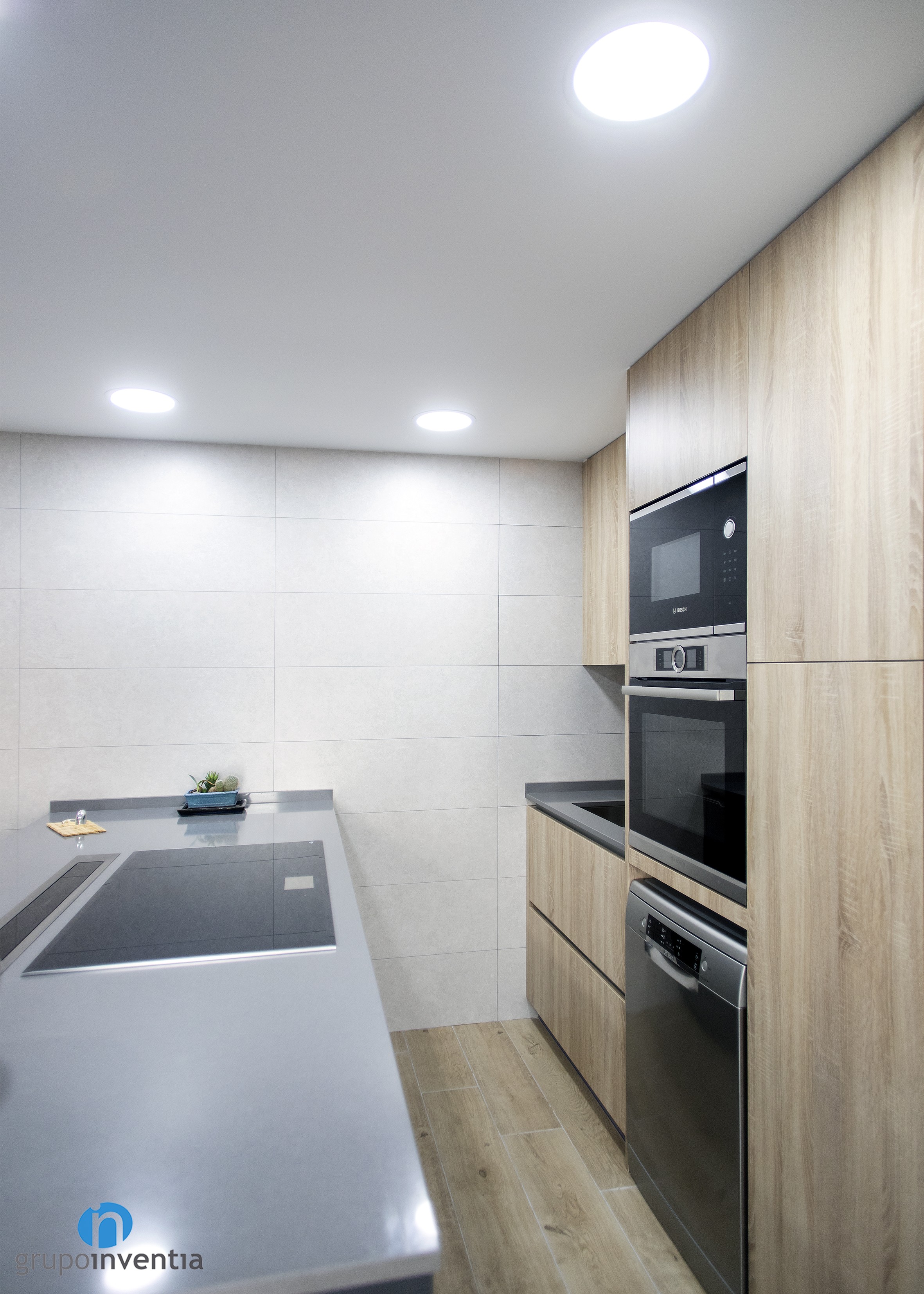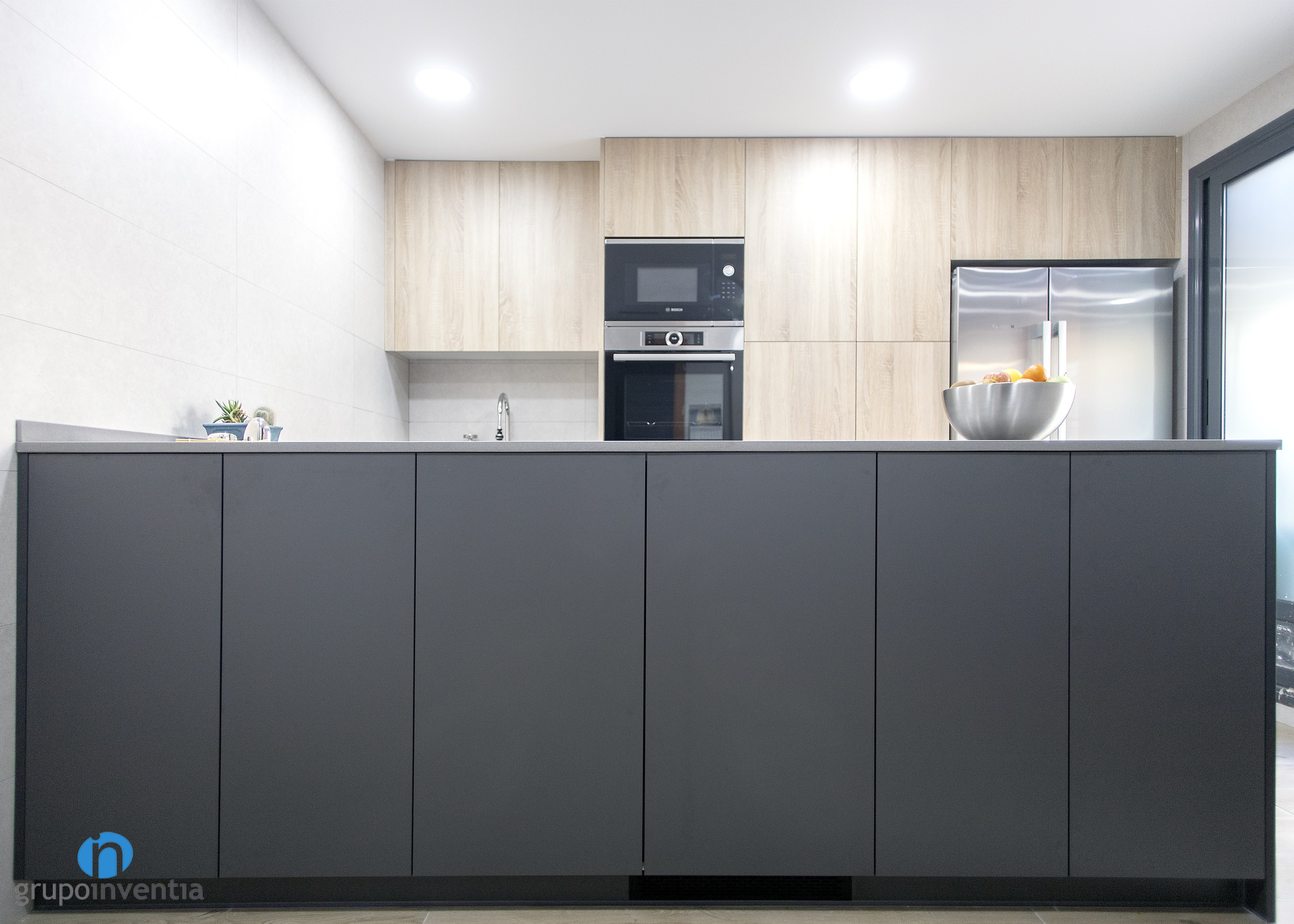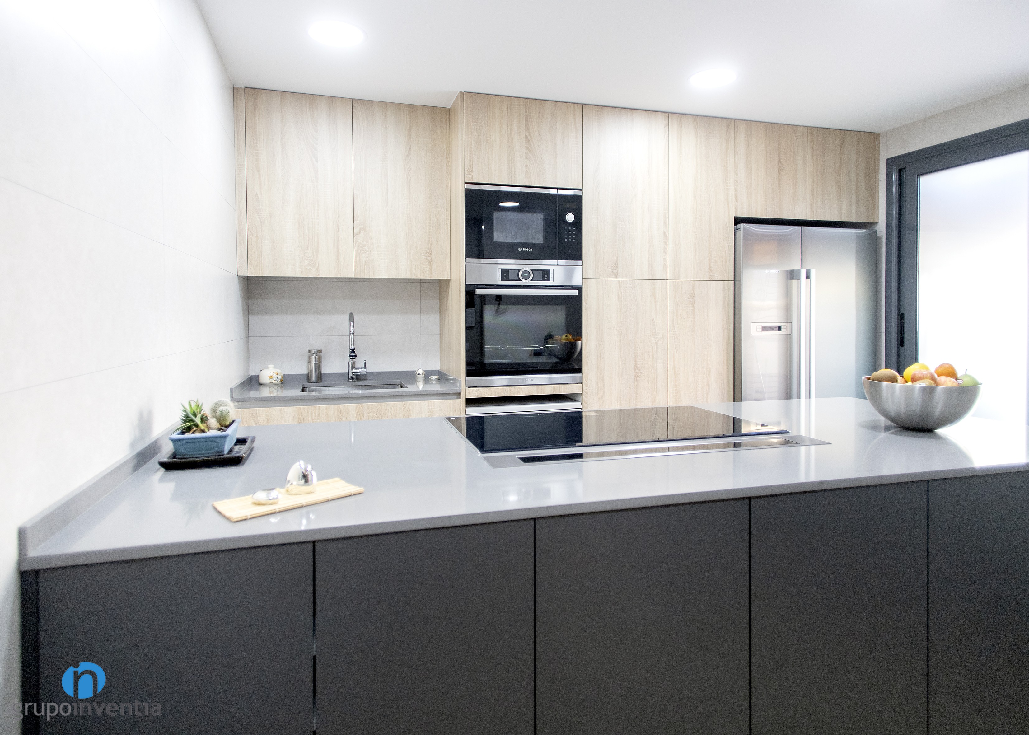 Per a la nova imatge de la reforma de cuina es va apostar per tonalitats neutres que generessin un espai ampli i lluminós, amb una atmosfera perfecta per al dia a dia. Per a això, el moble de cuina es presenta amb acabats en fusta i es combina amb els taulells grisos. Per al paviment es van escollir rajoles que imiten l’acabat en fusta.