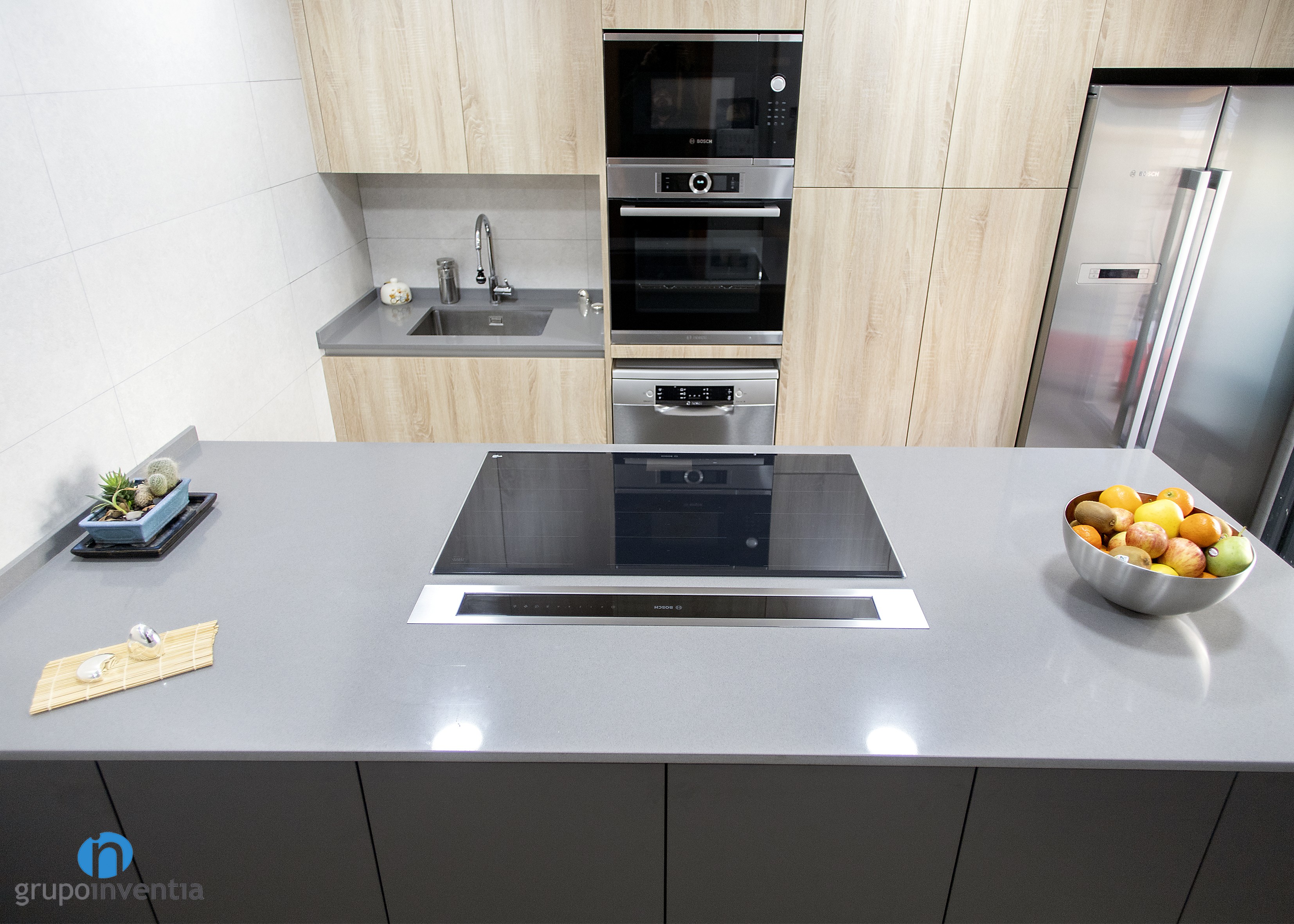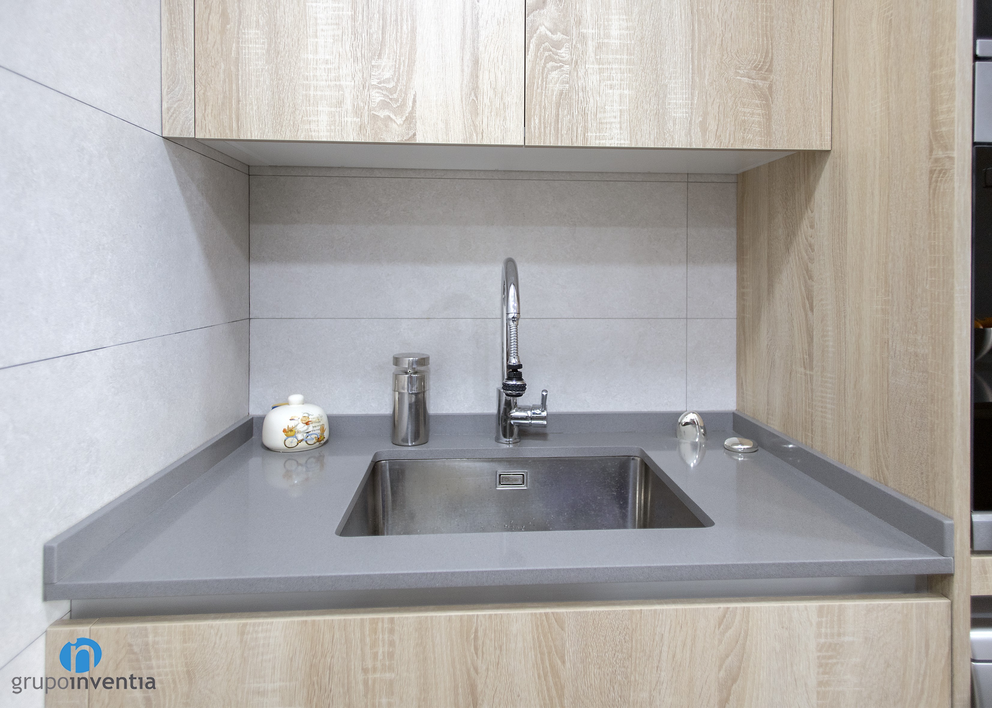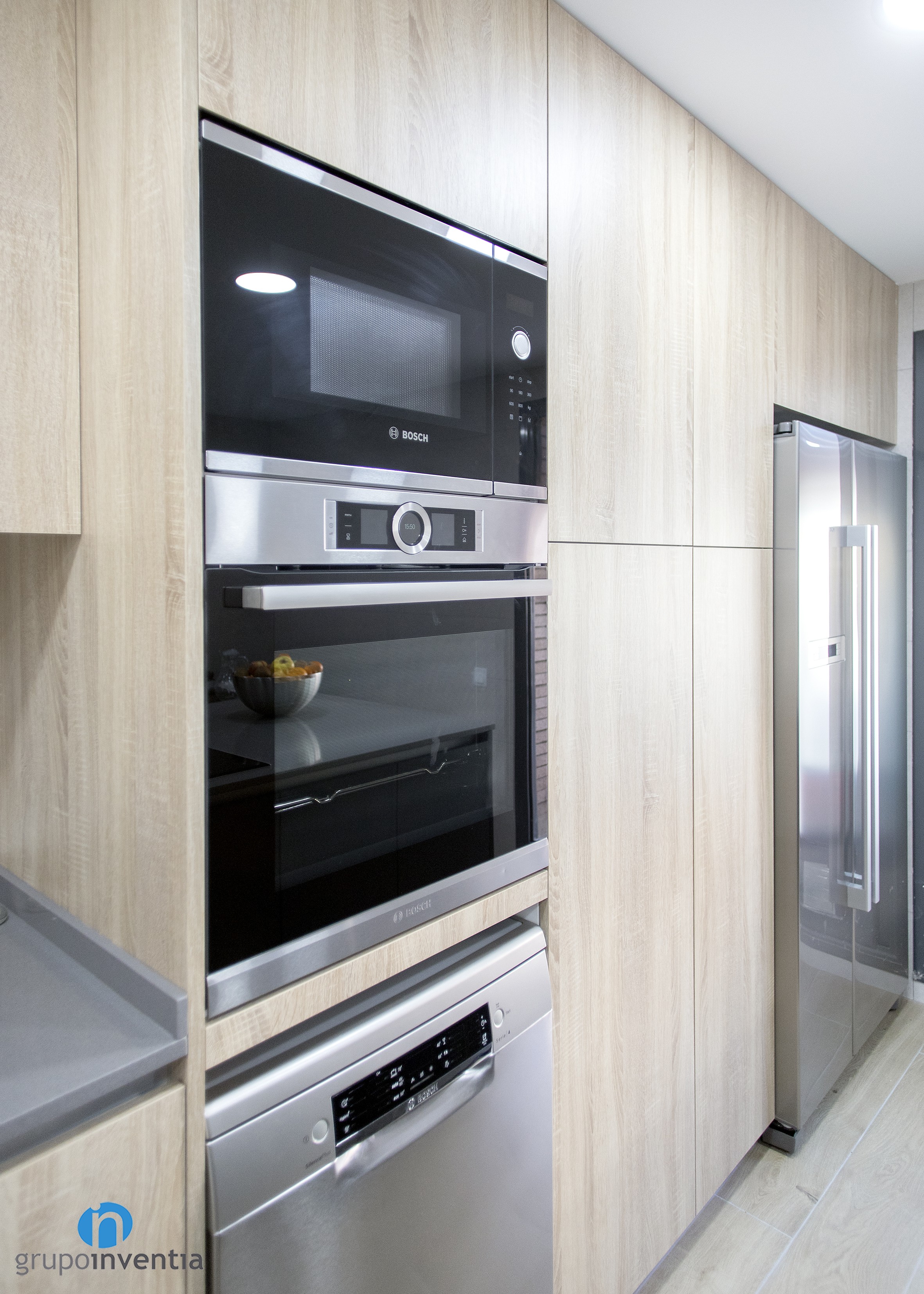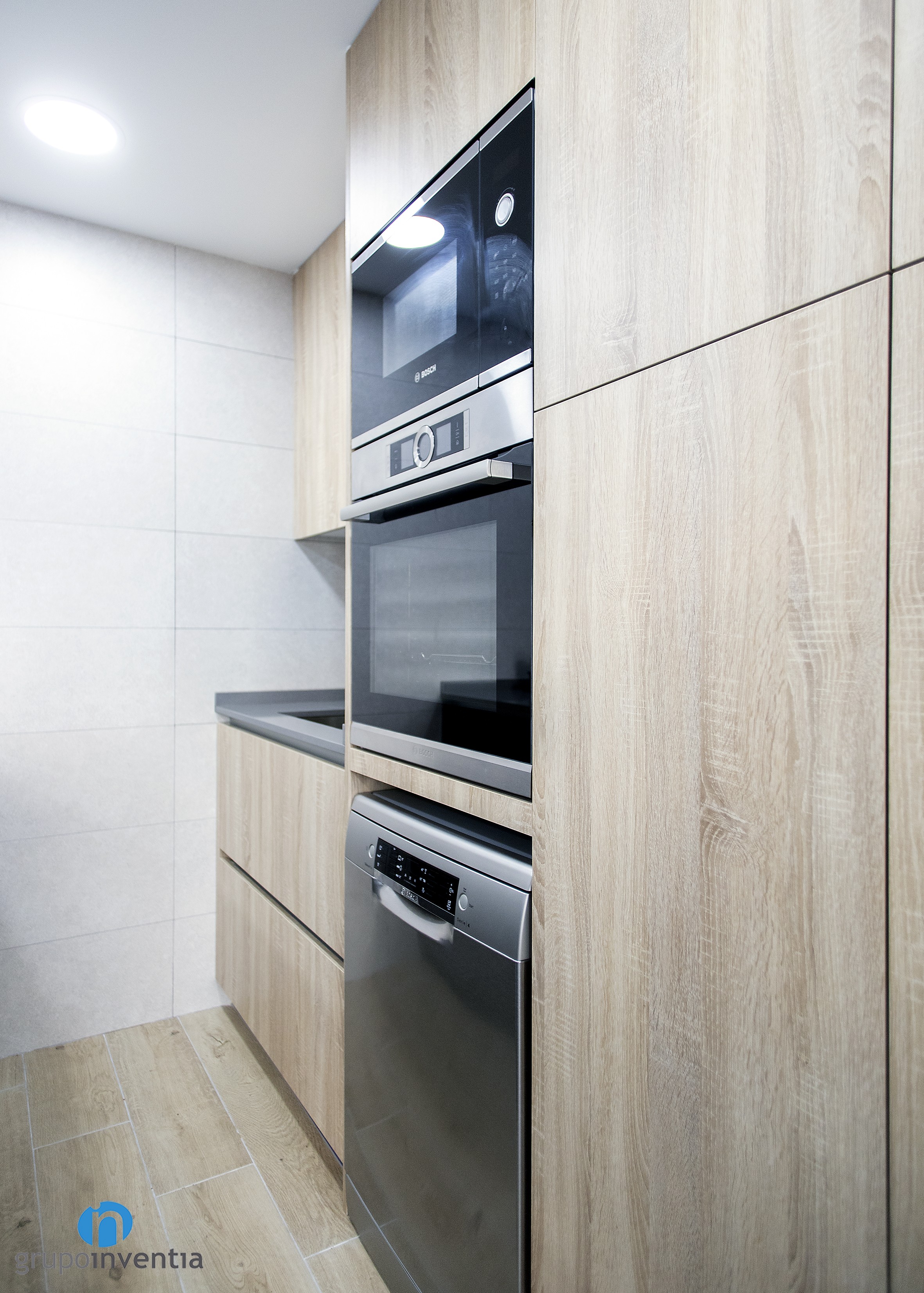 Per a la nova imatge de la reforma de cuina es va apostar per tonalitats neutres que generessin un espai ampli i lluminós, amb una atmosfera perfecta per al dia a dia. Per a això, el moble de cuina es presenta amb acabats en fusta i es combina amb els taulells grisos. Per al paviment es van escollir rajoles que imiten l’acabat en fusta.