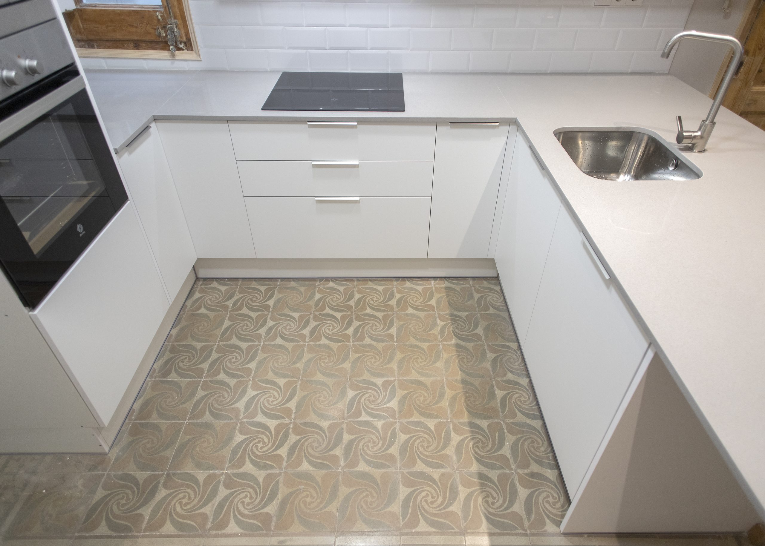 Una reforma de cuina en la qual el color blanc és el protagonista, ja que s’ha utilitzat tant en el moble de cuina com en els taulells, a més de les rajoles bisellades amb els quals s’ha enrajolat la paret.