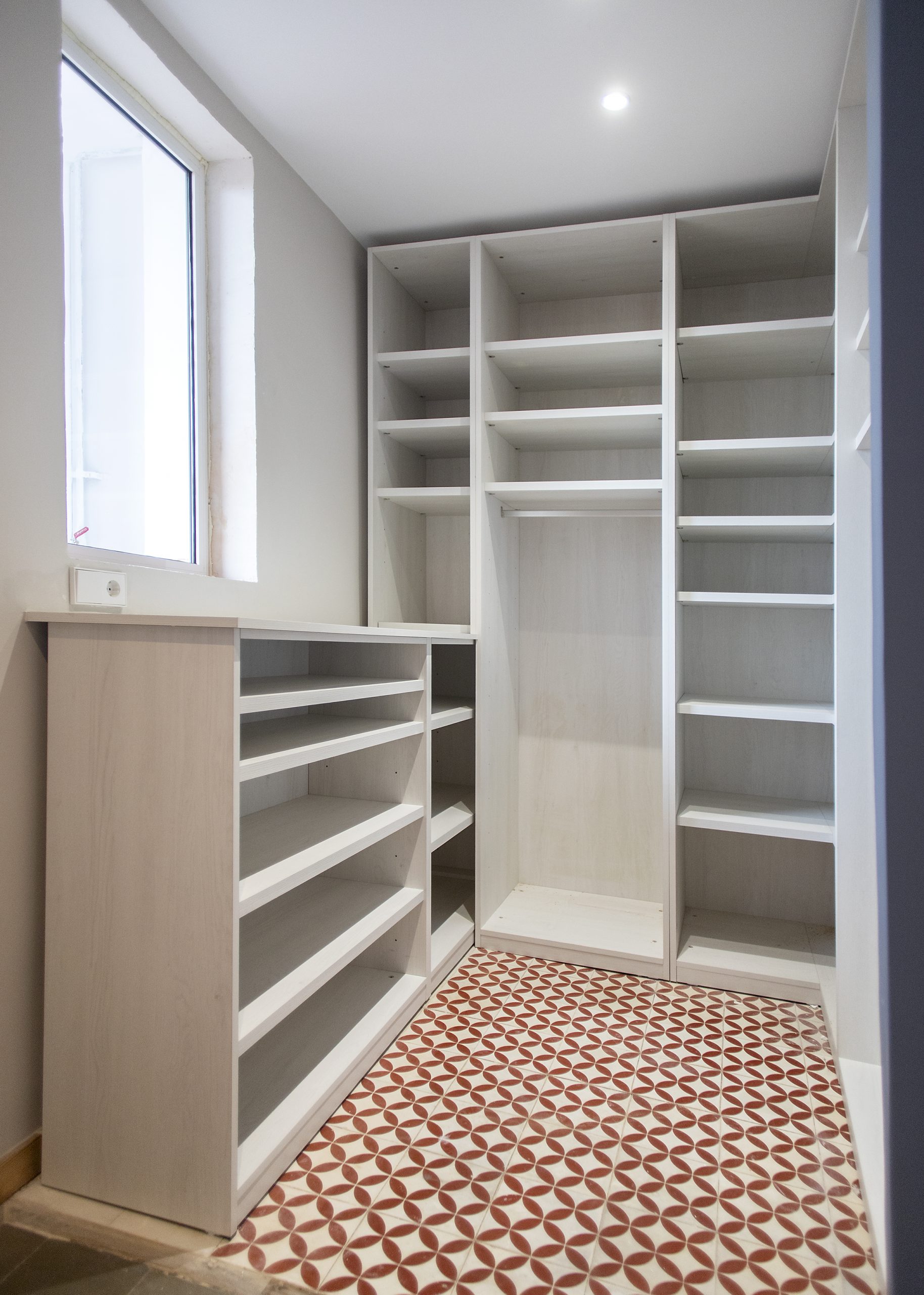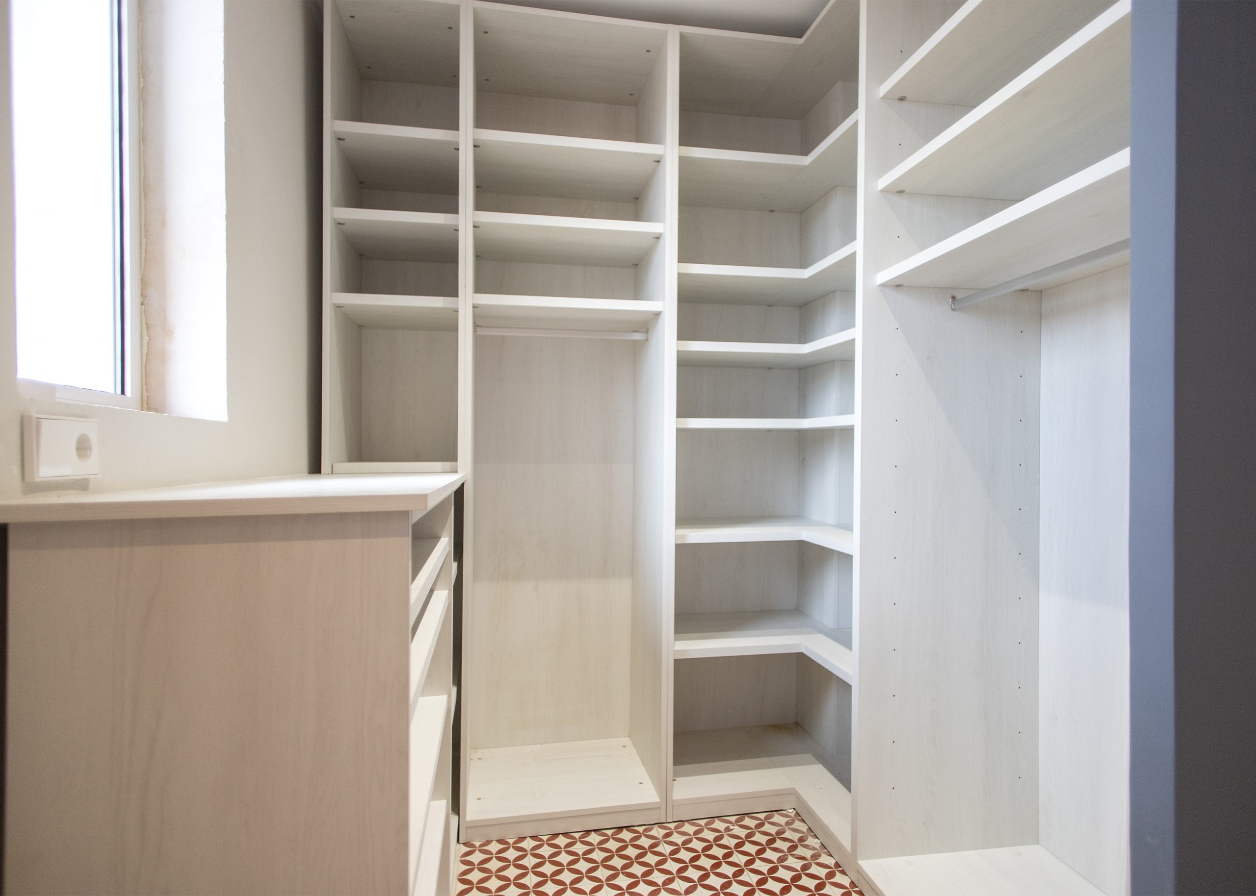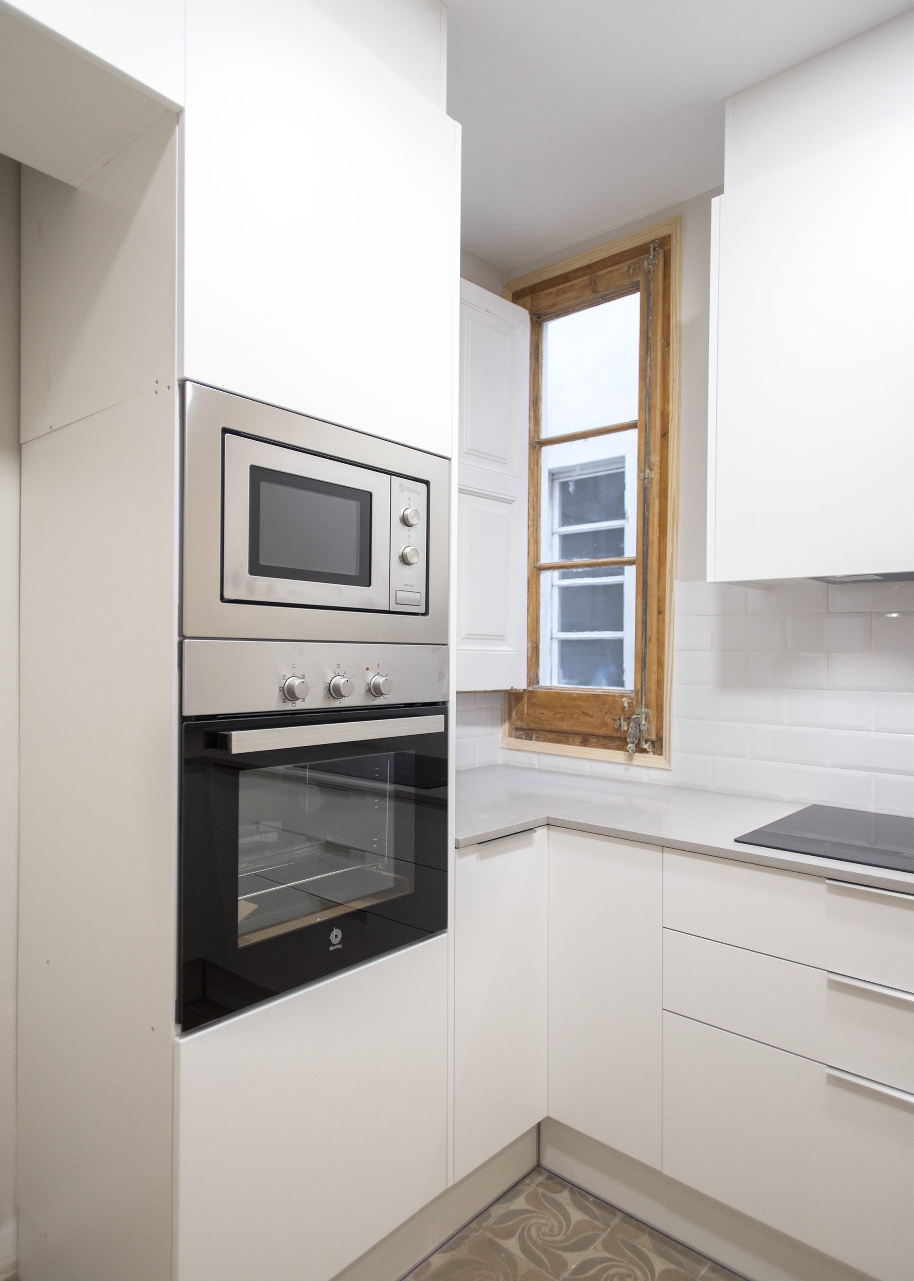 A l’extrem de la banda esquerra hi ha buits a mida per a encastar la nevera, el forn i el microones. A la perte central apareix un primer tram de taulell equipat amb la placa vitroceràmica i en el bordo dret, l’obert, un segon tram de taulell que pot utilitzar-se com barra d’esmorzar i que compta amb la pica.