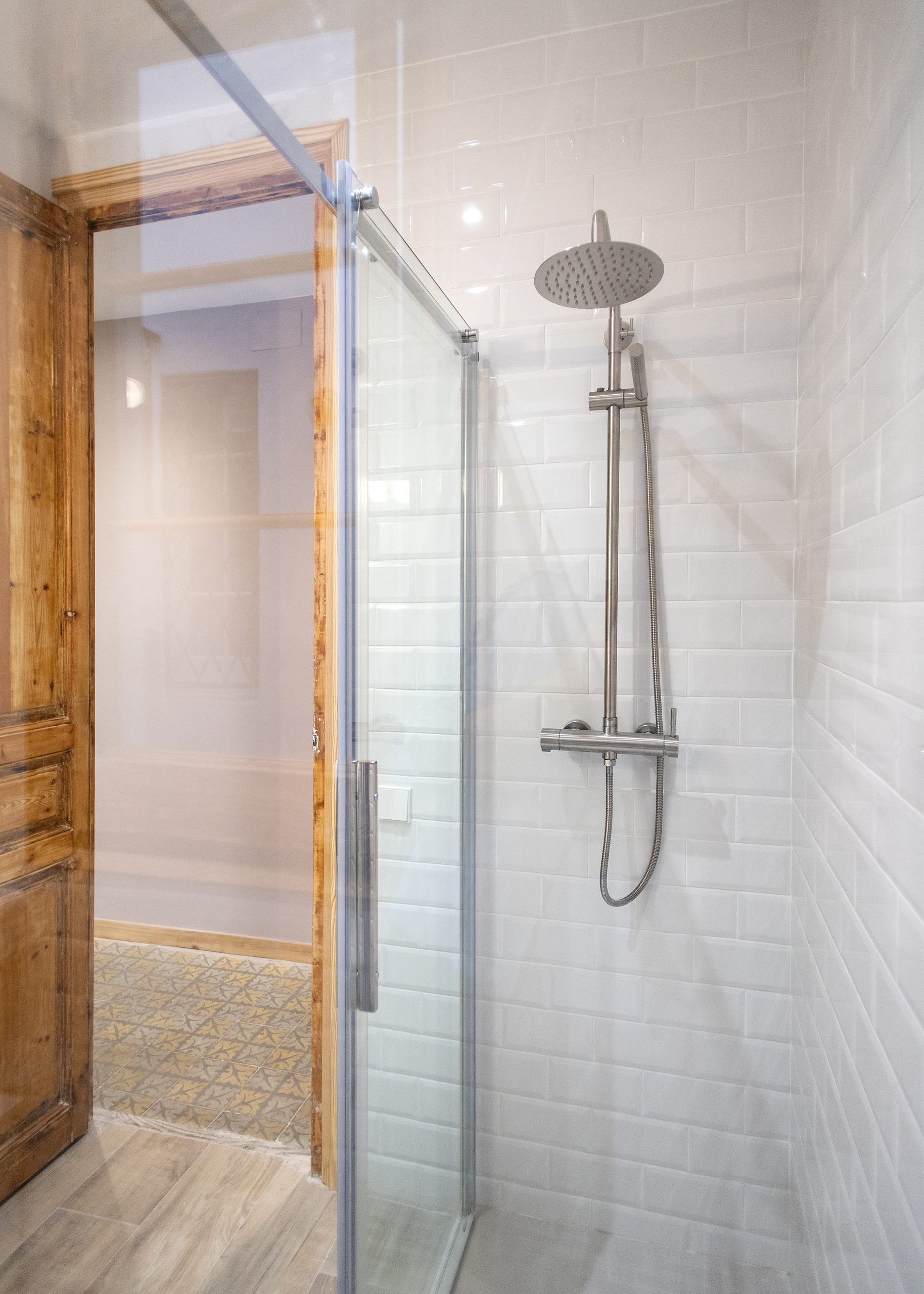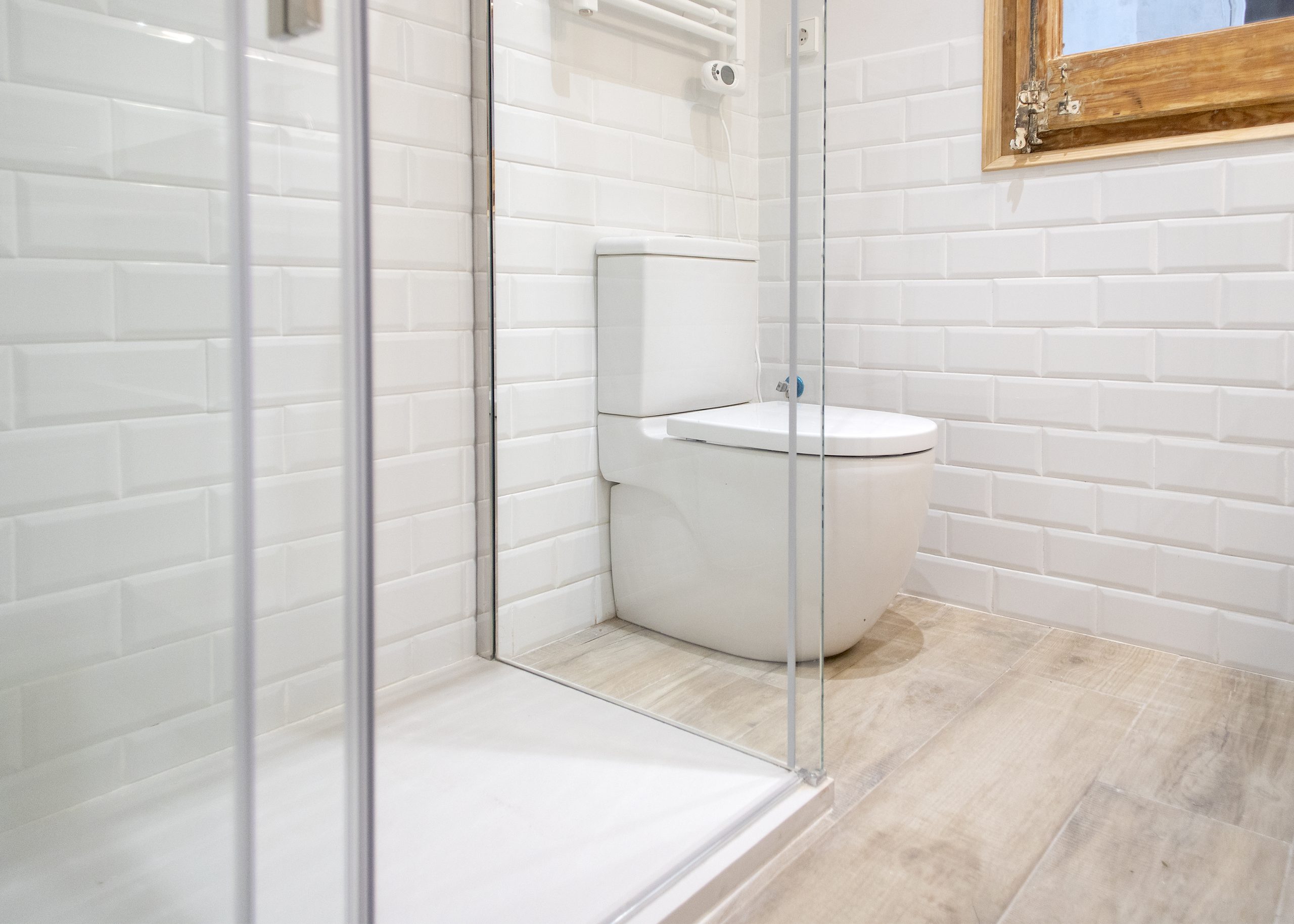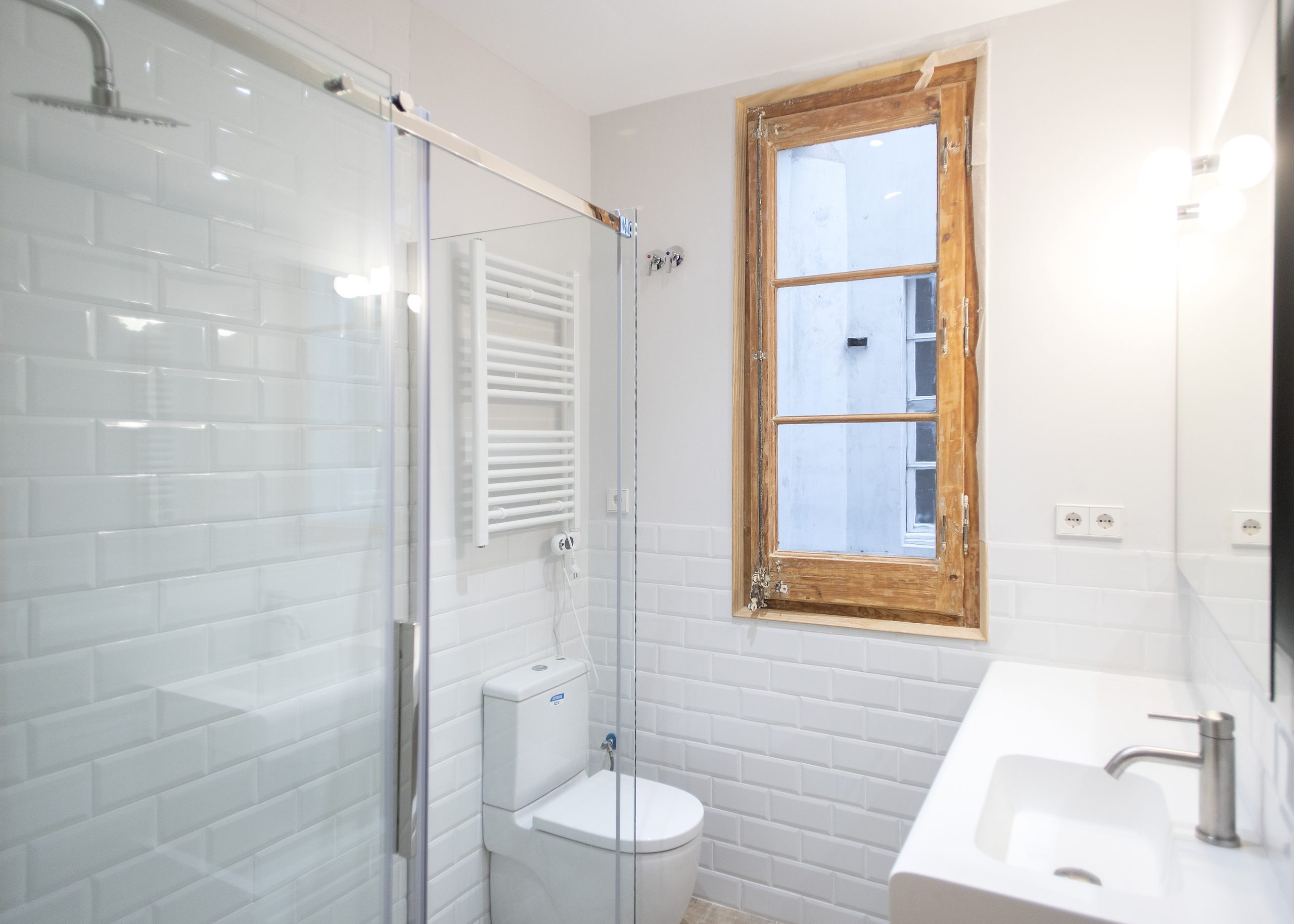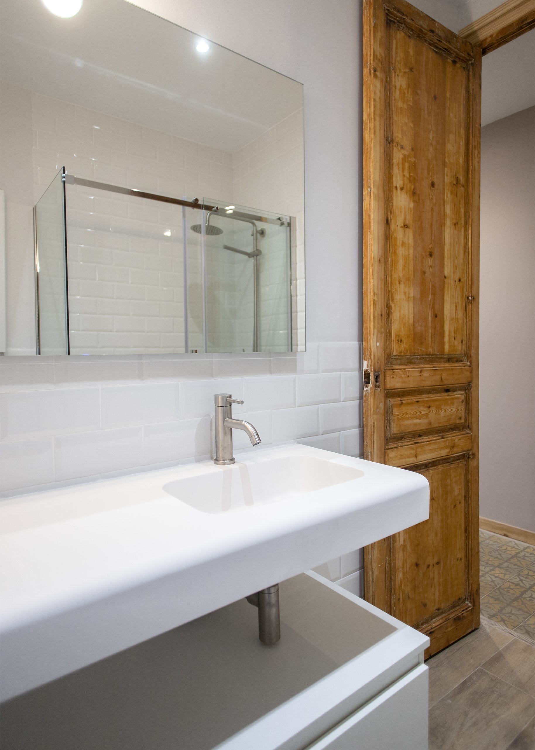 La cambra de bany es situa en un espai ampli i lluminós. En ell s’ha aplicat o disseny modern, s’enrajola les parets a mitja açada amb rajoles bisellades blanques. També destaca el nou paviment, per al qual es van utilitzar rajoles que imiten l’acabat en fusta. Una decisió perfecta tant a nivell visual com en el del manteniment.