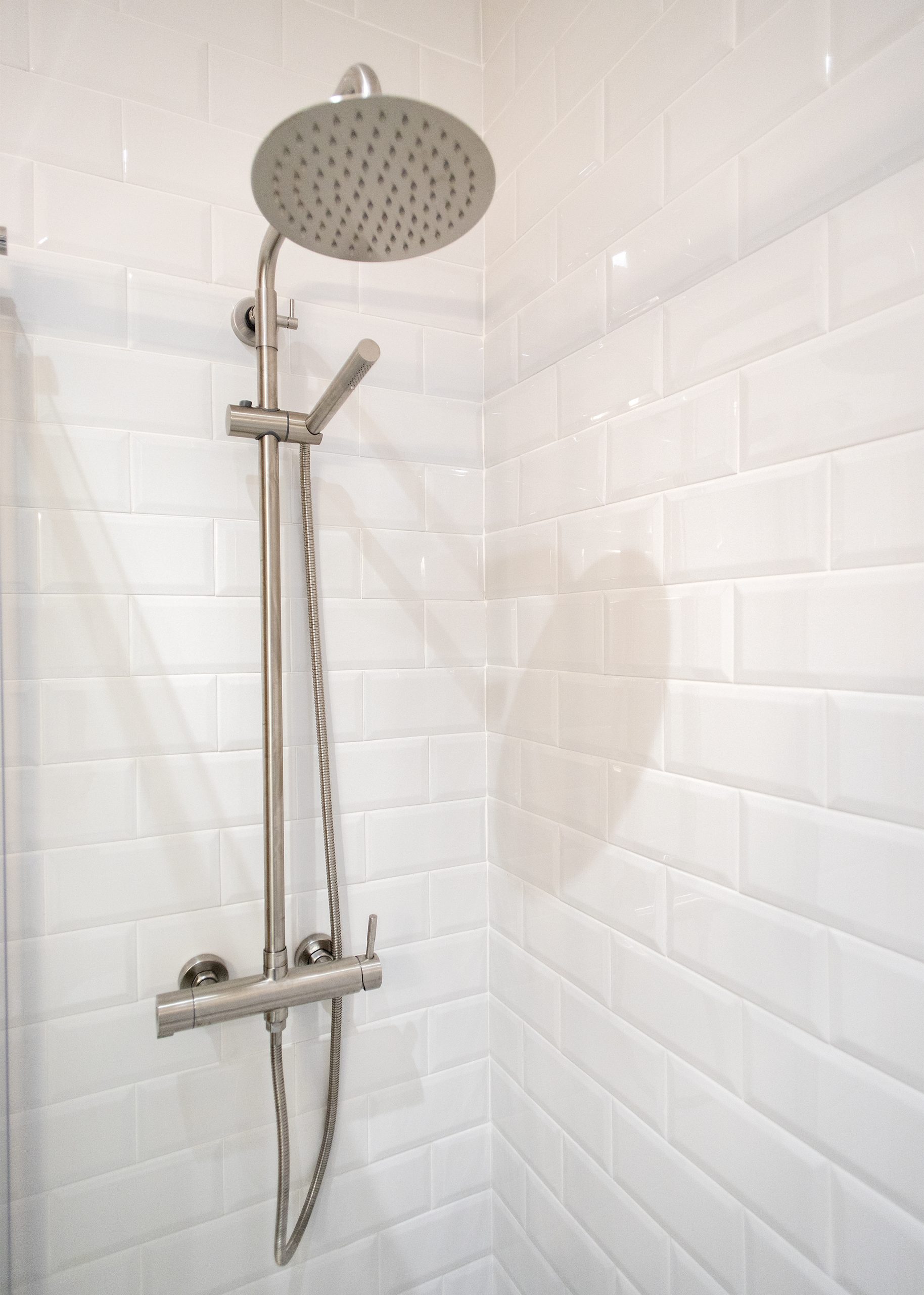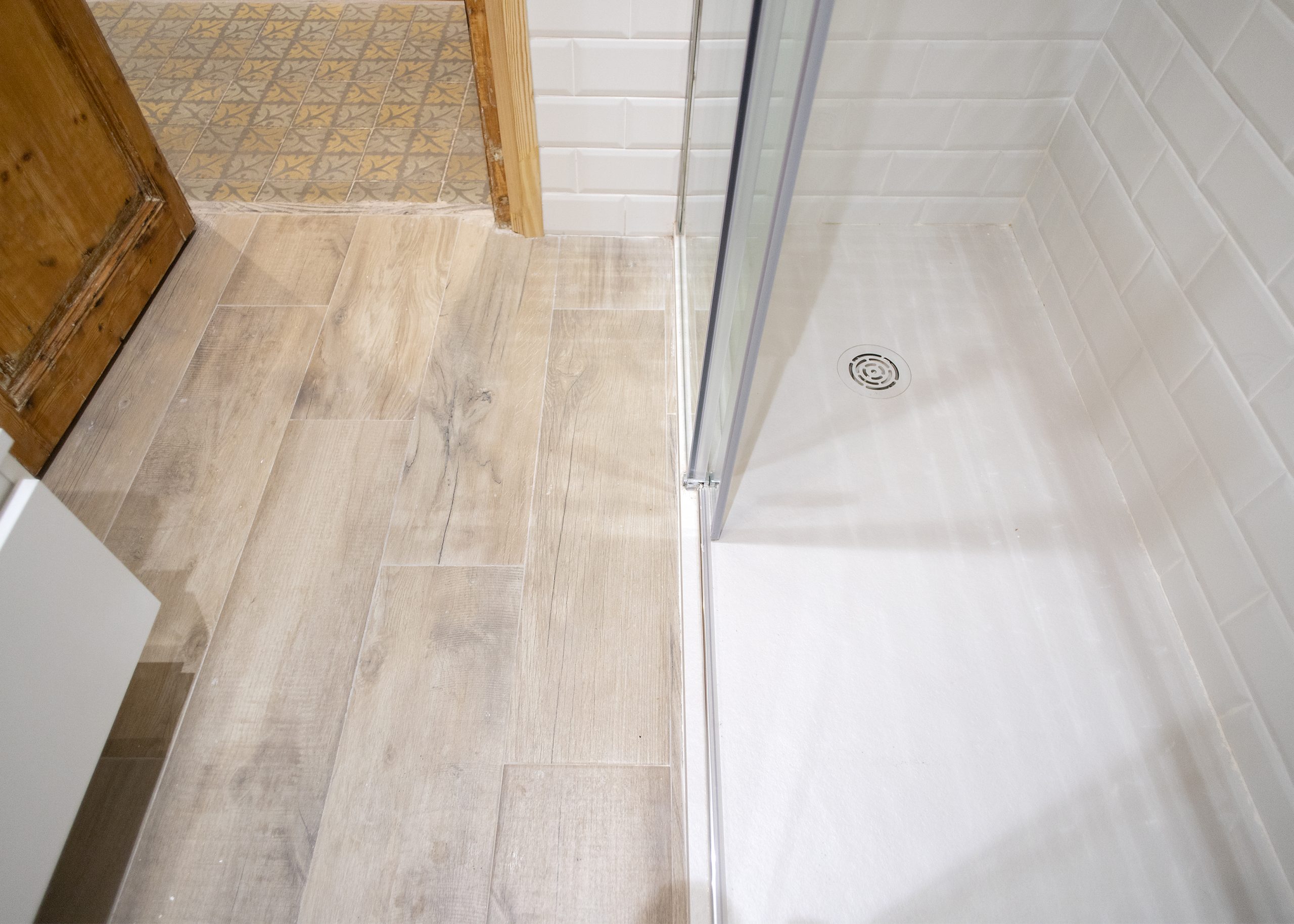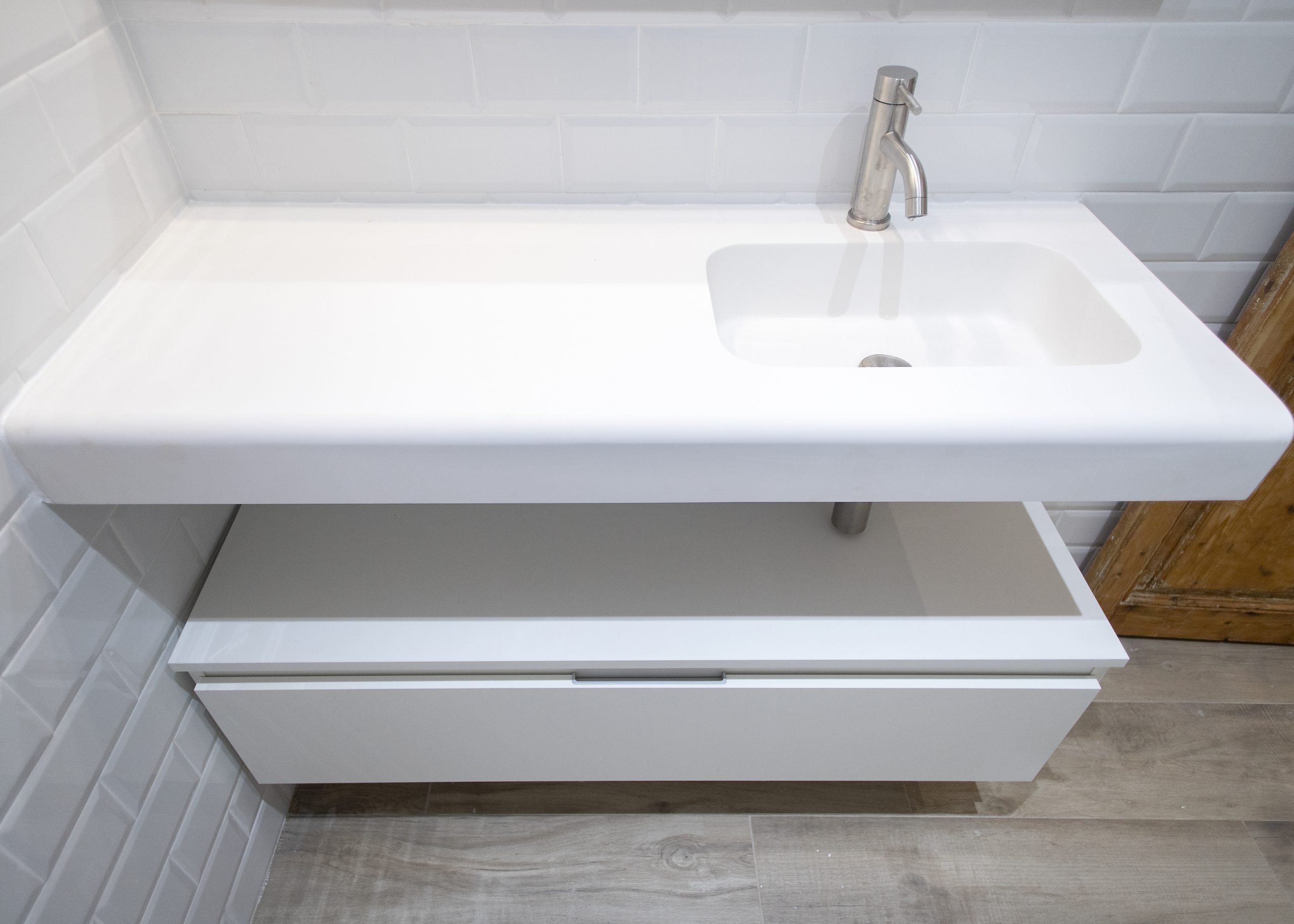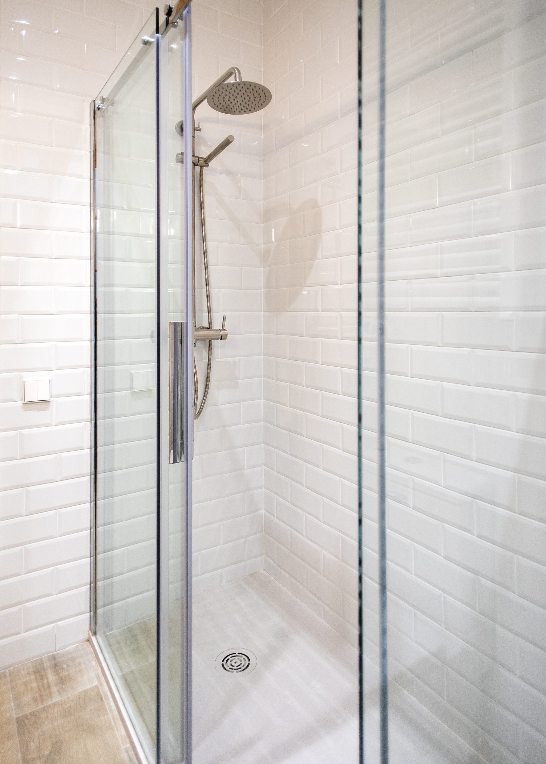 La cambra de bany es situa en un espai ampli i lluminós. En ell s’ha aplicat o disseny modern, s’enrajola les parets a mitja açada amb rajoles bisellades blanques. També destaca el nou paviment, per al qual es van utilitzar rajoles que imiten l’acabat en fusta. Una decisió perfecta tant a nivell visual com en el del manteniment.