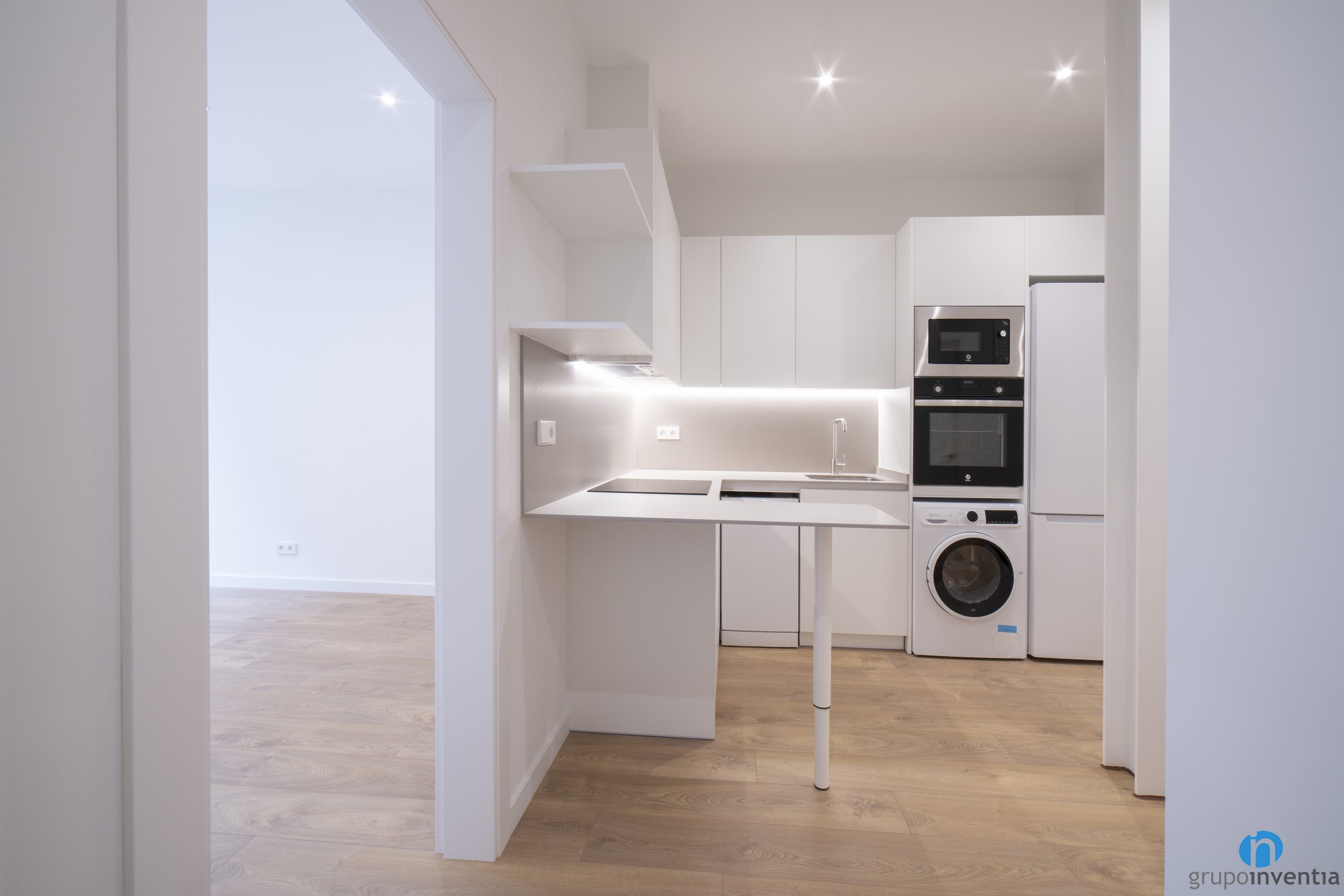 La cuina és dels primers espais que ens trobem ja que és just a l’entrada de l’habitatge. En aquest cas es tracta d’una cuina oberta i ens hem encarregat de redistribuir per aconseguir més mobilitat i una ubicació més funcional als seus nous elements. D’aquesta manera, hem fet servir una distribució de cuina a U.
