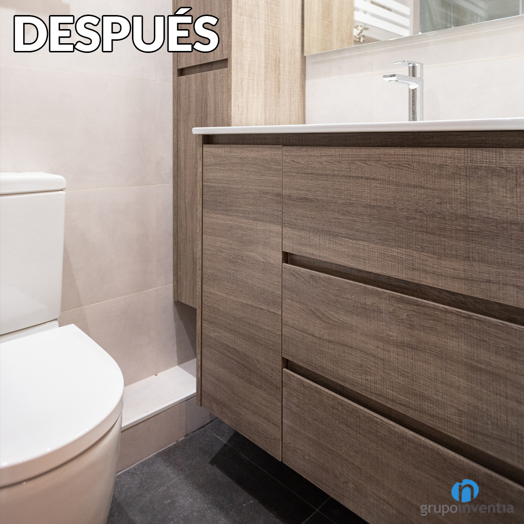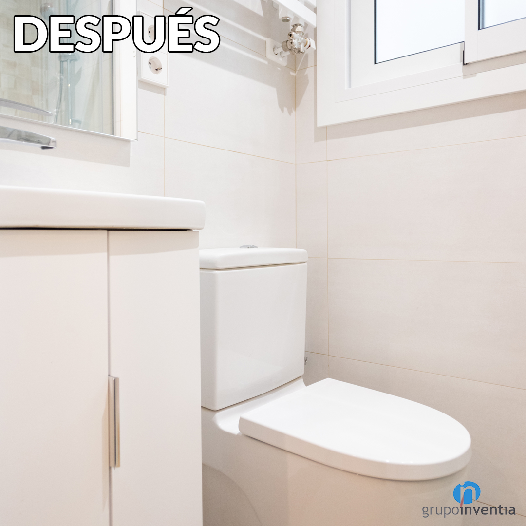 La imatge original de les cambres de bany necessitava un rentat de cara i s’ha canviat tot l’enrajolat de la paret. S’ha passat d’uns rajoles quadrats de color blanc a enrajolar les parets amb unes rajoles rectangulars amb acabat en beige. Ara el seu disseny interior es presenta molt més lluminós i amb un ambient més fluid.