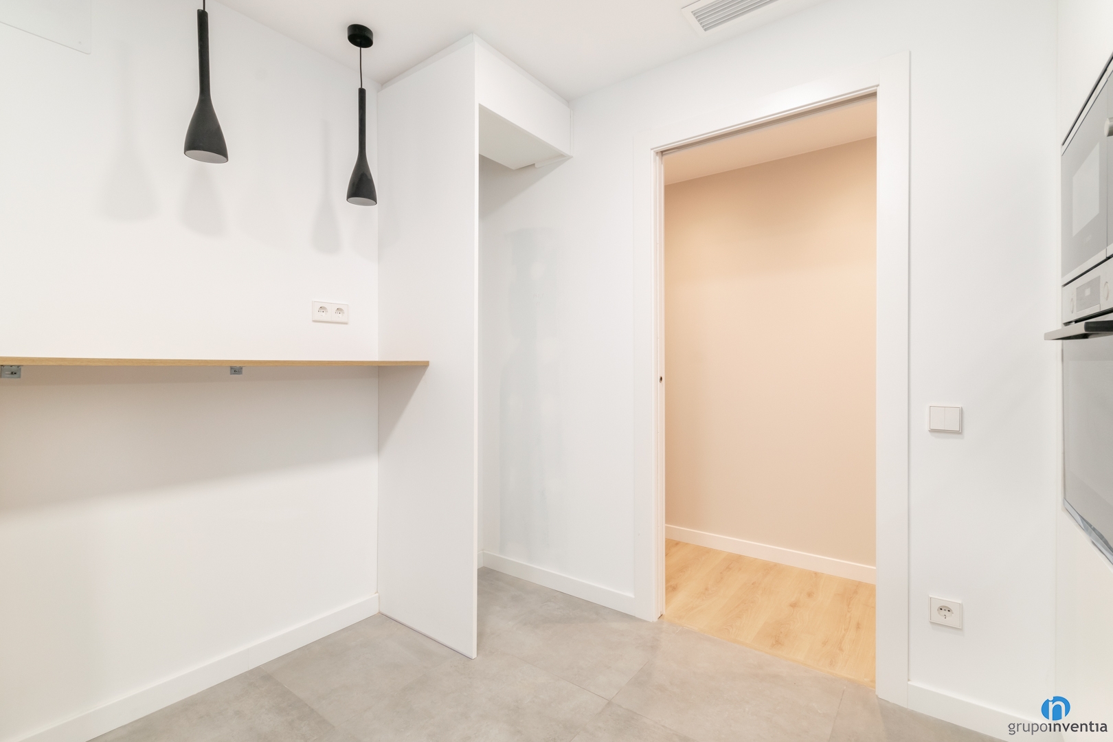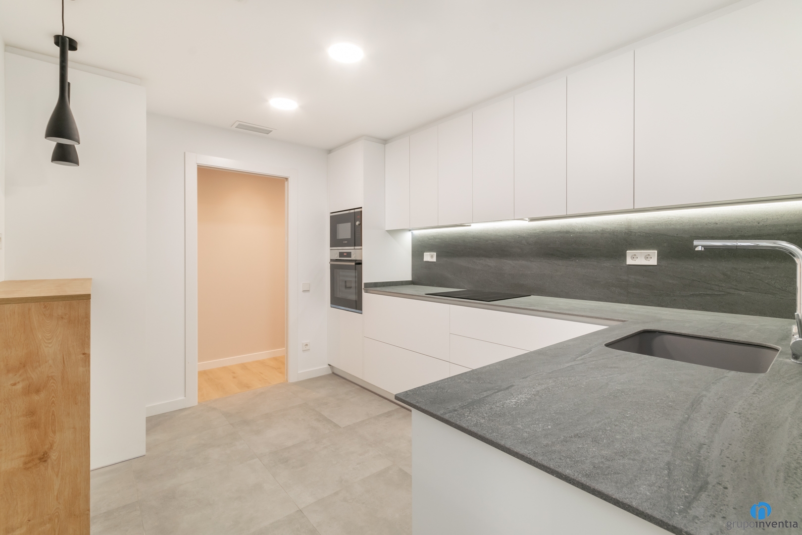 S’hi accedeix a la cuina a través d’una porta corredissa i queda ubicada en un espai propi. El moble de cuina té forma de L i compta amb dos trams de taulell. Tots dos ofereixen superfície de suport i de treball, a més d’estar equipats amb una placa vitroceràmica i una pica integrada.