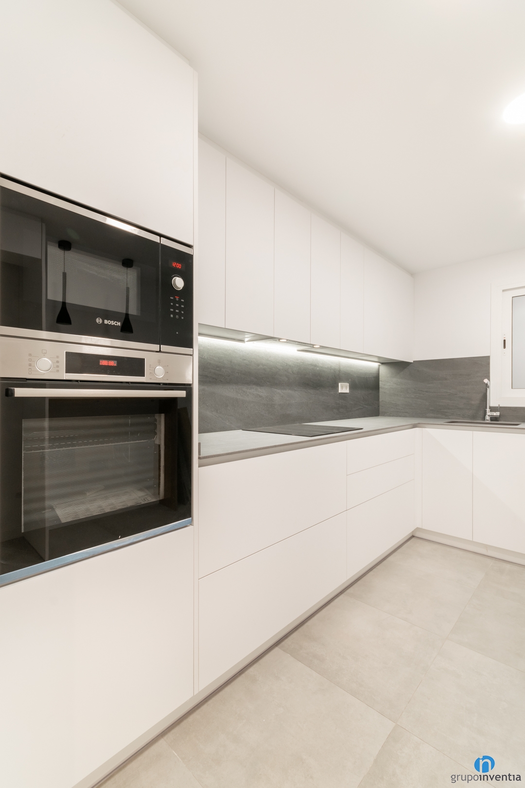 Tot això amb un disseny de cuina acollidor amb mobles blancs i taulells de color gris. Gràcies a aquestes tonalitats aconseguits potenciar la lluminositat a la cuina.