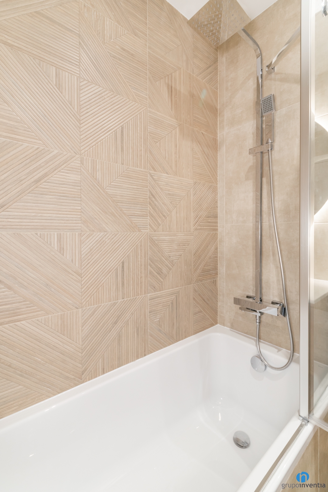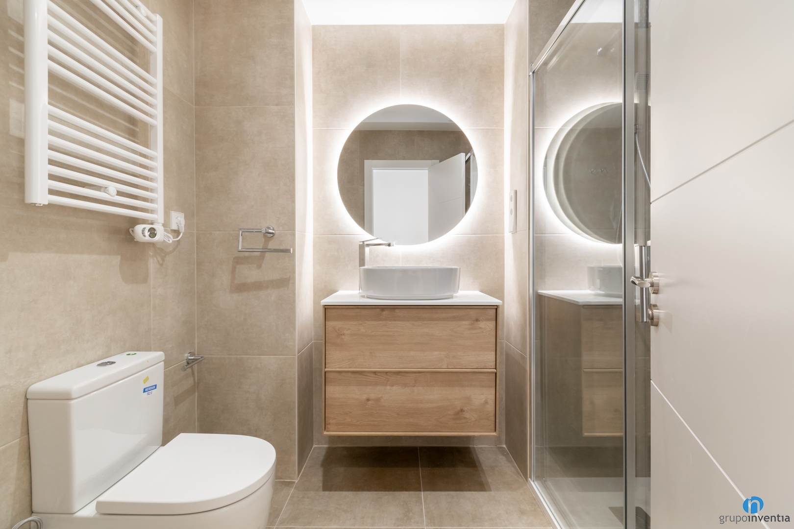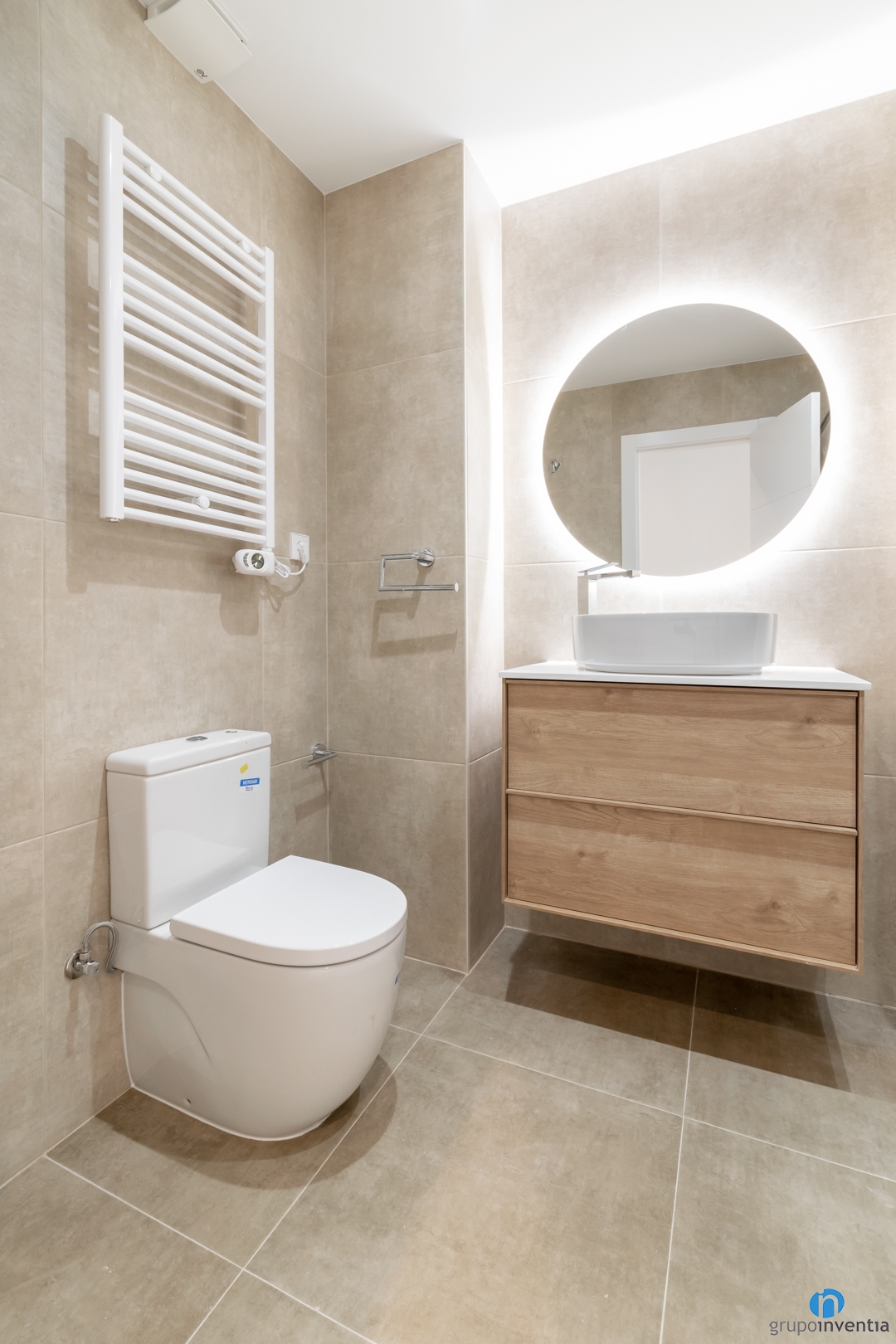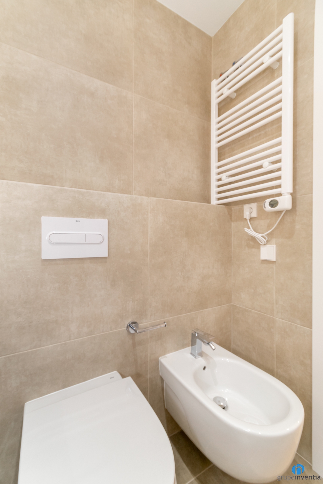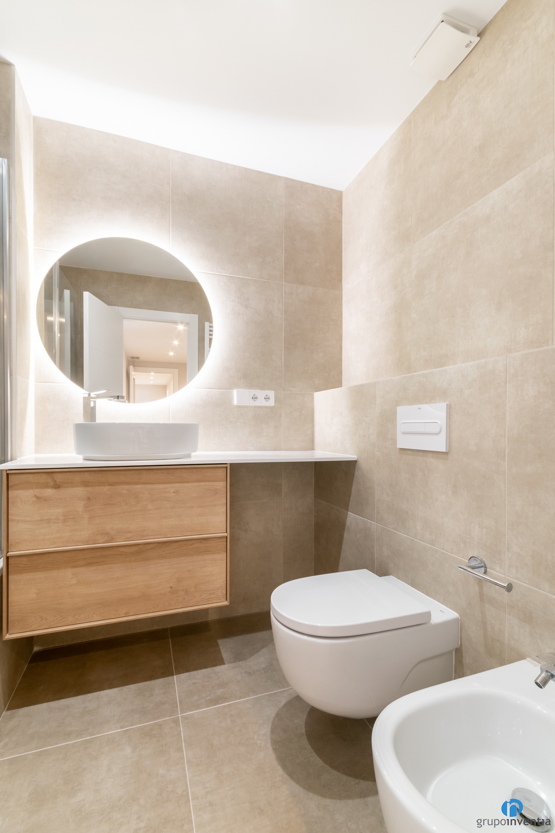 El pis compta amb dos espais de bany complet, un bany de cortesia i un bany suite. Per a cada reforma de bany hem instal·lat tres peces sanitàries. Es componen de lavabo, inodor i zona daigües. Aquest últim element al bany de cortesia és una banyera i al dormitori suite un plat de dutxa. A més, a l’espai de neteja compartit també hi hem instal·lat un bidet.