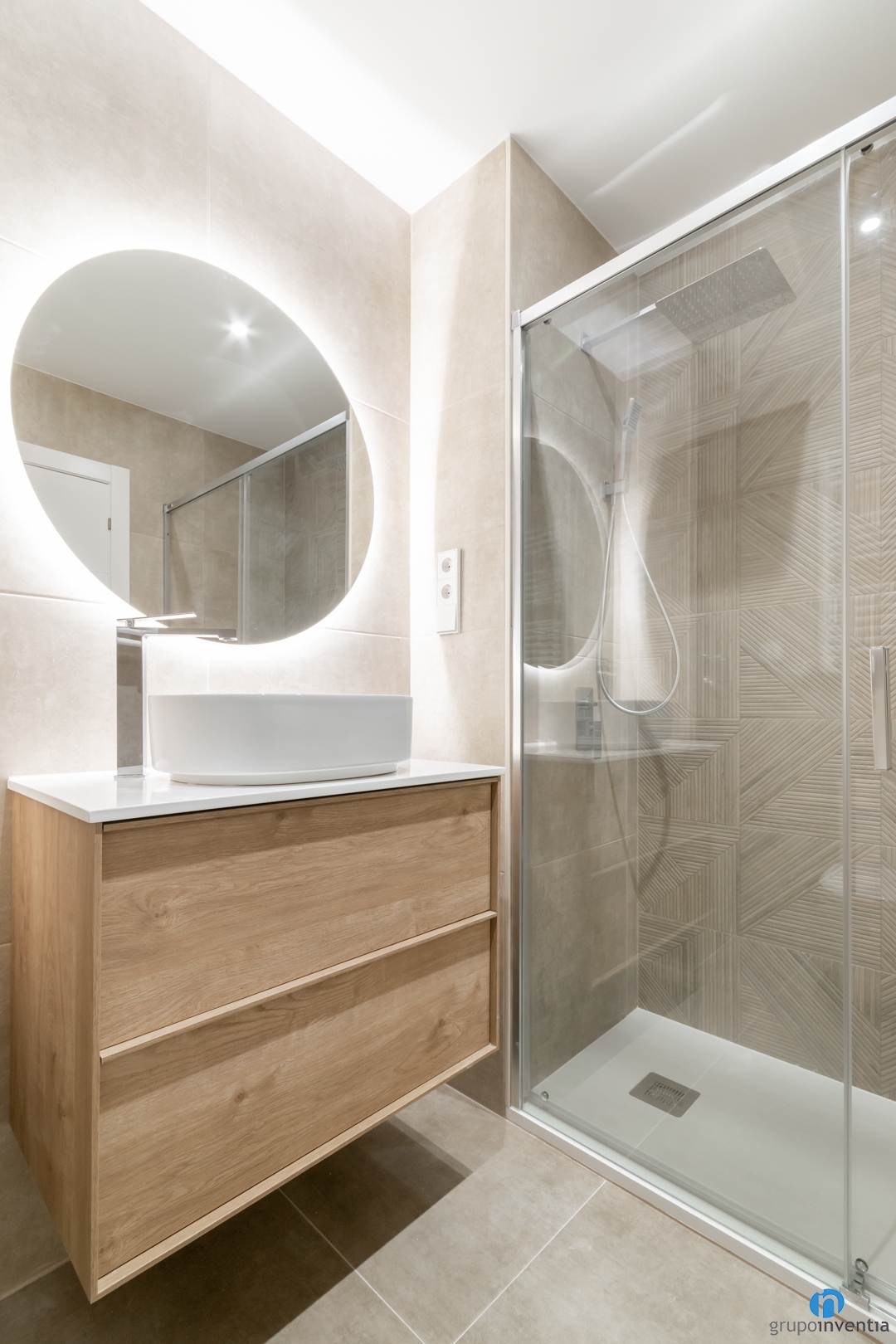 Per disseny de banys hem apostat per un estil contemporani, d’acord amb la imatge global del pis. Hem enrajolat les parets amb rajoles de color beix, igual que les rajoles del paviment. D’aquesta manera hem aconseguit crear una imatge homogènia i un ambient fresc i acollidor als banys.