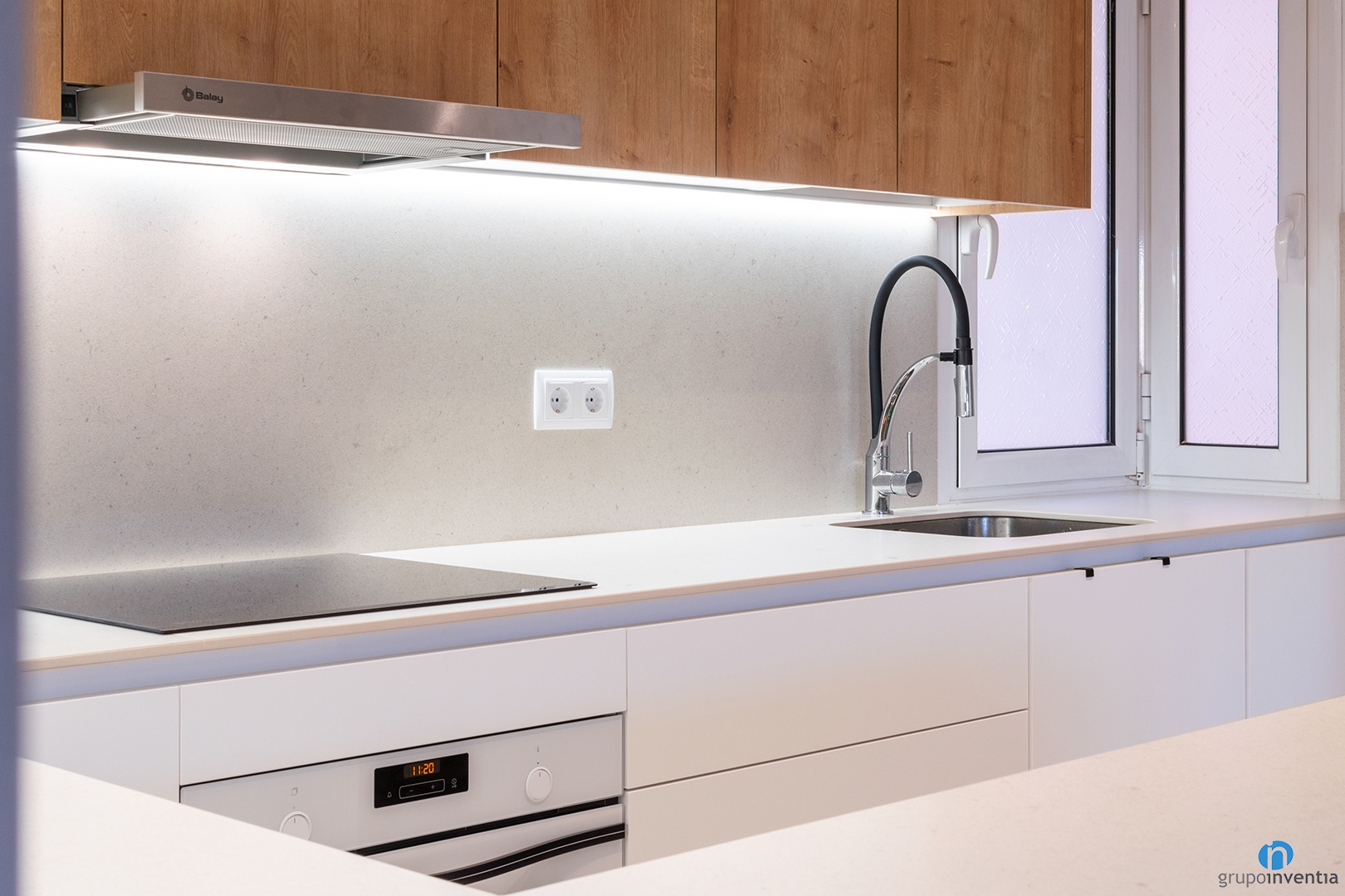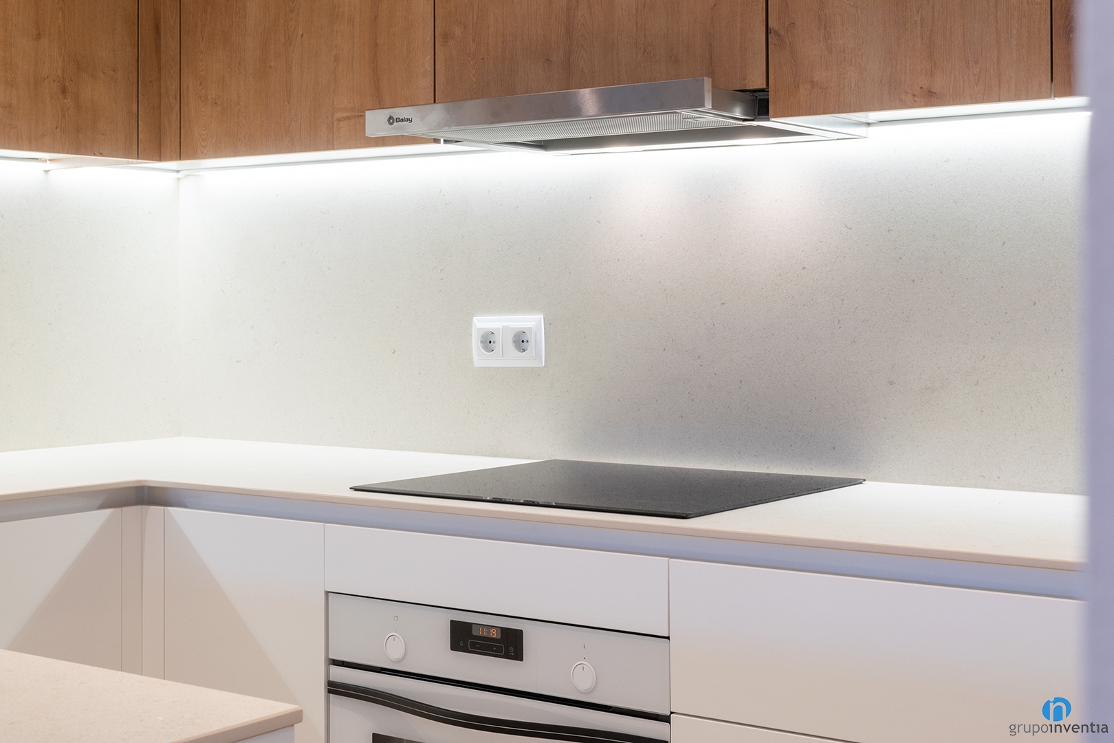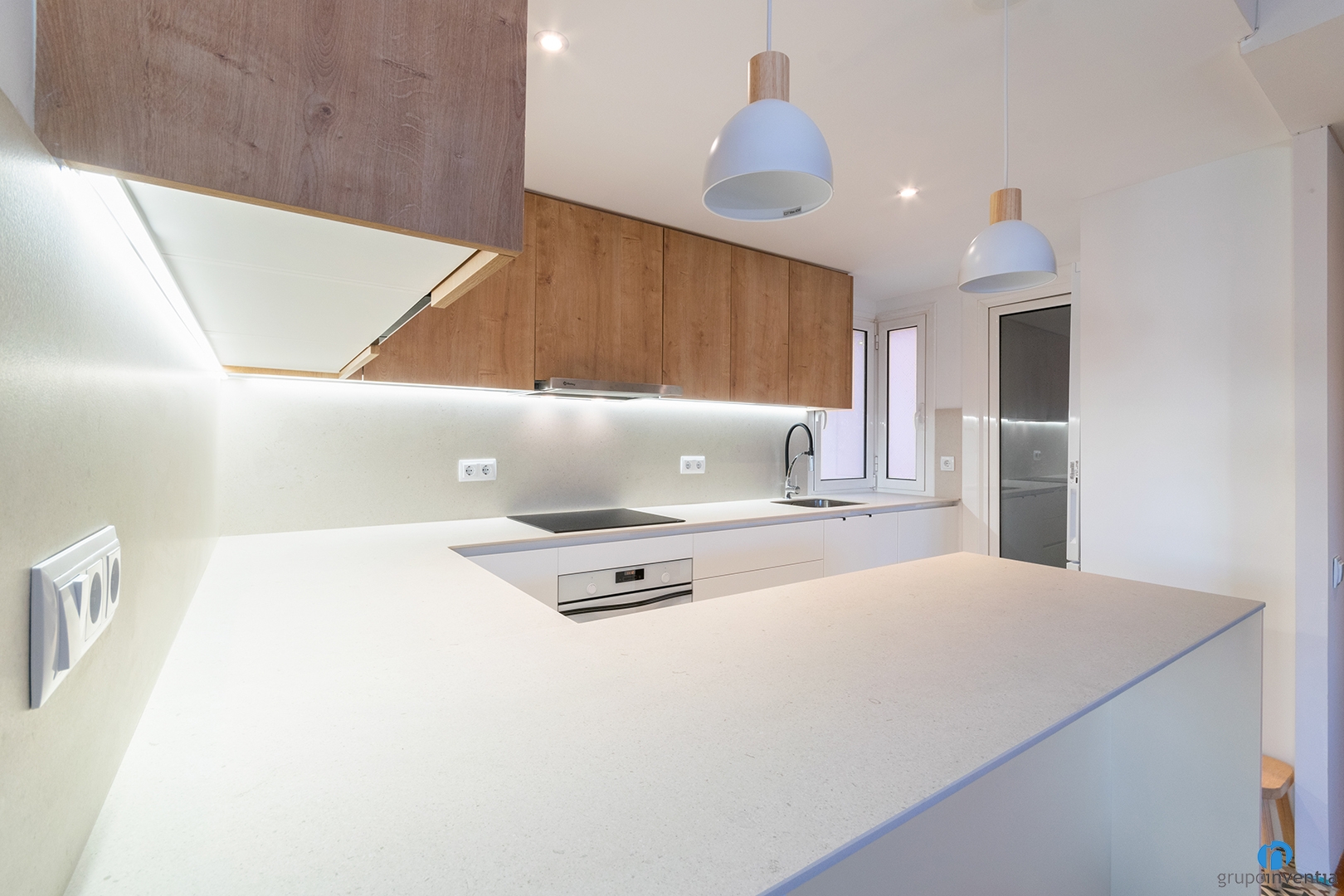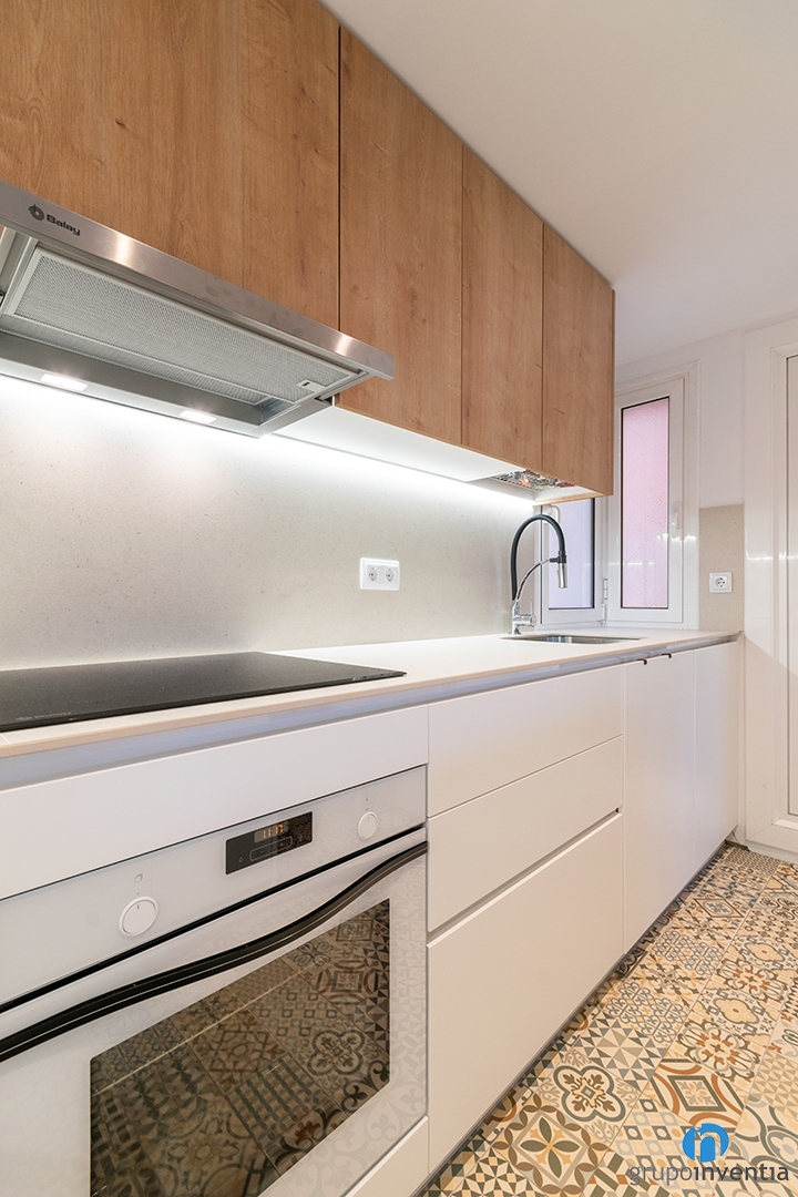 Per a la nova imatge d’aquesta reforma de cuina s’ha triat mantenir la resta de la vivenda. Un disseny neutre que genera un espai més lluminós i visualment ampli. La part inferior del moble de cuina és de color blanc, mentre que els armaris superiors tenen acabats de fusta.