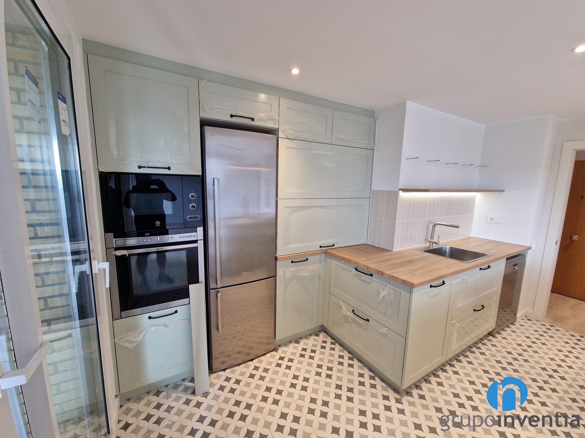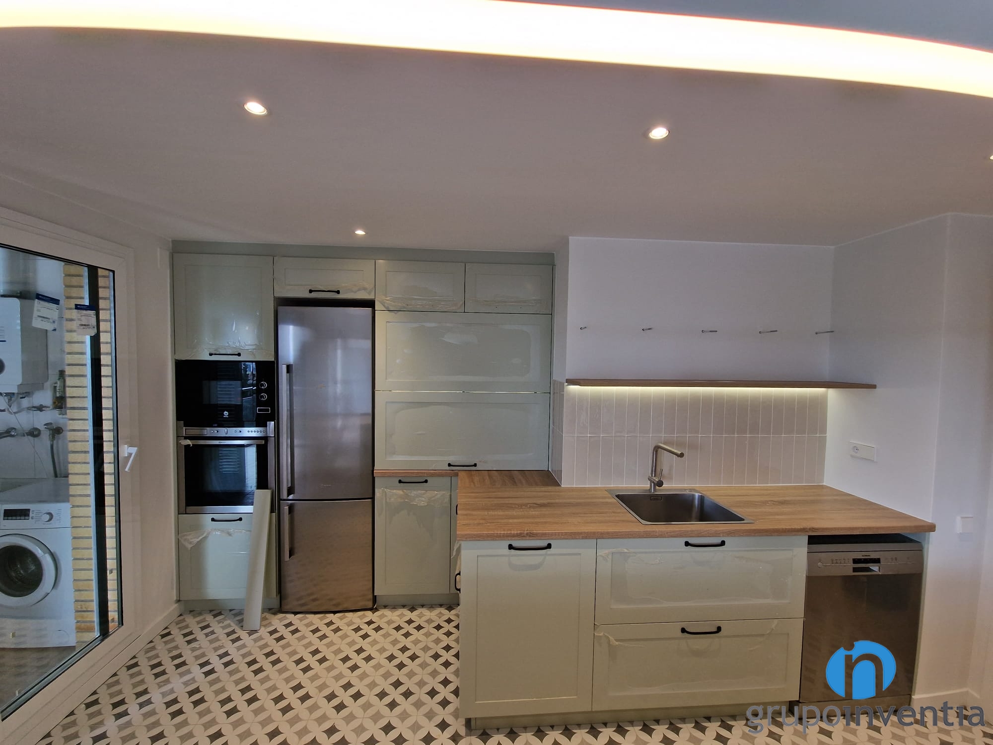 La zona principal de la cuina s’estén fins a l’extrem esquerre. S’hi han integrat els nous electrodomèstics d’aquesta reforma de cuina. Hi ha buits a mida per col·locar una nevera, un forn i un microones. Alhora, disposa de més armaris que amplien la capacitat d’emmagatzematge a la cuina.