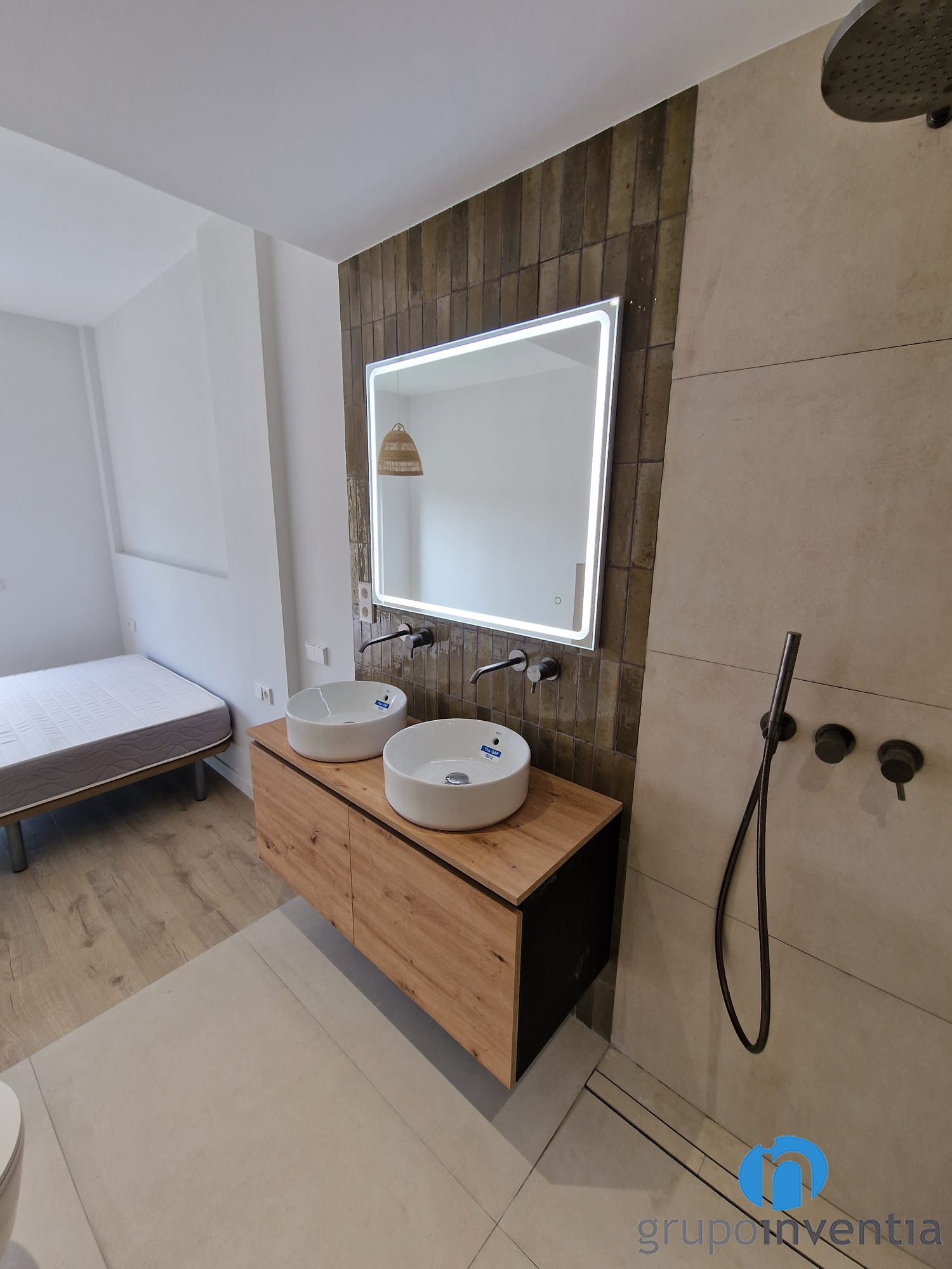 Les parets s’han enrajolat combinant rajoles de color beix i rajoles amb acabats de fusta. Es tracta d´un disseny excel·lent per combinar amb la imatge del dormitori suite que es presenta en un disseny contemporani. Les parets s’han pintat amb tons neutres i s’ha col·locat un terra de parquet amb acabats de fusta natural.