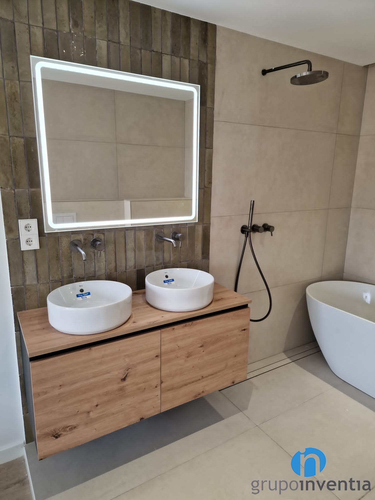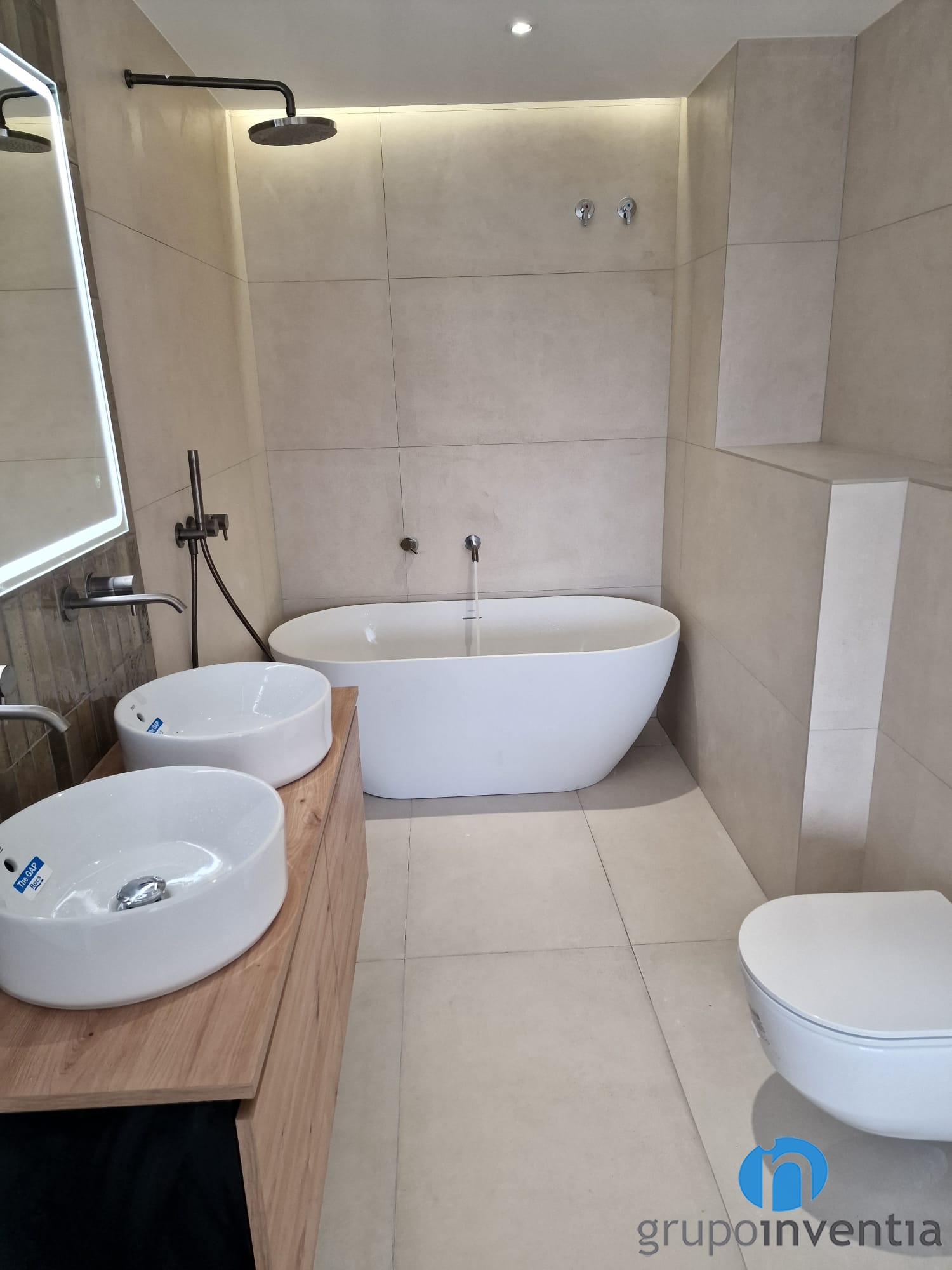 El bany suite és obert al dormitori i disposa d´un equipament sanitari modern i funcional. Té un lavabo doble amb moble demmagatzematge incorporat. També hi ha un vàter flotant i una zona d’aigües per a la qual s’ha escollit una banyera de disseny còmoda. Pels moments de diari també disposa una pràctica dutxa.