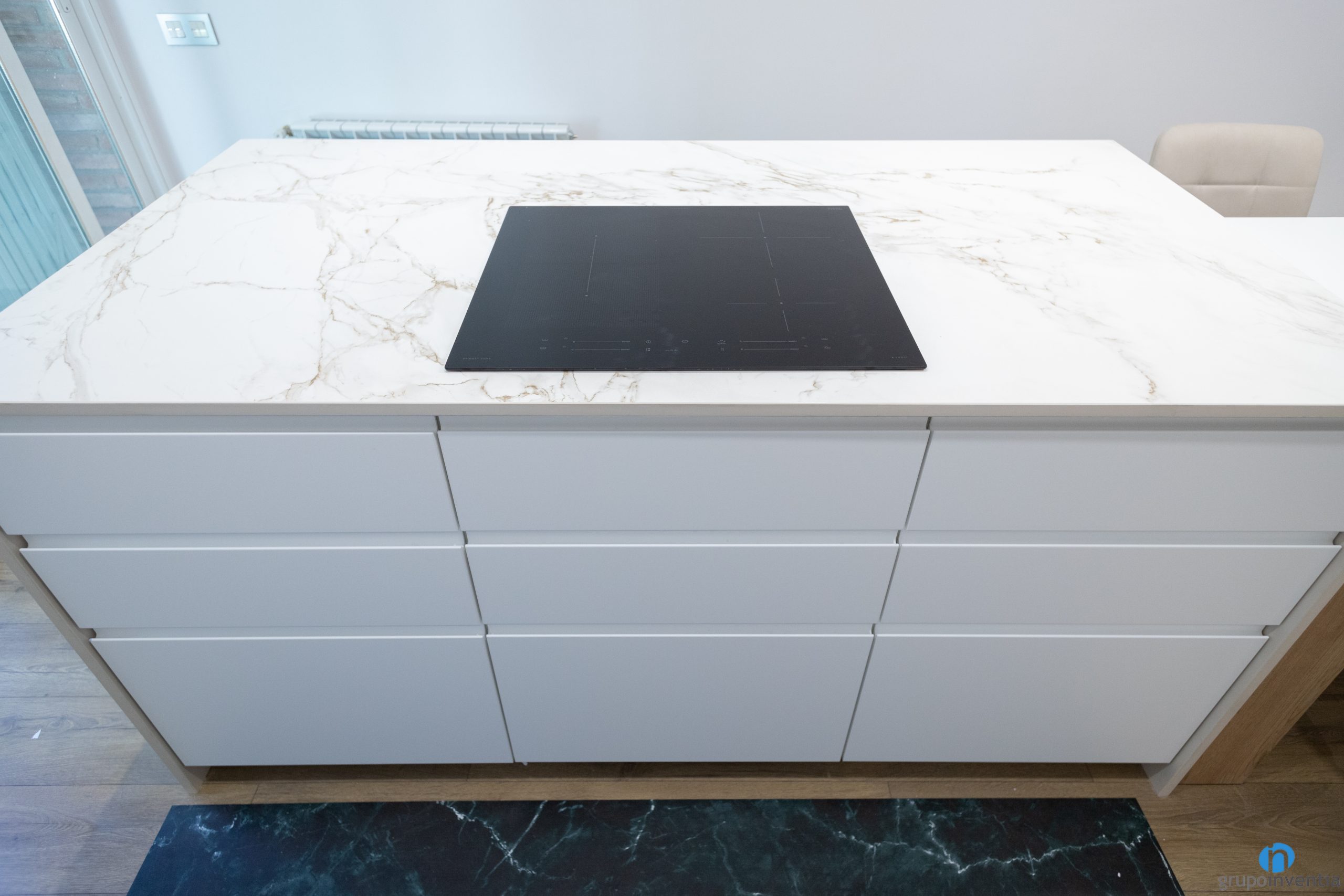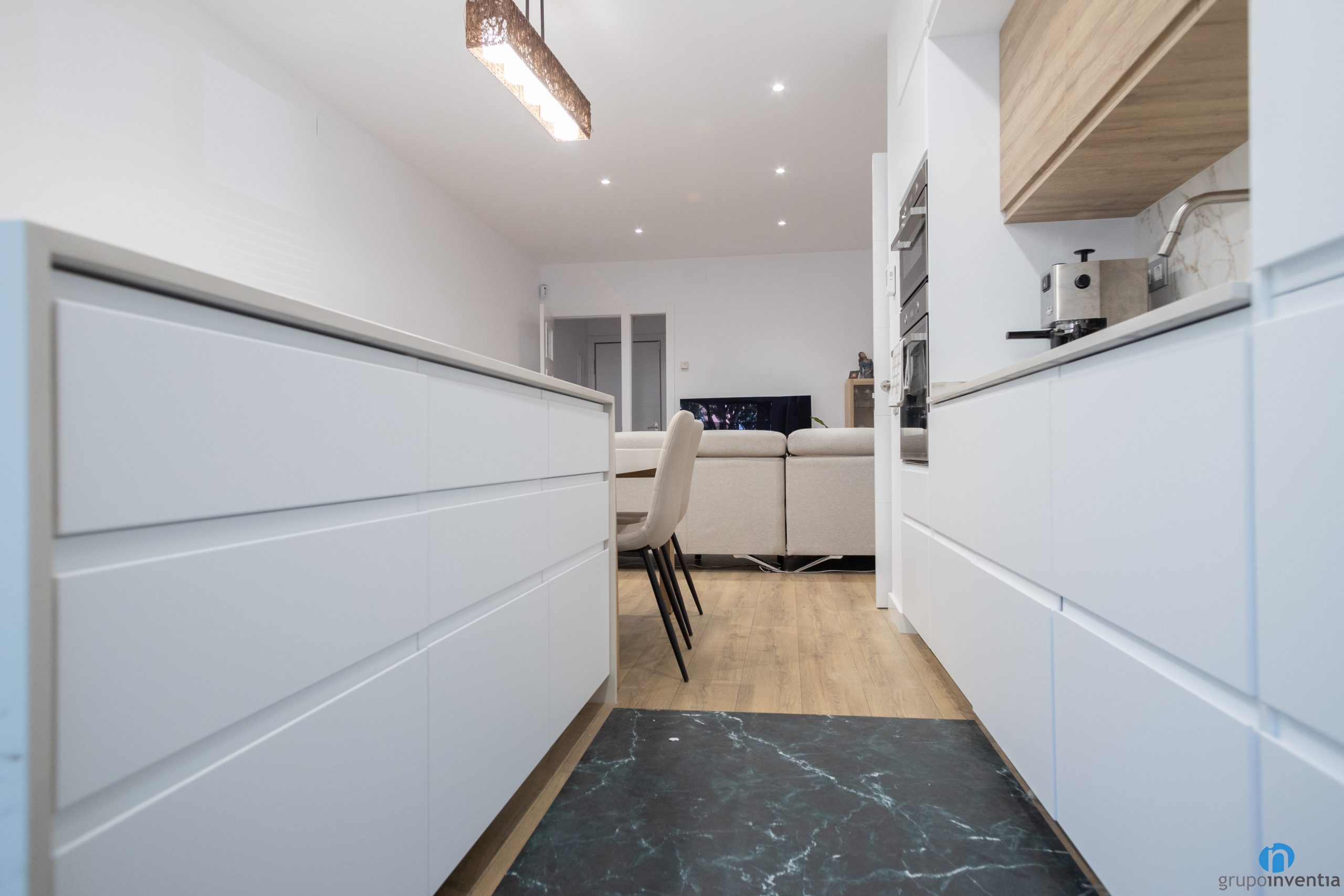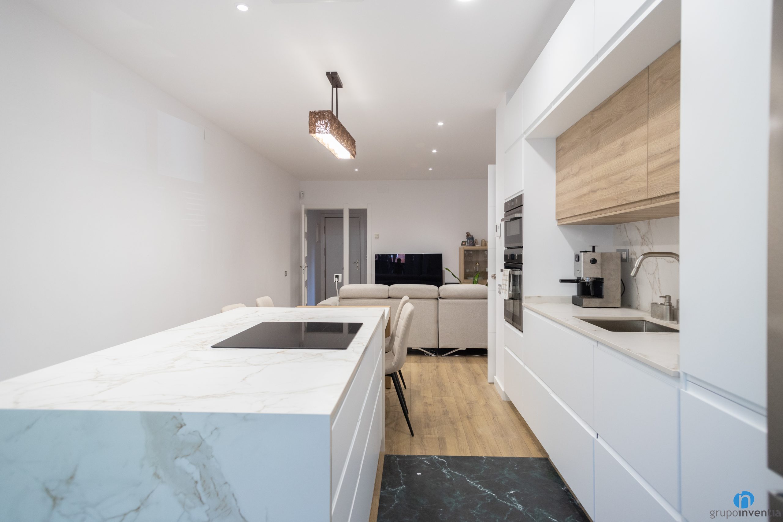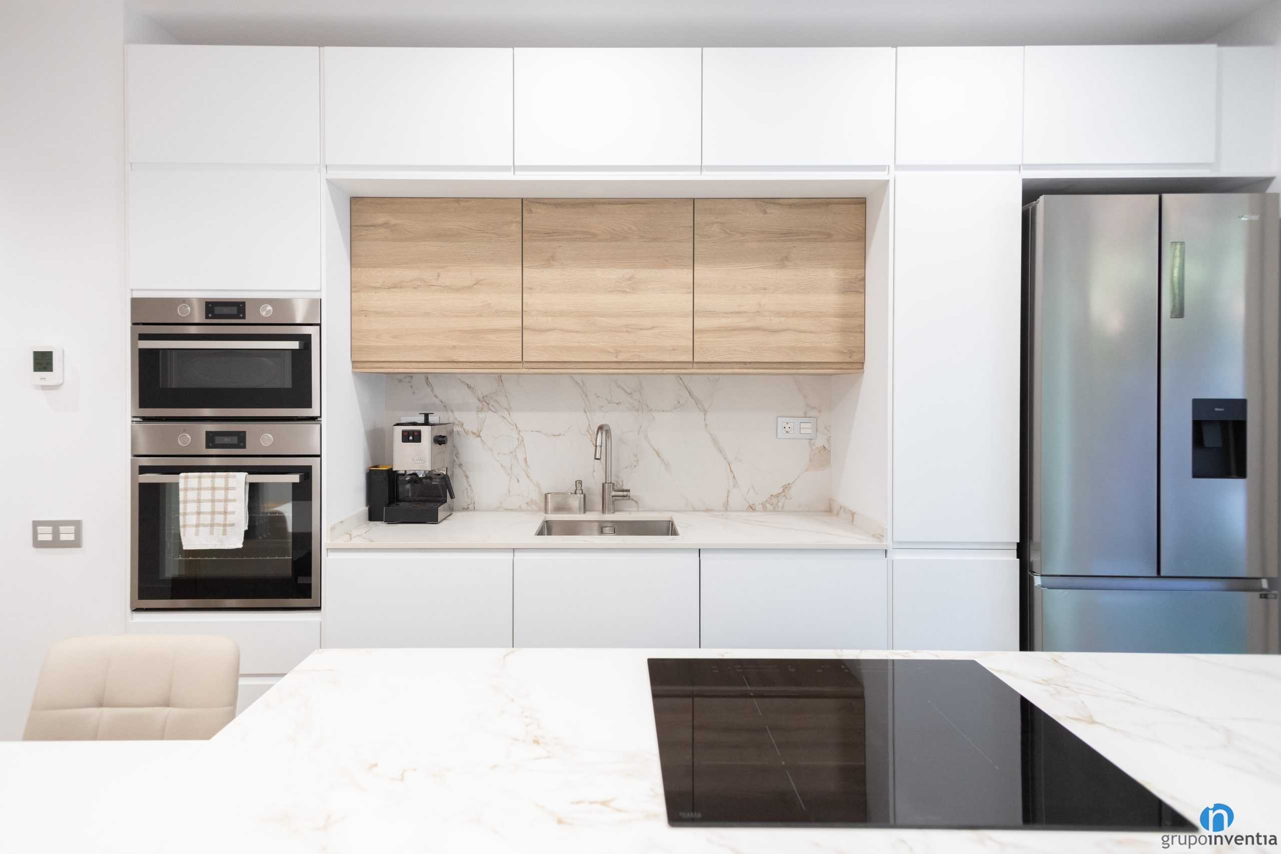 La cuina està ubicada en un espai ampli i que permet molta mobilitat. A més, els nous elements s’han col·locat al lloc indicat per oferir la millor funcionalitat. Aquesta reforma de cuina té una distribució lineal amb els electrodomèstics integrats als dos extrems. A l’esquerra hi ha el forn i el microones, mentre que la nevera s’ubica al costat dret.