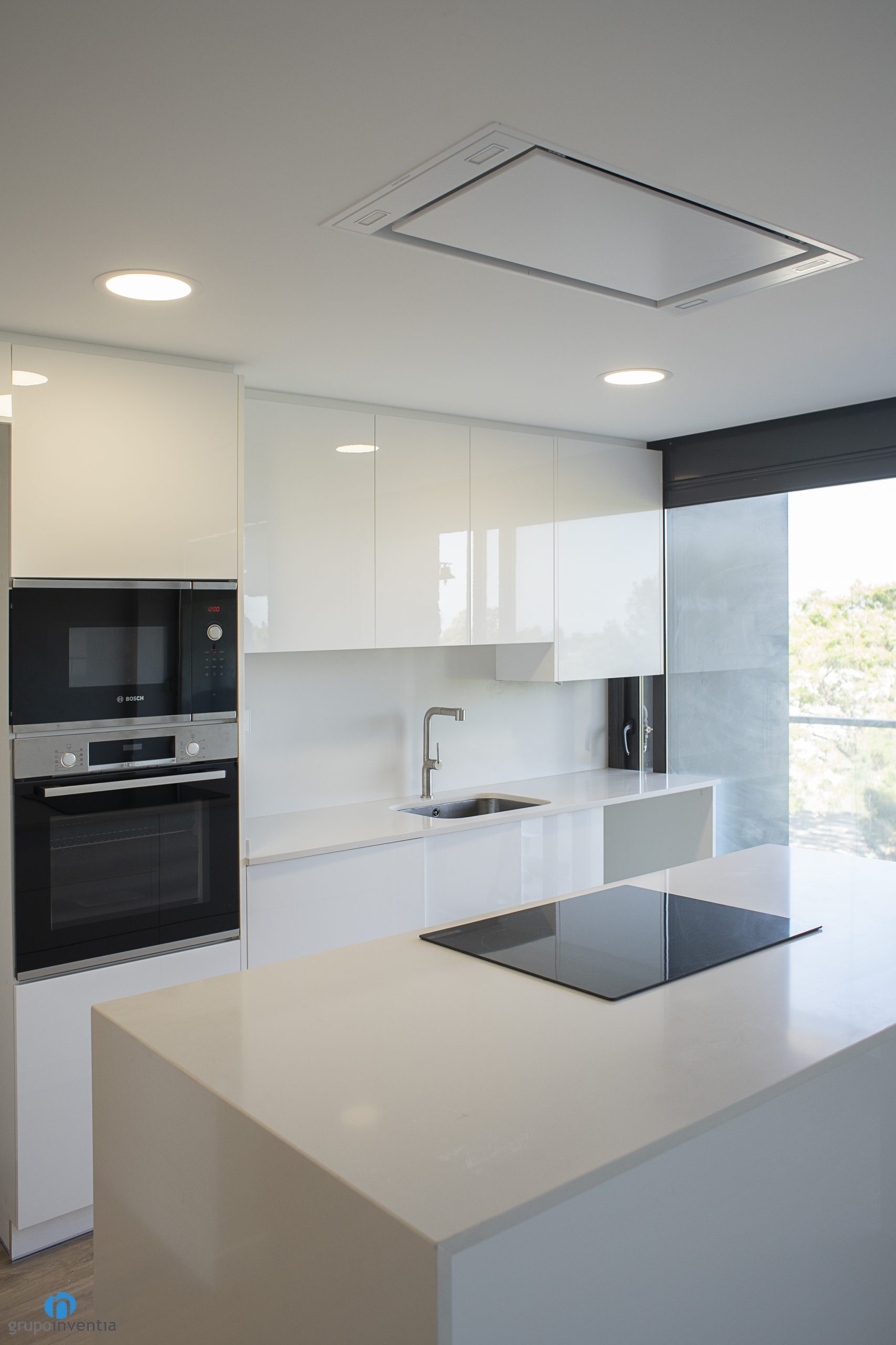 Per a aquesta reforma de cuina s’ha escollit un moble de color blanc capaç de generar lluminositat i amplitud a la zona. Els panells dels calaixos i dels armaris són llisos i aconsegueixen dotar la cuina d’una imatge lineal i moderna. El paviment és el mateix que s’ha col·locat a l’espai annex, un terra de parquet que contrasta perfectament amb el mobiliari blanc de la cuina.