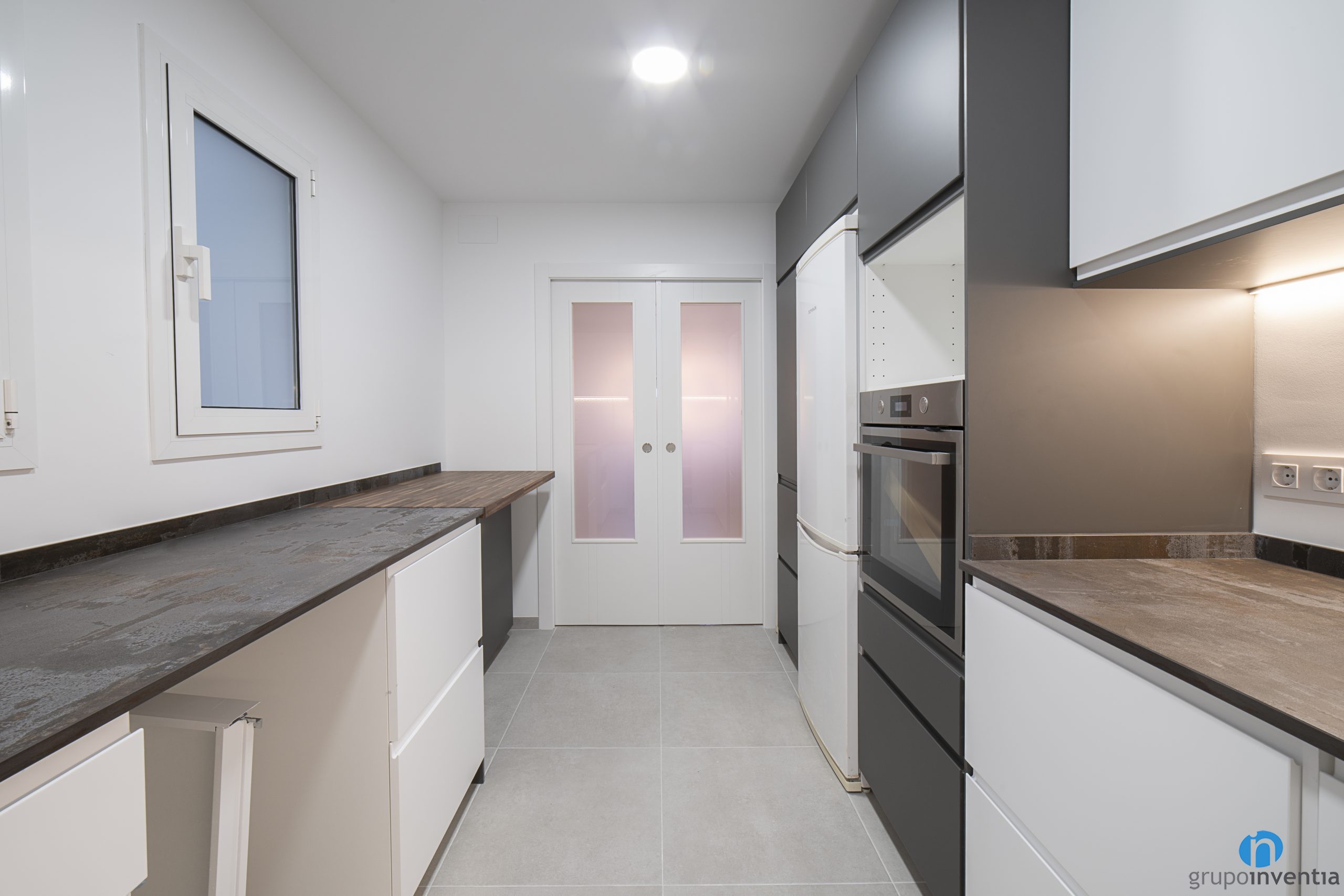 El costat dret l’ocupa un taulell que va d’extrem a extrem de la cuina. Disposa d’una pica i amplia la superfície de suport i de treball. Una altra millora d’aquesta reforma de cuina és ampliar la capacitat d’emmagatzematge. Tant a la part inferior com superior hi ha diversos calaixos i armaris.