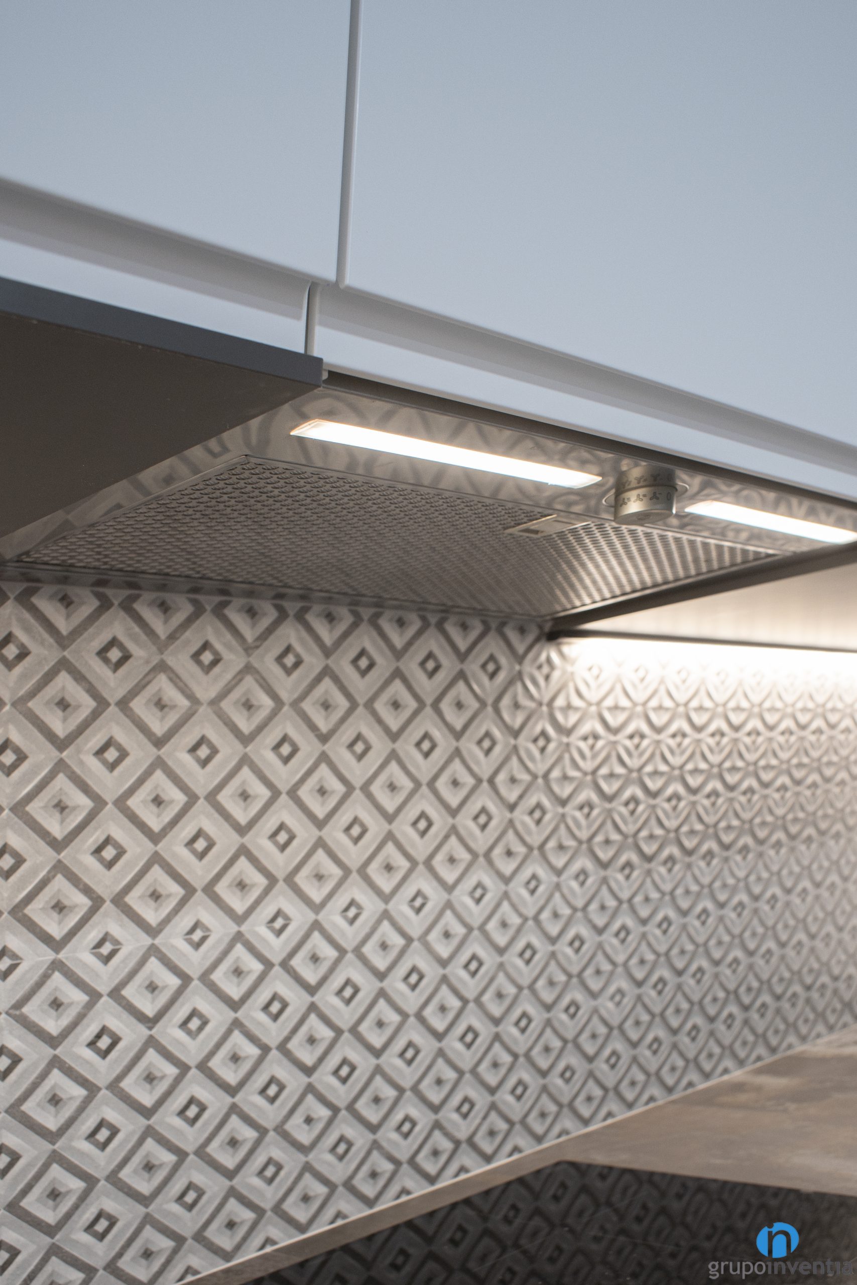 A la banda esquerra s’han deixat buits a mida per integrar diversos electrodomèstics. Concretament una nevera, un microones i un forn. Seguidament neix un taulell que funciona com a superfície de suport. Al taulell central s’ha instal·lat la nova placa vitroceràmica.