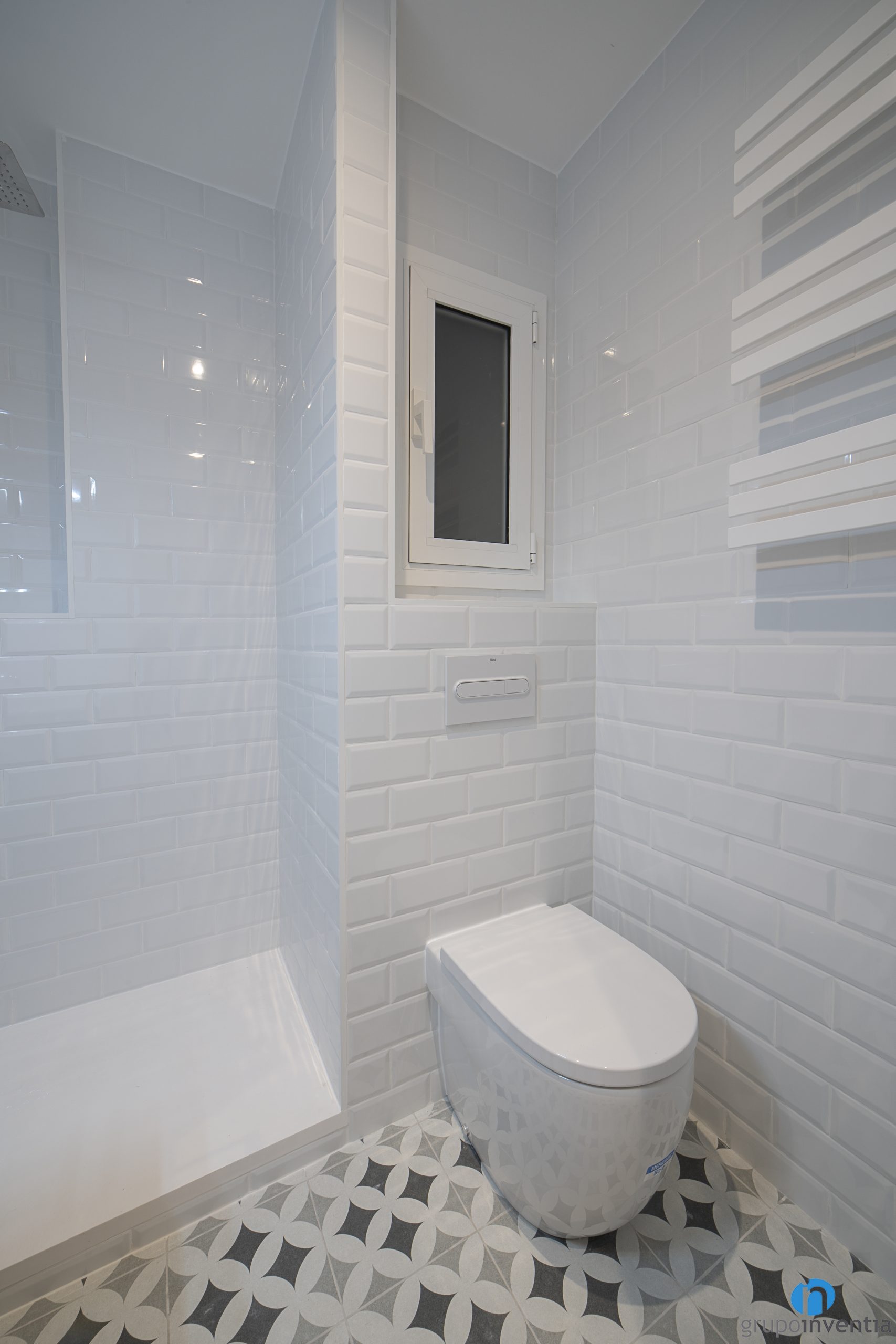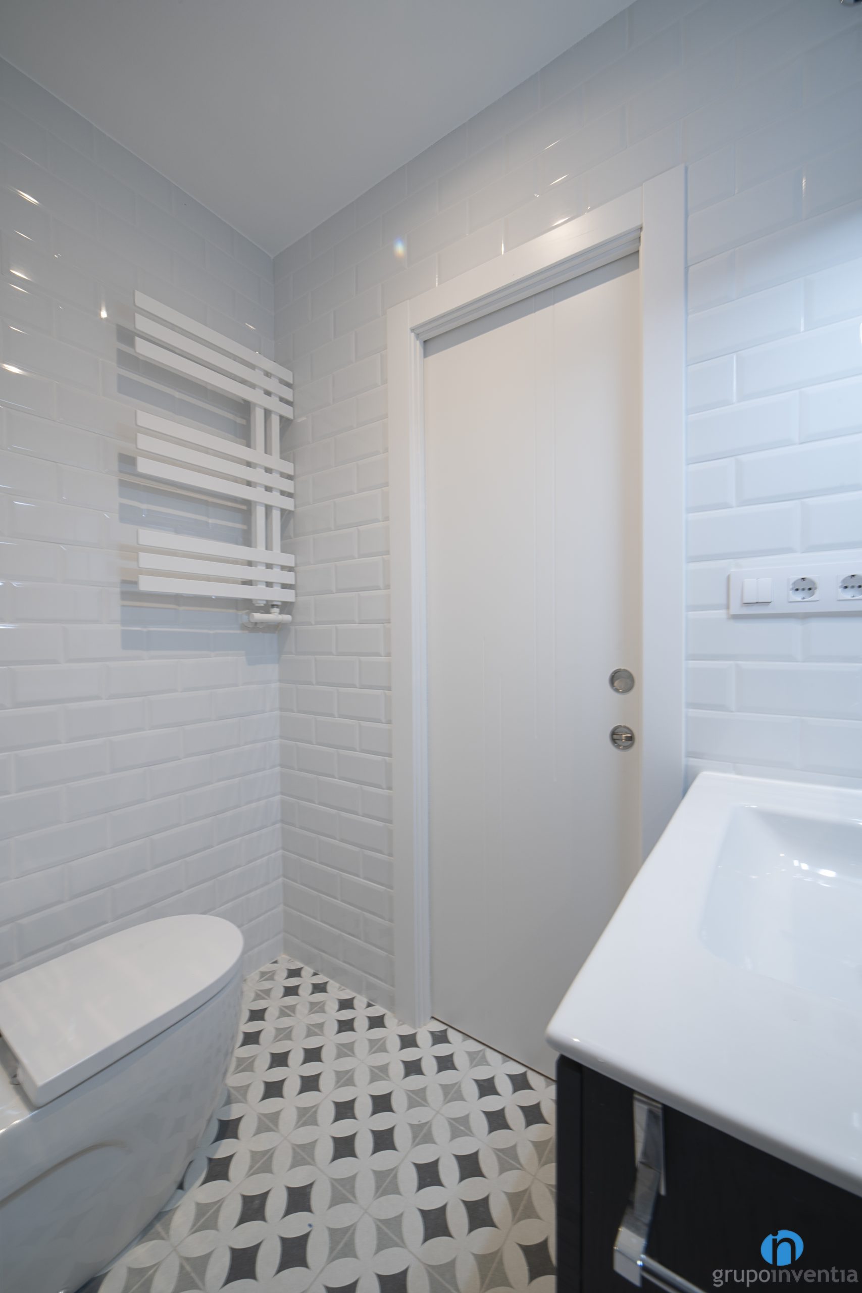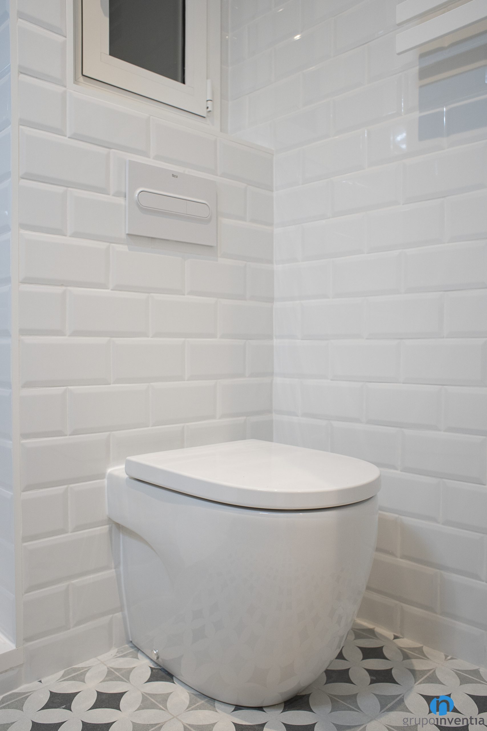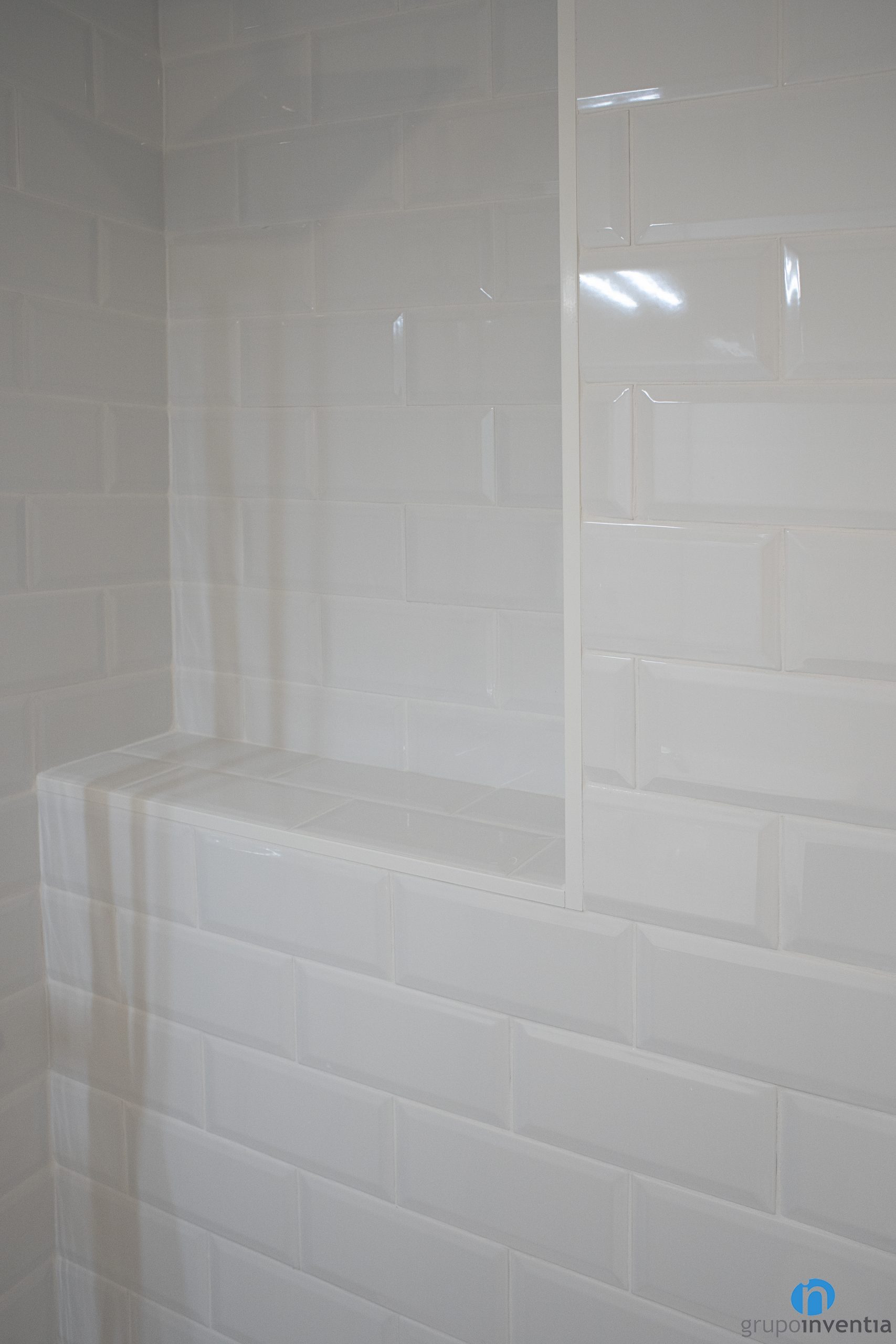 Per a la nova imatge d aquesta reforma de bany s’ha seguit l interiorisme general del habitatge. Un disseny interior contemporani que genera lluminositat i amplitud. Les parets s’han enrajolat completament amb rajoles bisellades de color blanc. També s’ha col·locat un nou terra de rajoles amb un dibuix estil hidràulic.
