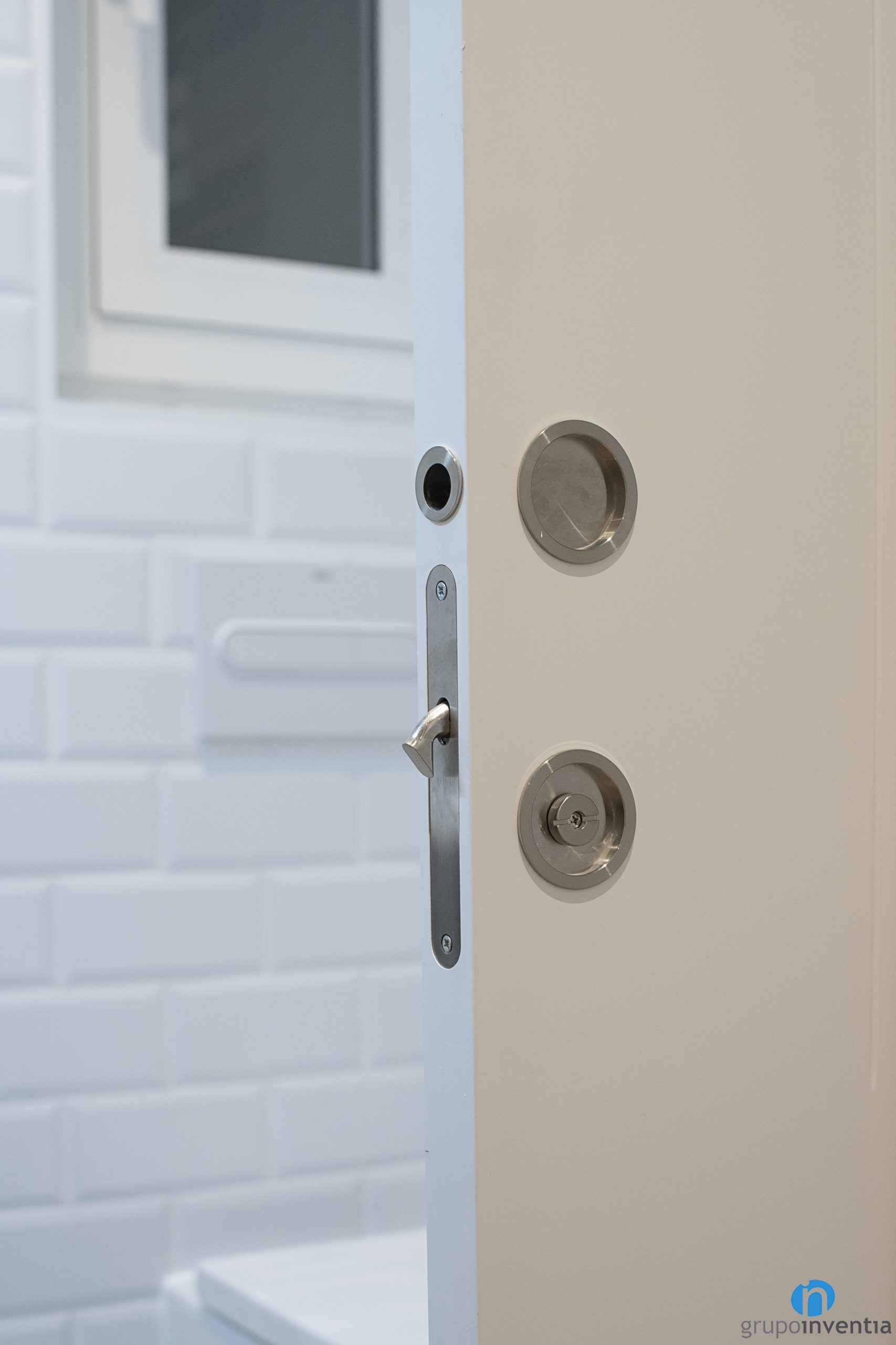 Al bany s’hi accedeix per una porta corredissa i compta amb tres peces sanitàries. Hem instal·lat un lavabo amb moble d’emmagatzematge, un vàter flotant i una zona d’aigües. Per a aquest darrer element hem escollit un plat de dutxa que està llest per oferir les millors prestacions en tot moment.