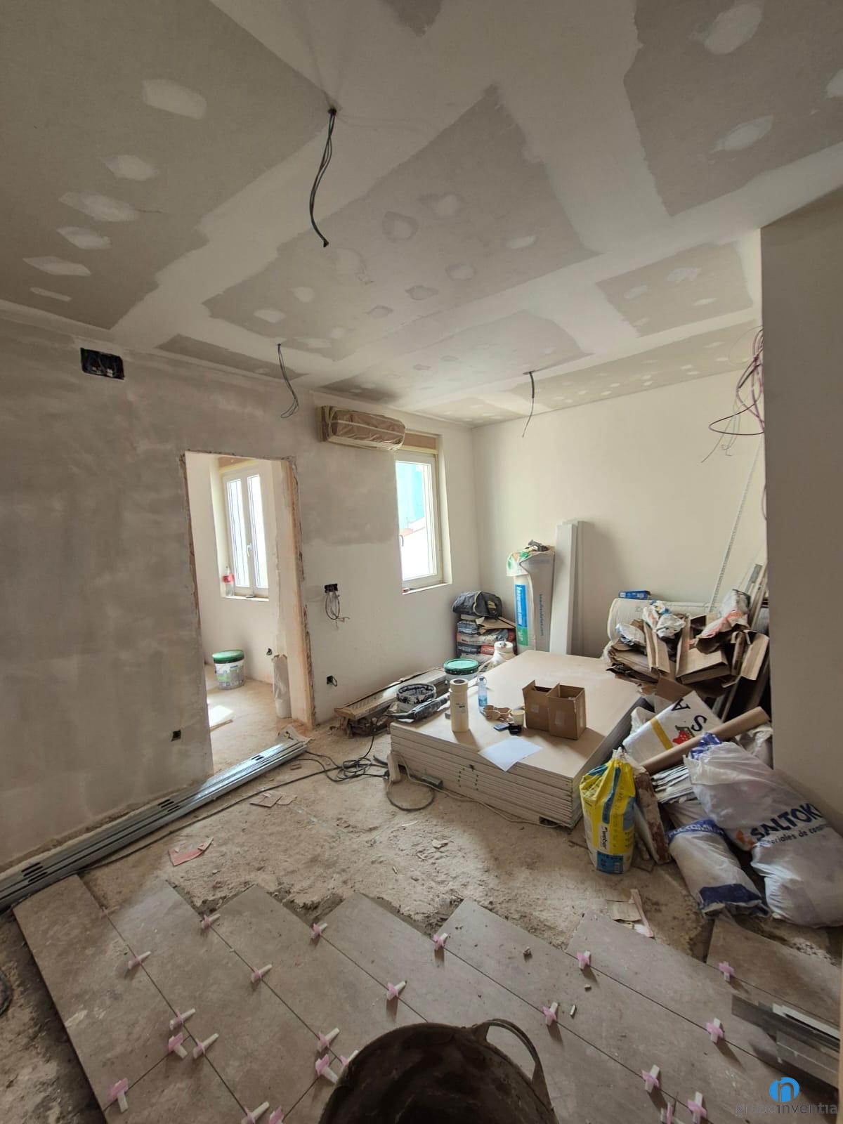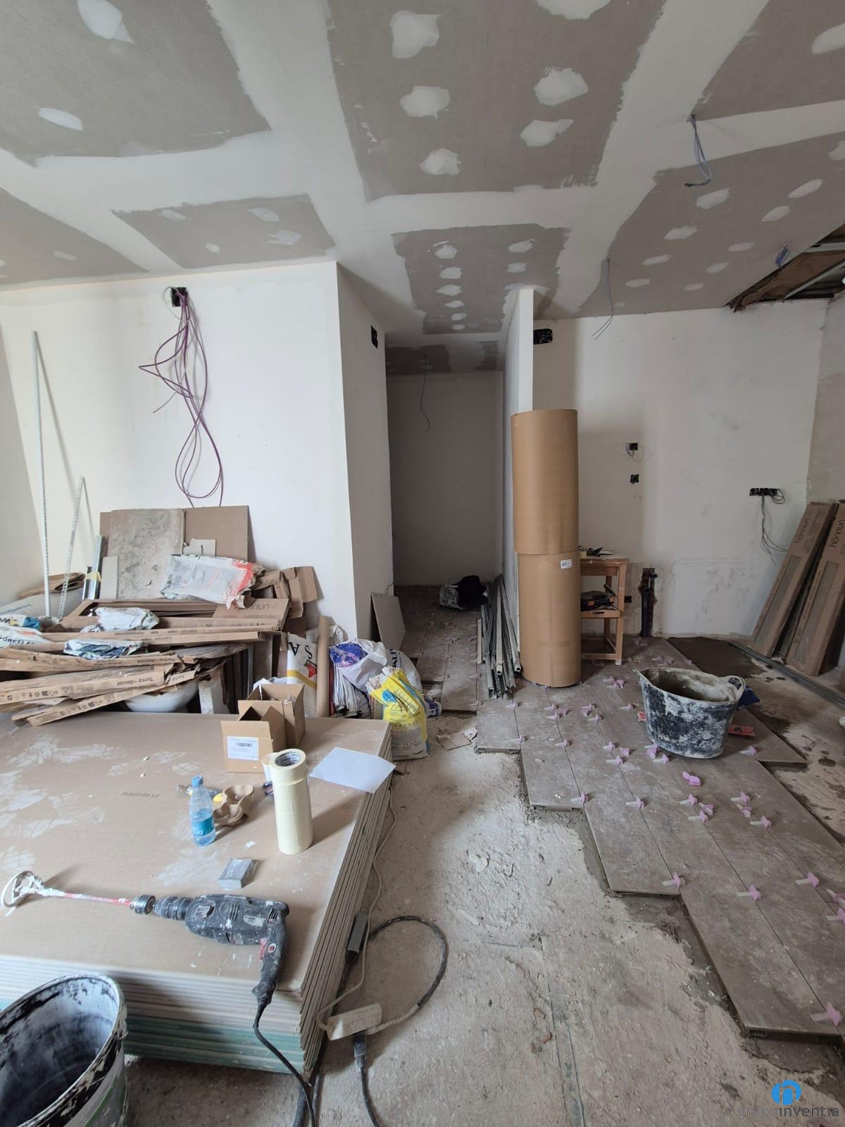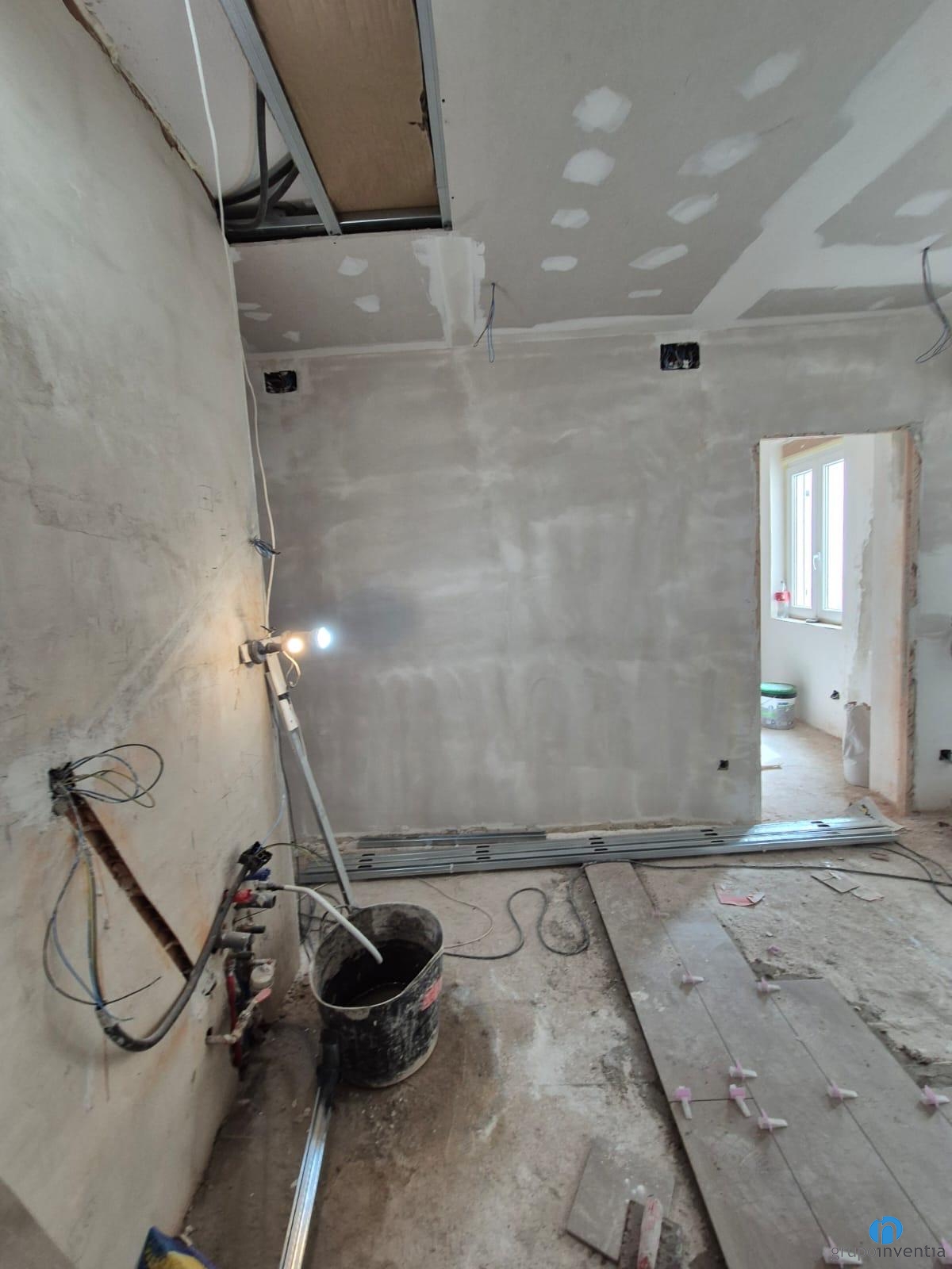 A les imatges del working progress s’aprecia que és un pis molt lluminós i amb estades àmplies. Ens trobem en plena feina d’allisat de parets i col·locació de sostres. En els propers dies iniciarem el procés de col·locació de terra. A dia d’avui també hem començat a enrajolar la cambra de bany. S’intueix una reforma de bany amb un disseny elegant i amb tons neutres.