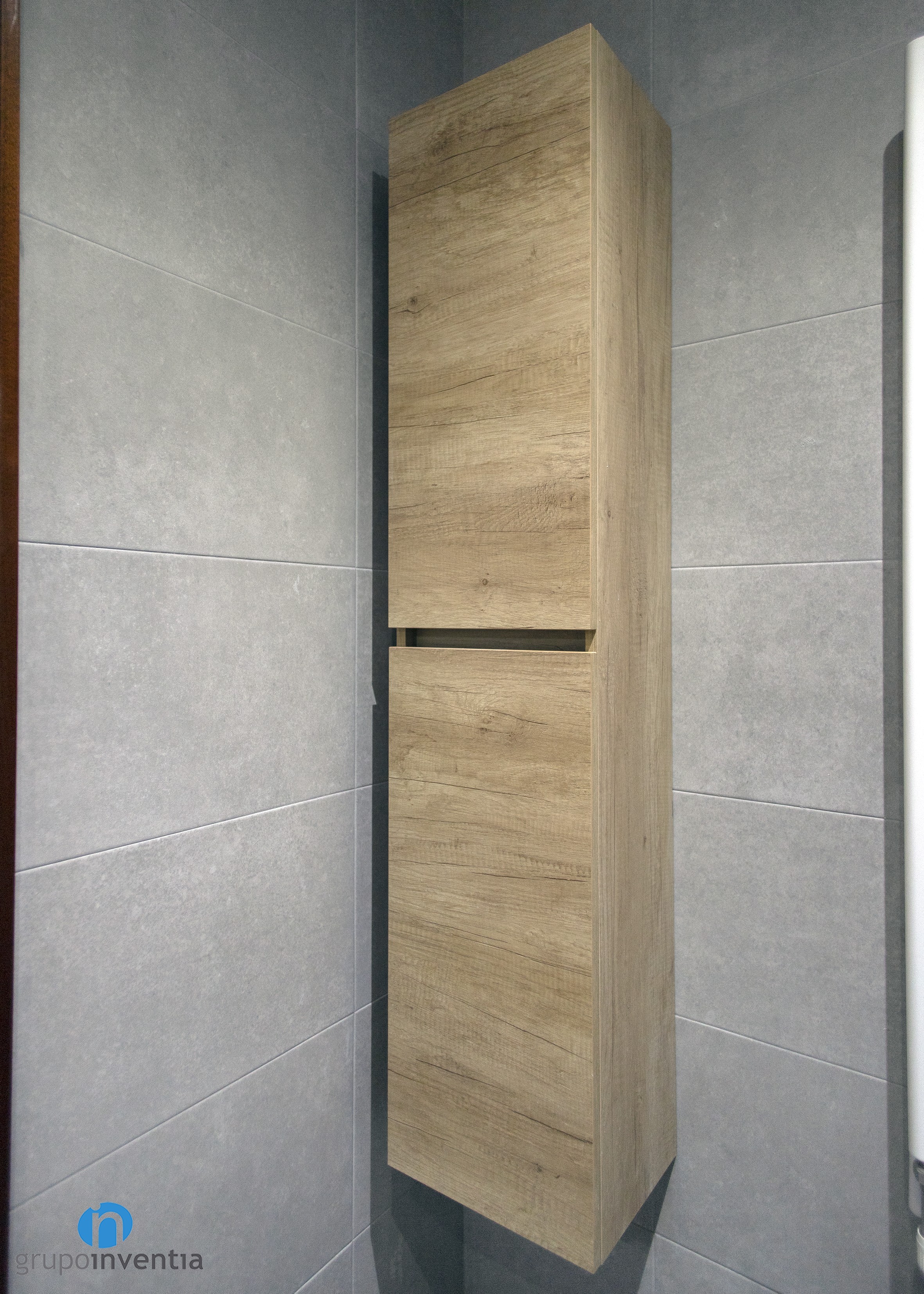 Al seu torn, aquest color gris es combina amb un altre tipus d’acabats. A més del blanc porcellana dels sanitaris també incorpora els acabats en fusta, concretament en els mobles d’emmagatzematge del lavabo i l’armari ancorat a la paret.