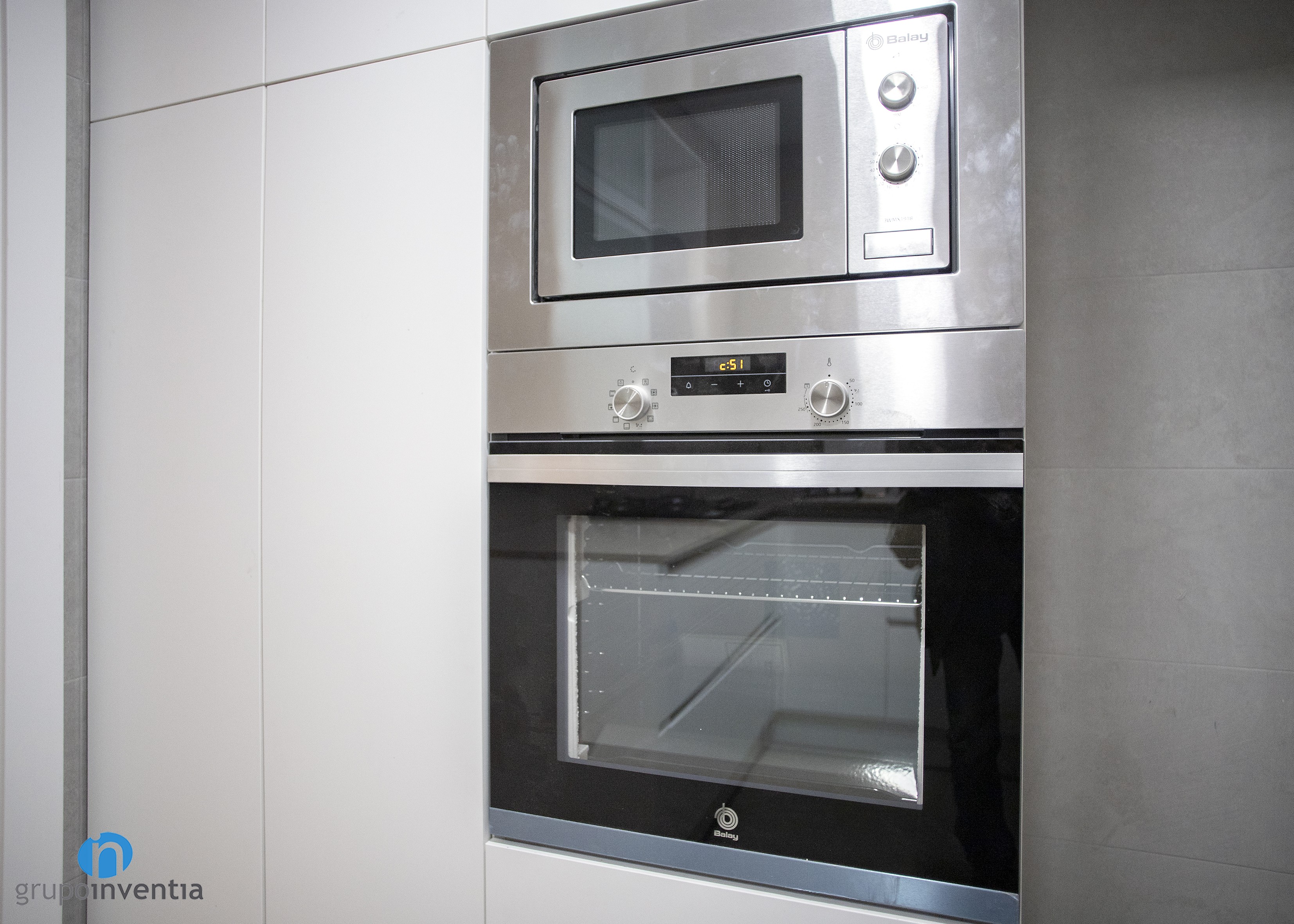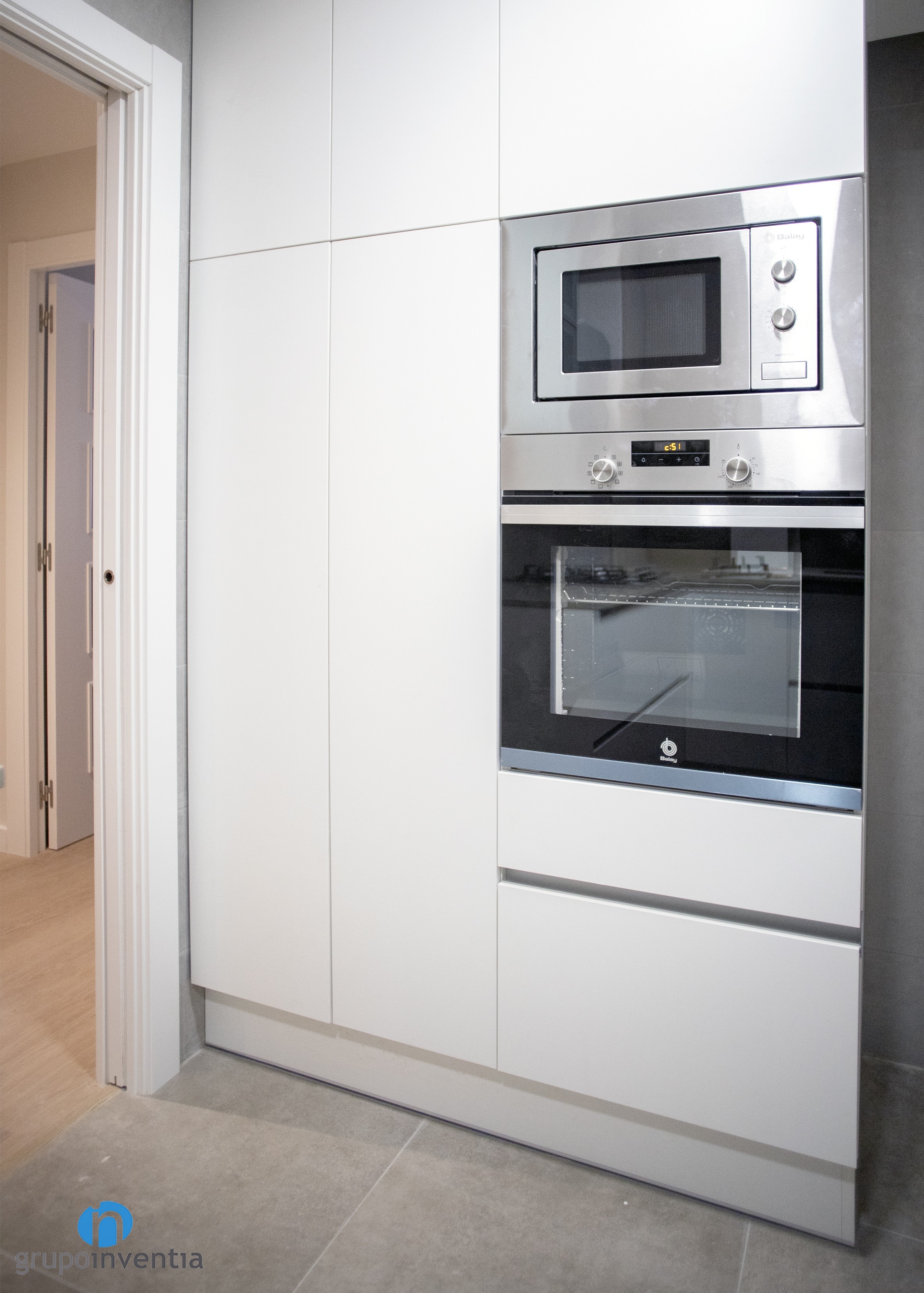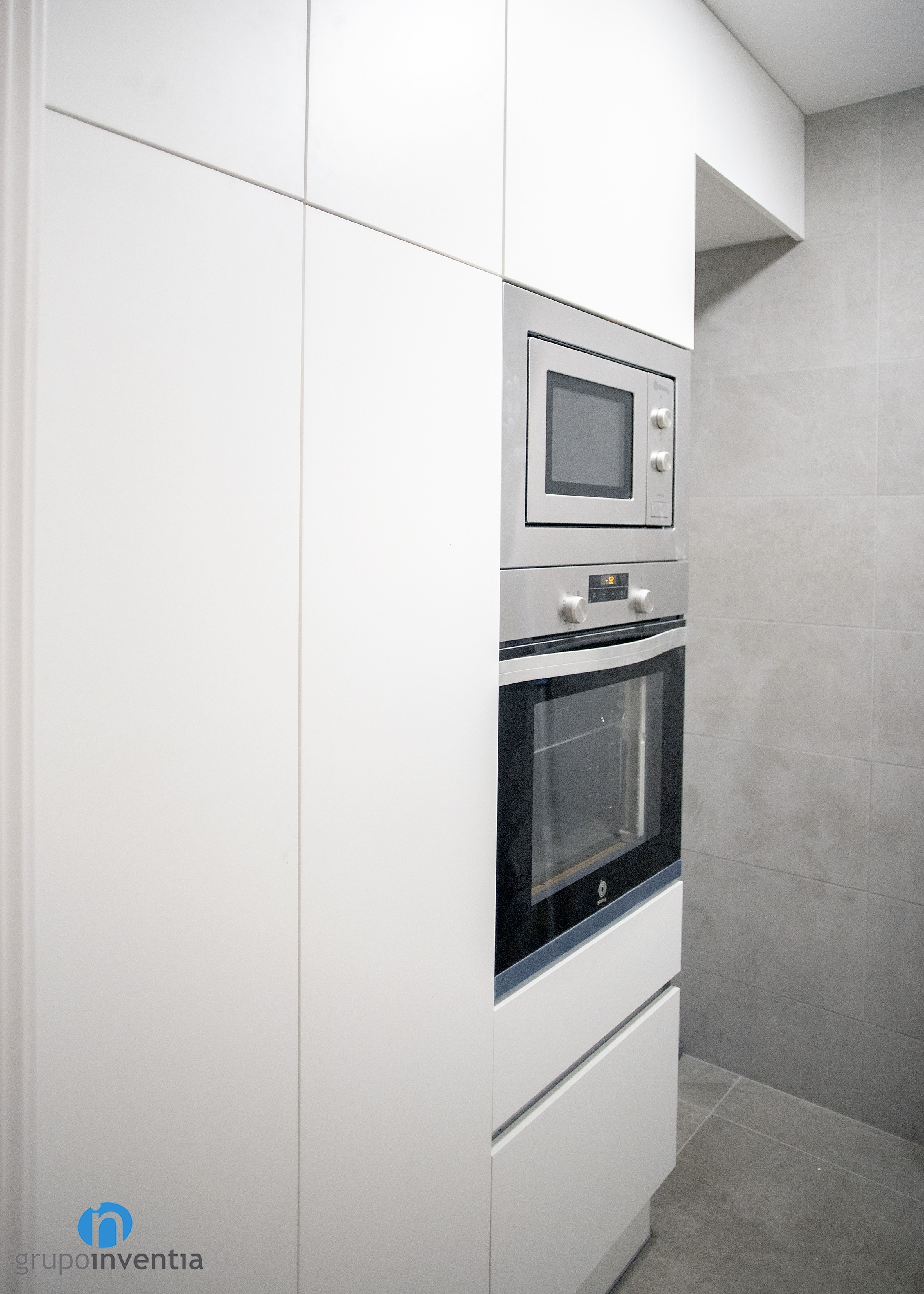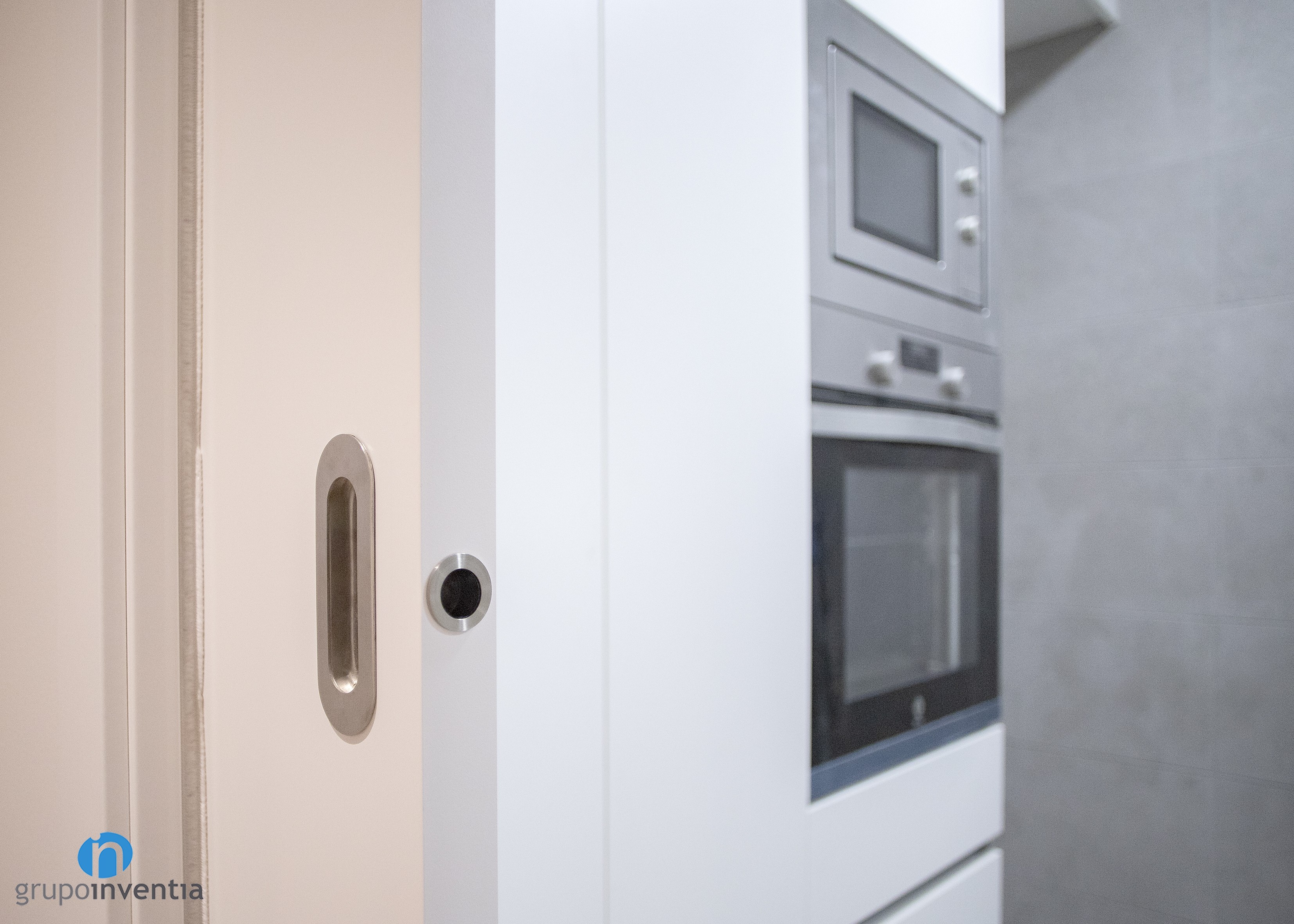 La cuina està situada en una estança pròpia i està distribuïda en forma de L. Un detall important en aquest treball de reforma de cuina va ser la col·locació d’una porta corredissa, ja que d’aquesta manera es va aconseguir aprofitar al màxim l’espai disponible. Just al costat esquerre de l’entrada es va col·locar un moble de cuina amb forats a mida per a encastar la nevera, el forn i el microones.