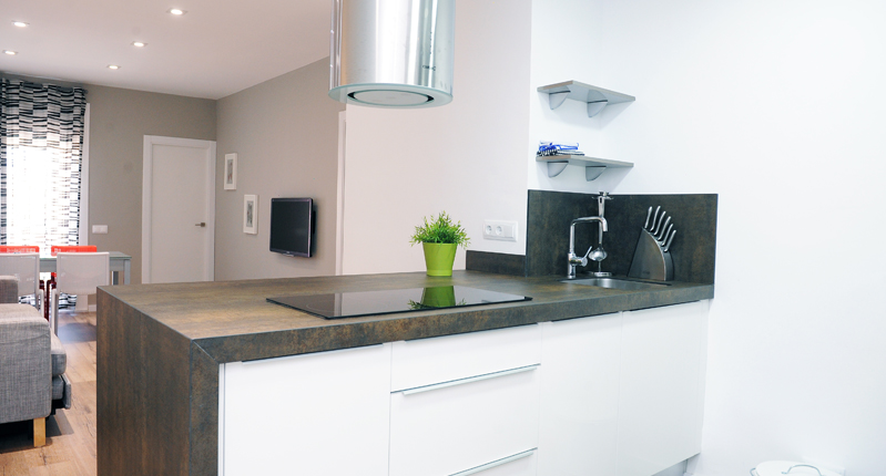 El espacio de la cocina es la zona más importante ya que es una zona del estudio que por un lado ha de estar muy bien delimitada pero a la vez no podemos incidir en la movilidad y funcionalidad. La idea más común para delimitar la cocina es a través de una encimera que sirva como barra americana. De este modo creamos un espacio diferenciado y además conseguimos un lugar funcional en el que sentarnos a comer. Es importante saber cuidar la extracción de humos, en este sentido, para la reforma de un estudio debe instalarse una campana eficaz, y ubicar las superficies de trabajo en alguna área próxima a ventana.