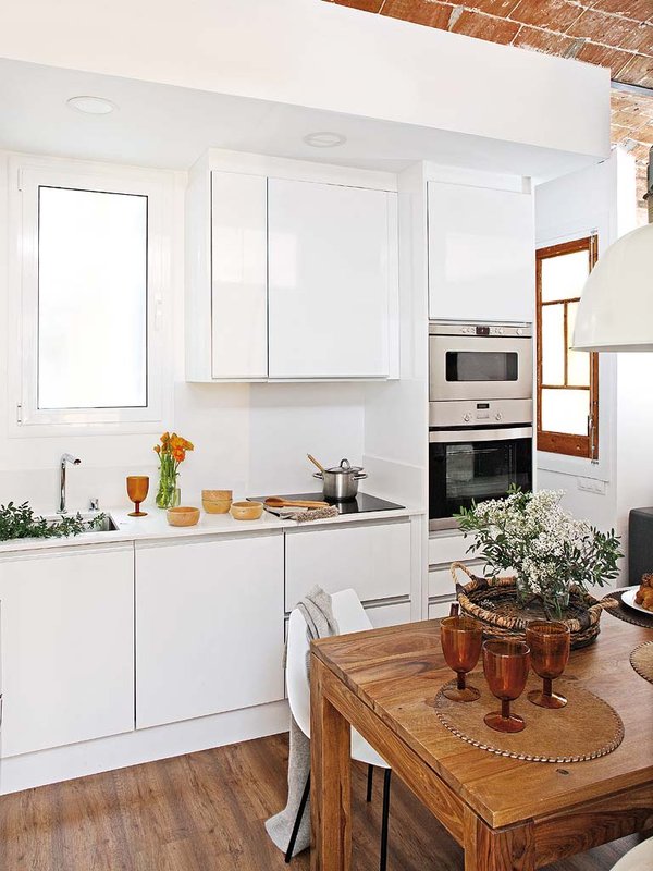 En uno de los extremos se dispone un mueble de cocina en el que se encastrarán los electrodomésticos. Con ello, además de tenerlos todos en la misma zona, conseguirás ahorrar mayor espacio en el resto de la superficie de la cocina. Seguidamente se coloca la encimera, la cual llegará hasta el final de la estancia. Sobre ella se instalan el fregadero y la placa de cocción.