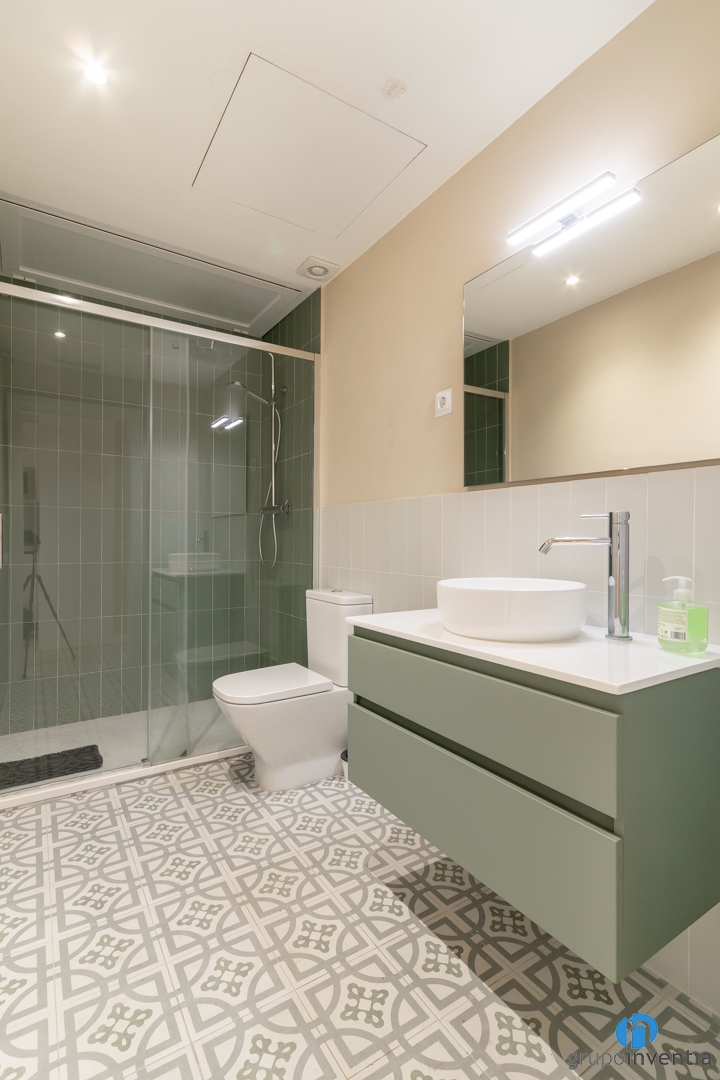 We tiled the mid-height walls with neutral tiles and painted the rest beige. A very successful combination to enhance the brightness and spaciousness of the bathroom. On the other hand, the tiles on the shower wall are green, matching the bathroom furniture. As in the rest of the floor reform, the floor is hydraulic style.