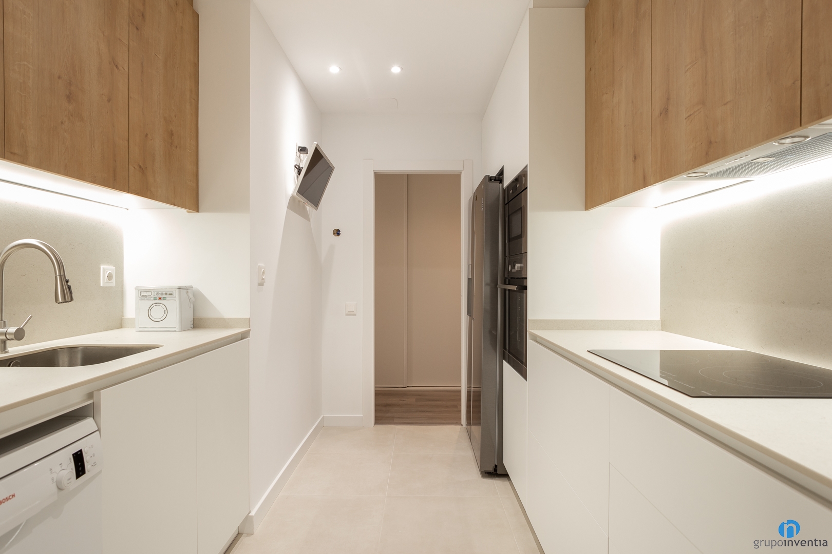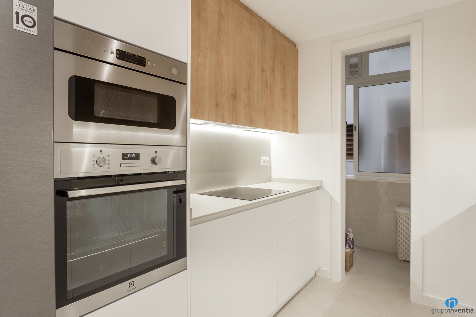 At the end of the left side we have integrated several appliances. Specifically the double door fridge, the oven and the microwave. This is followed by a section of counter equipped with an induction plate. Right in front we find the second counter which also offers a support and work surface.
