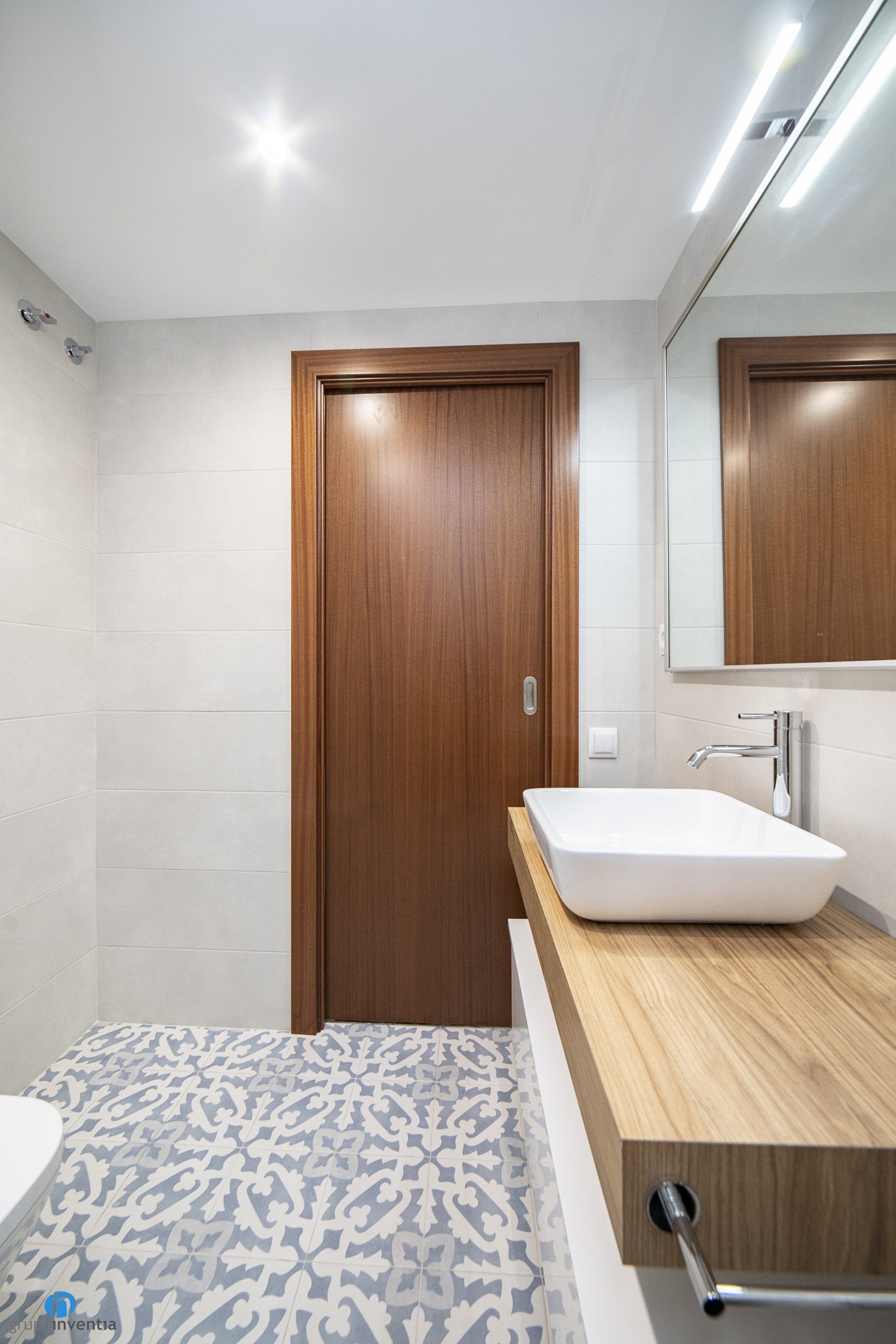 Another advantage of this choice for bathroom renovation is that other finishes can be introduced. For example, the washbasin has medium wood finishes. On the other hand, a hydraulic type pavement with blue patterns has been chosen. In general, it has been possible to modernize the image of this bathroom according to the needs of its owners.