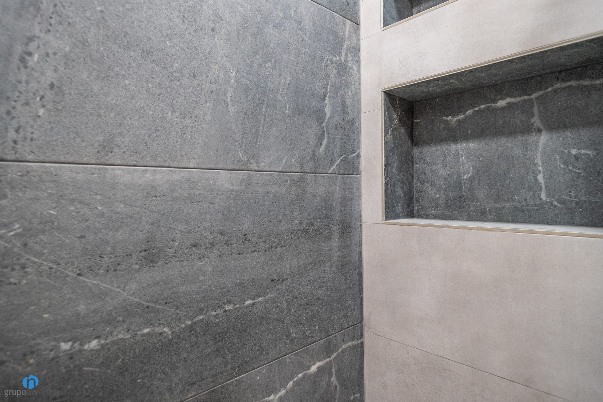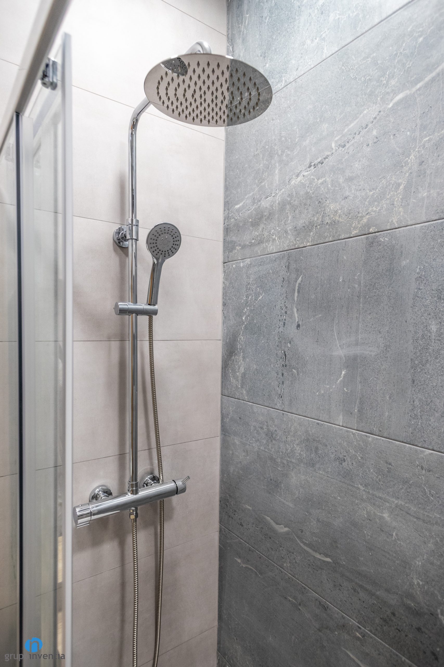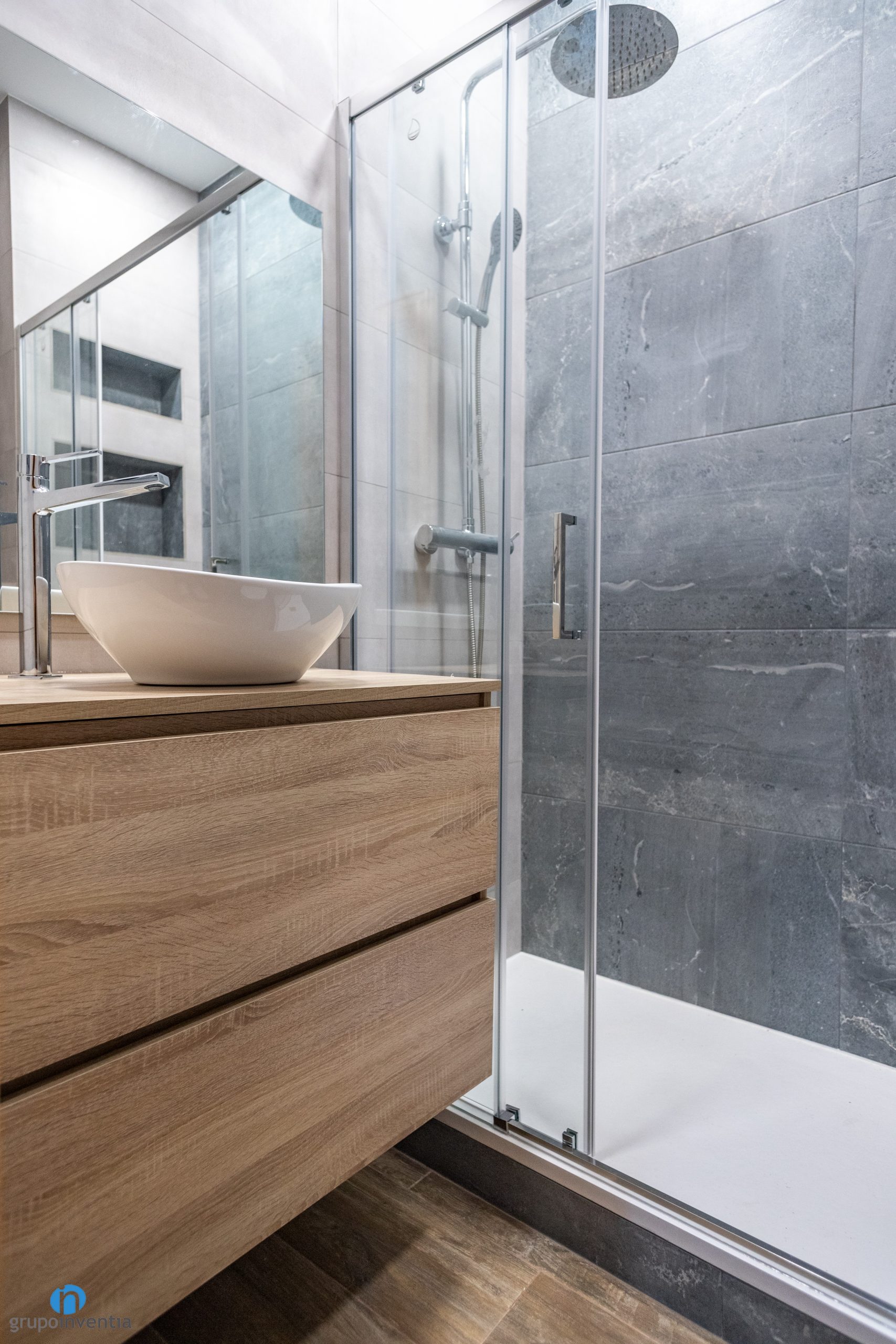 In this bathroom renovation, we have opted for a contemporary interior design with neutral tones. In this way we have obtained a bathroom that enhances the brightness and visual breadth. To do this, the walls have been completely tiled with soft gray tiles. This design is different on the shower wall, as it has been tiled with gray tiles that mimic a stone finish.