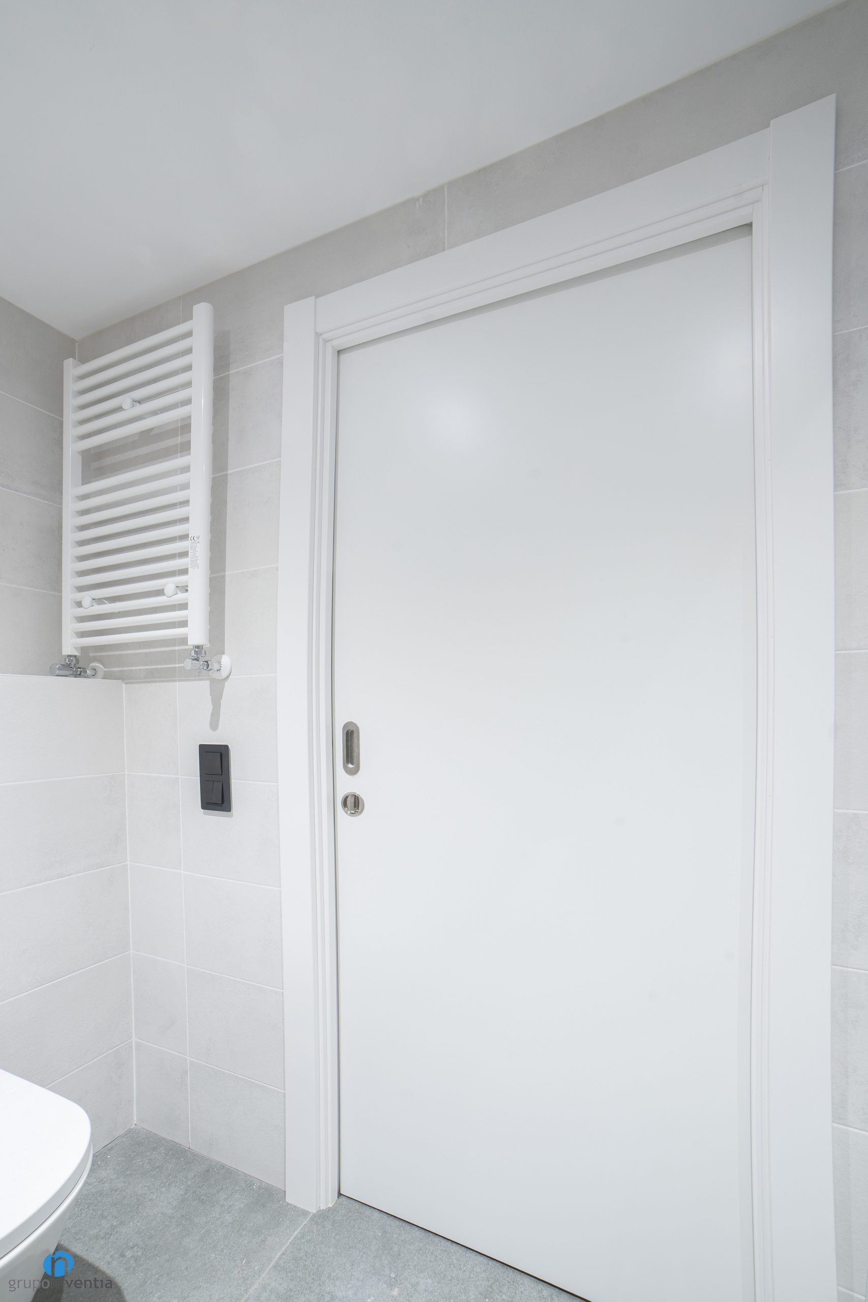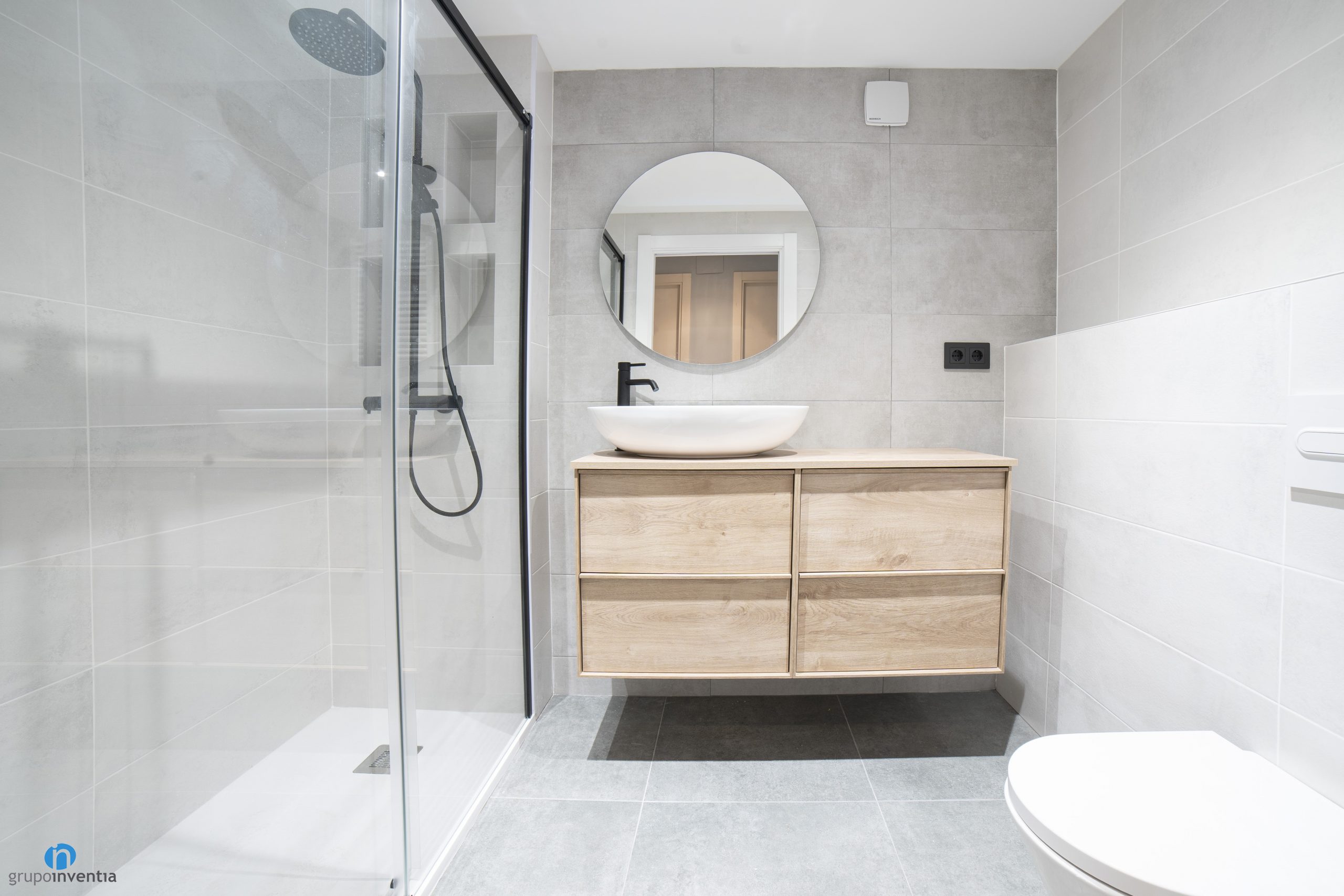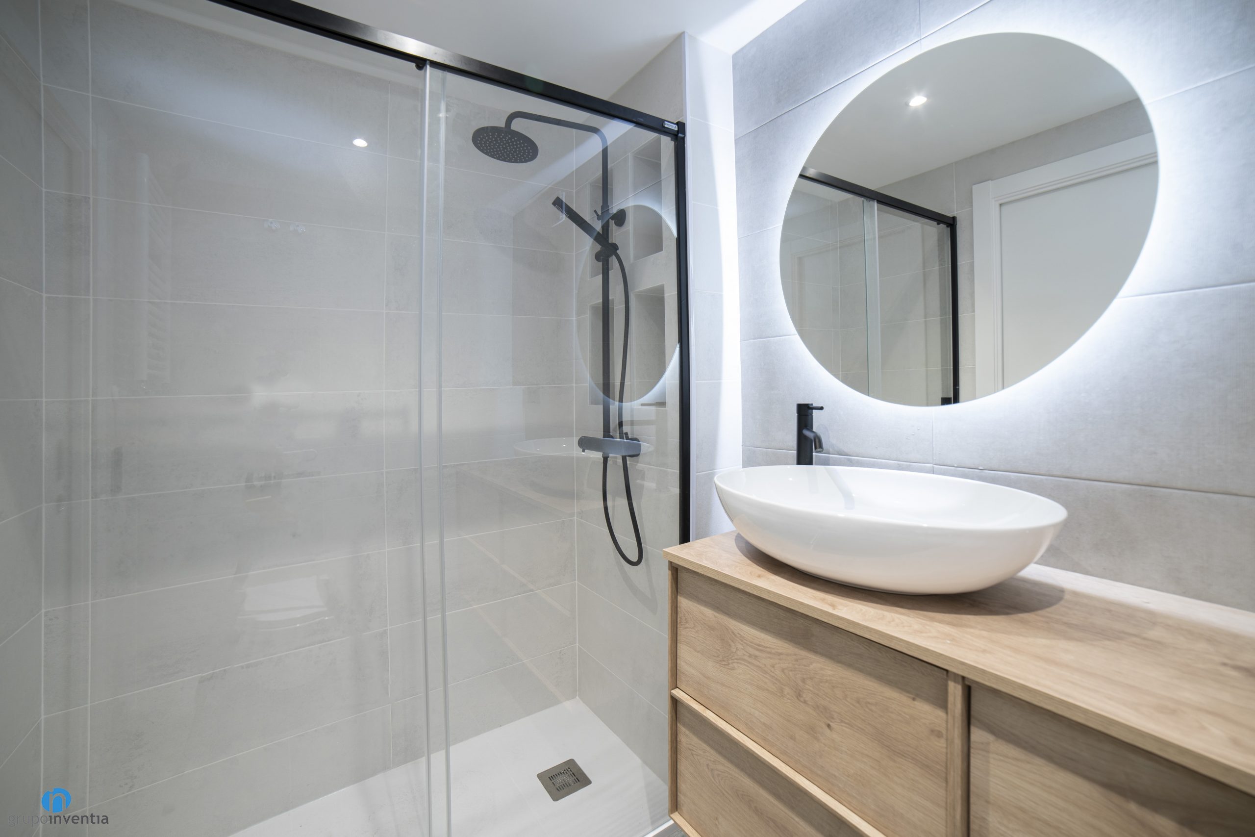 Other novelties of this bathroom renovation can be found in the bathroom mirror. A large, rounded mirror has been chosen. In addition to being an indispensable element in a space like this, it helps to generate greater depth. An electric dry towel has also been placed on the right side of the door. A very practical element that is increasingly in demand.
