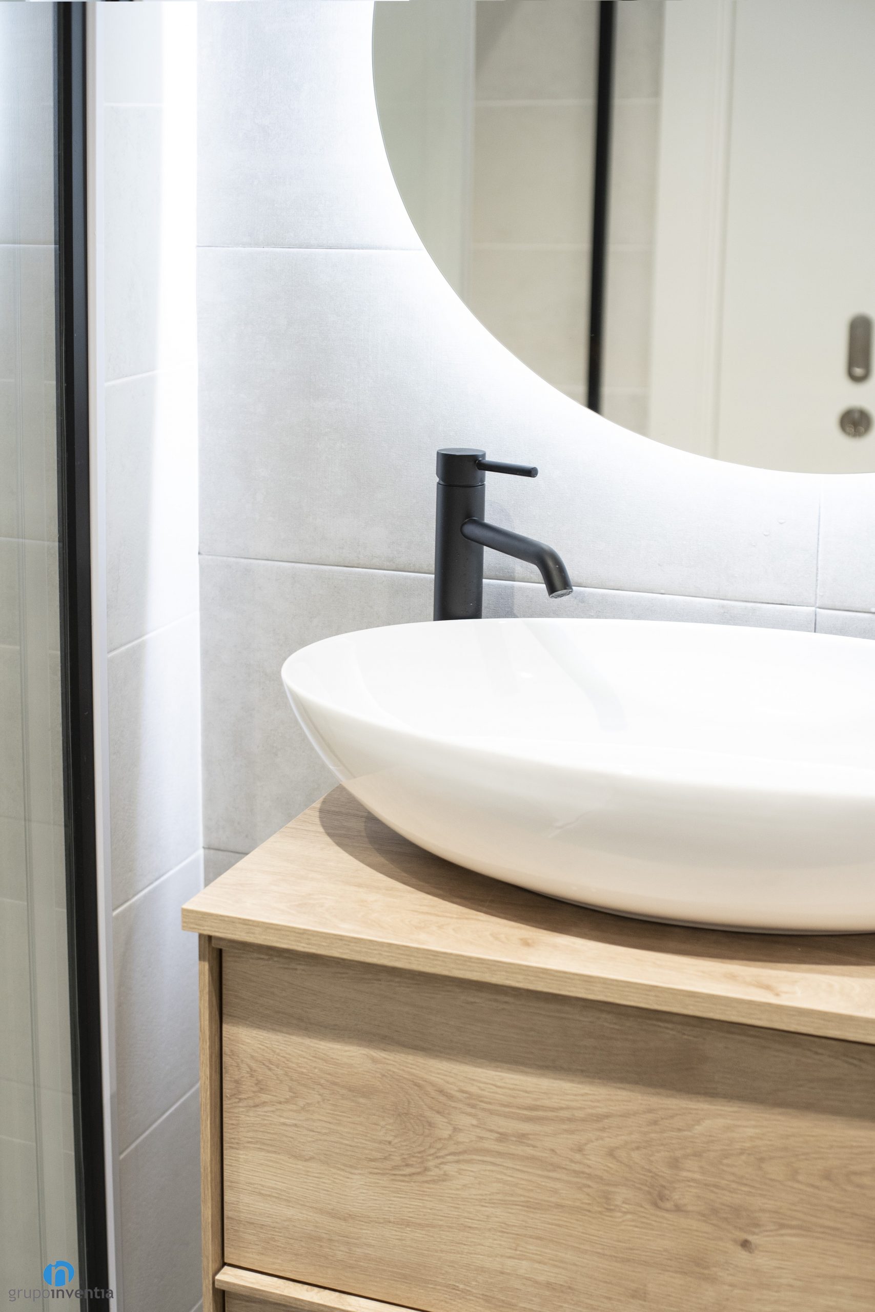 At the bottom of the room we find the new bathroom furniture with sink. It comes in a light wood finish and has four drawers for storage. A detail that will maintain order in the bathroom and properly organize all hygiene products. The sink has a round design and is placed on the countertop. In this bathroom renovation, a matte black faucet was chosen.