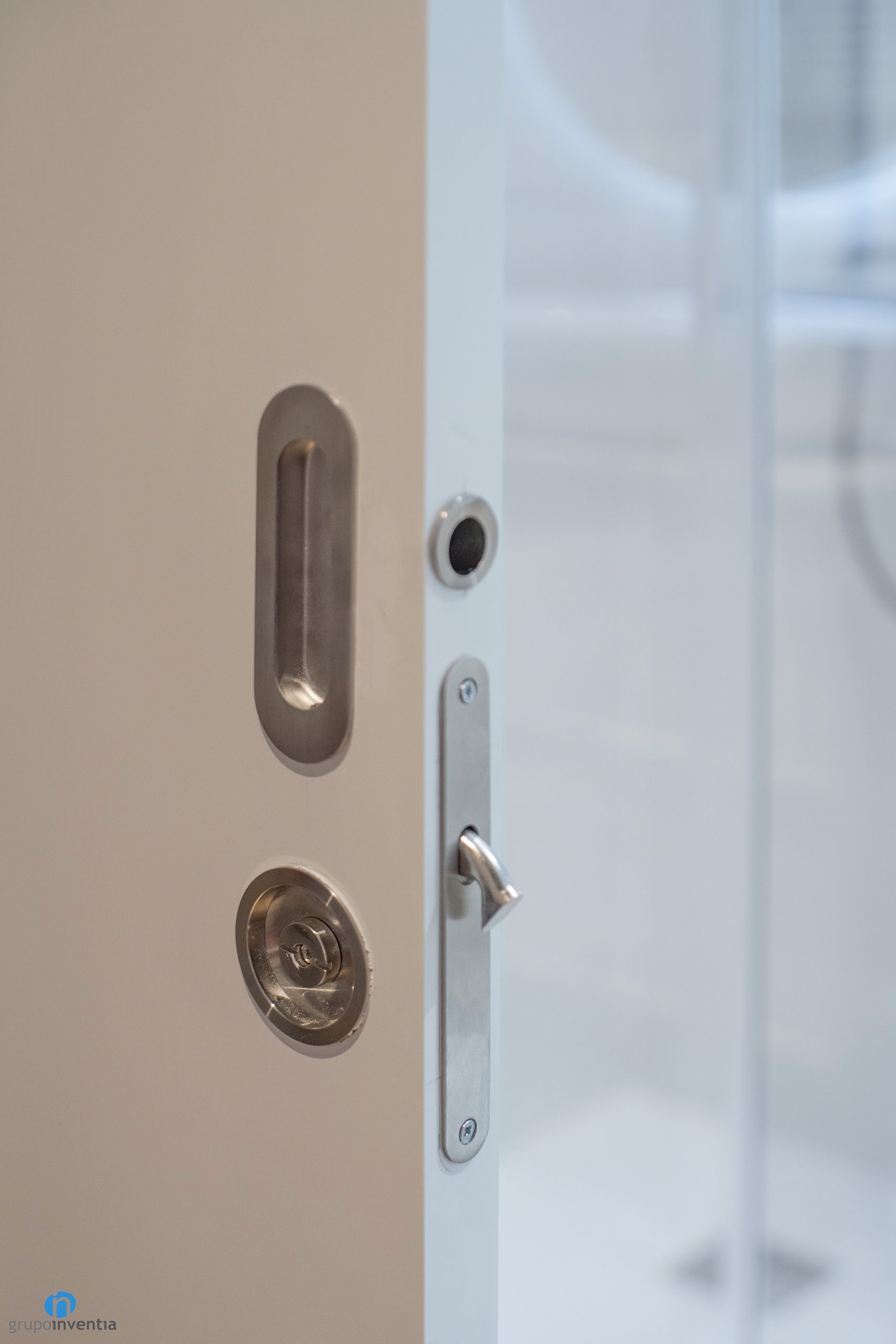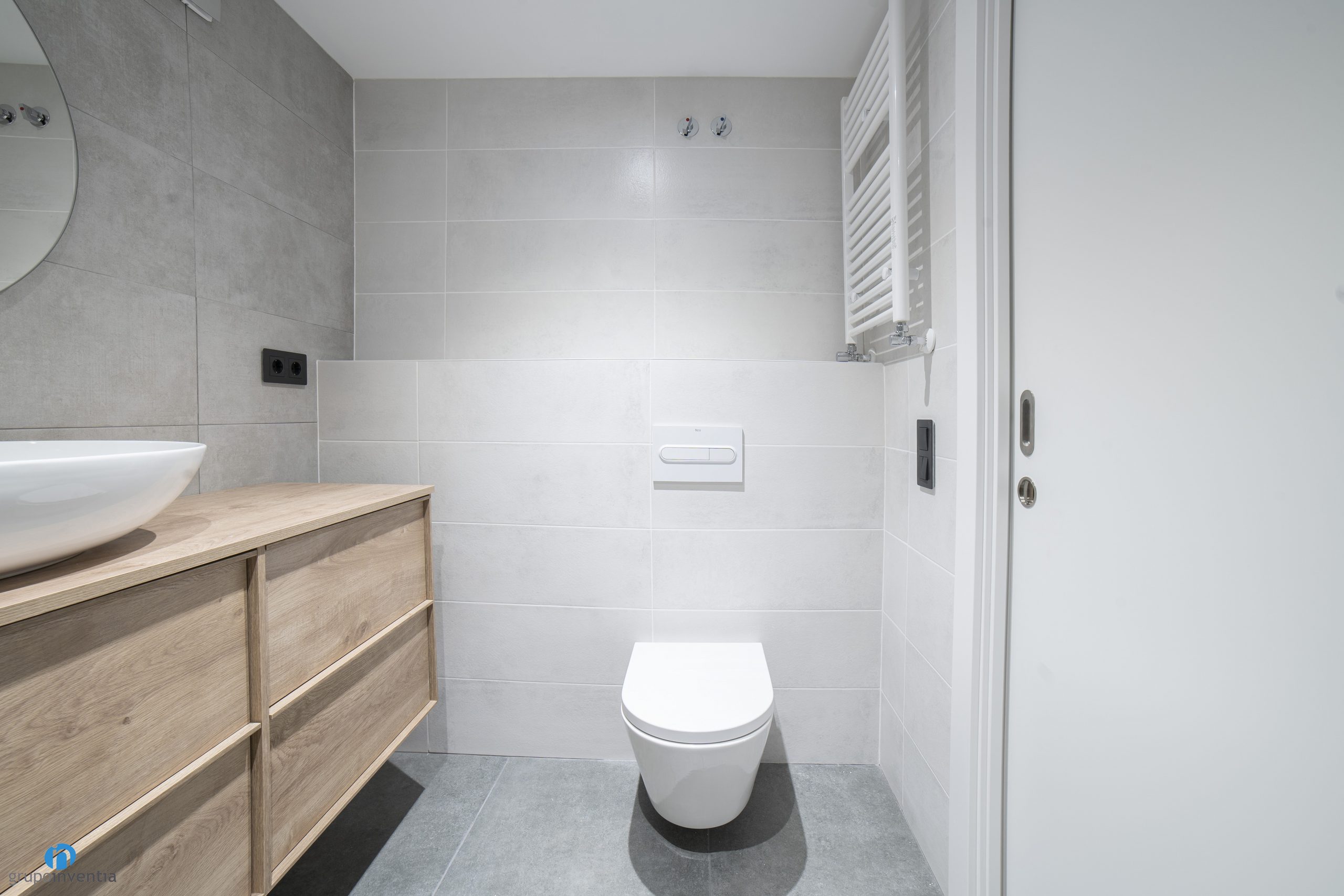 This bathroom is accessed through a sliding door. This is a very advisable element, as in this way you can make the most of the interior space of the bathroom. On the right we find the new toilet. In this case we have opted for a toilet of modern lines with the cistern hidden in the wall. If space allows it and we opt for this option we will get more visual space.