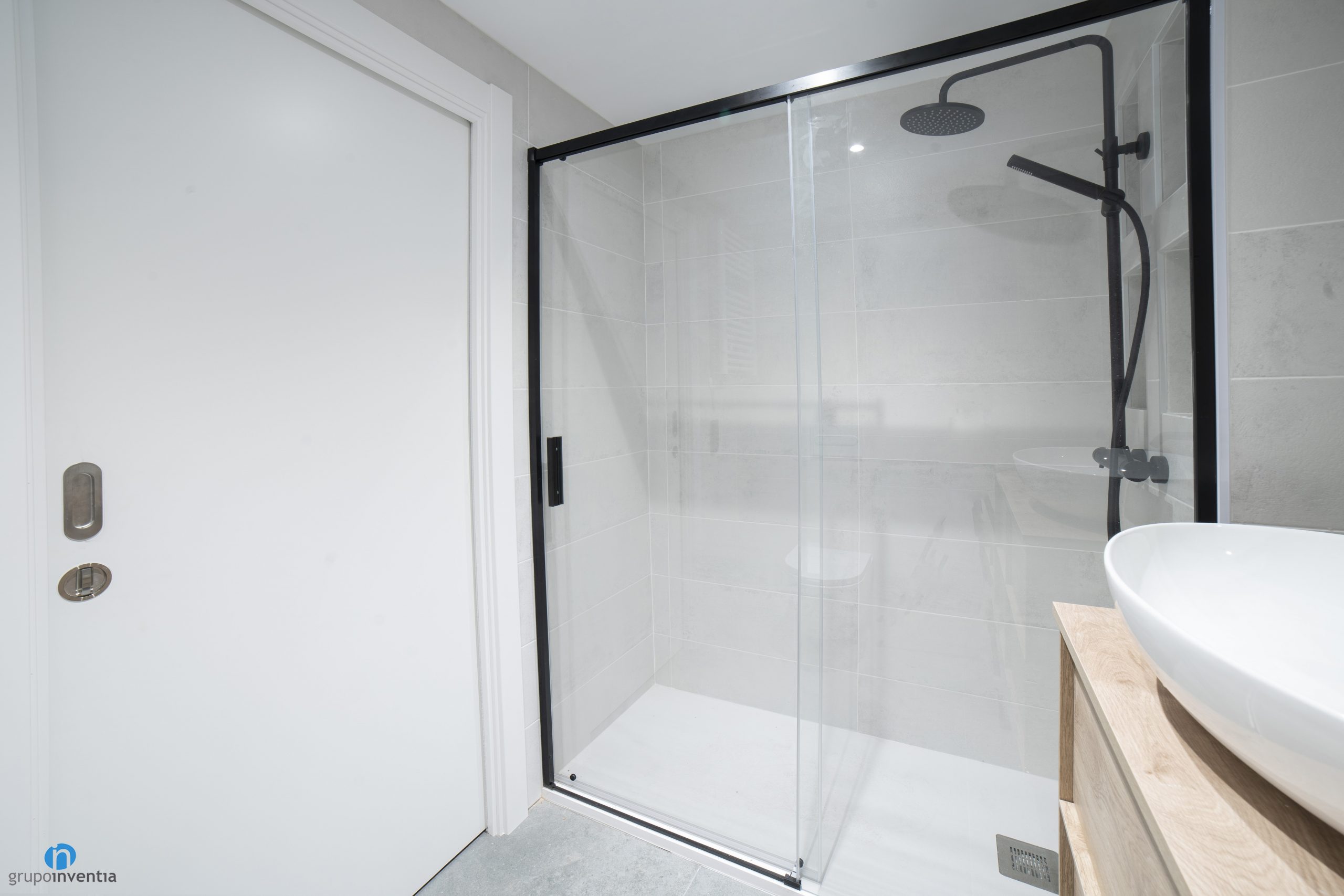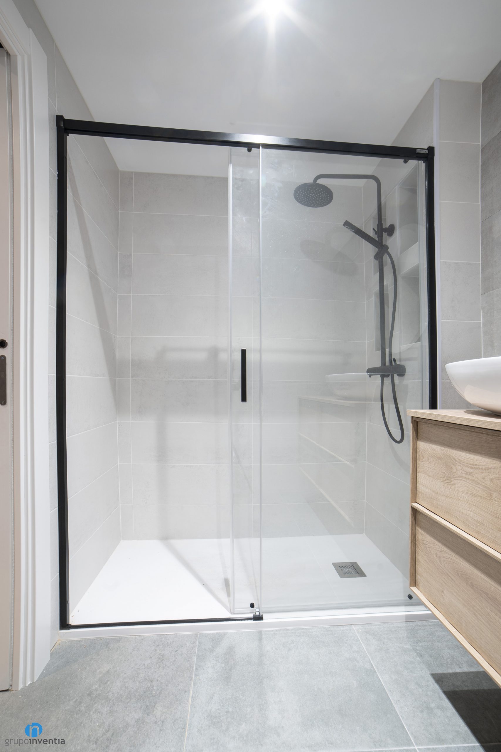 Another of the improvements of this bathroom renovation in terms of sanitary equipment is the change of bathtub for a shower. Definitely a detail that makes a difference and that visually expands the room. In this case, a white floor-level shower tray has been chosen. It is protected by transparent sliding door partitions with black guides. In this way it combines very naturally with the new faucet that has been installed.
