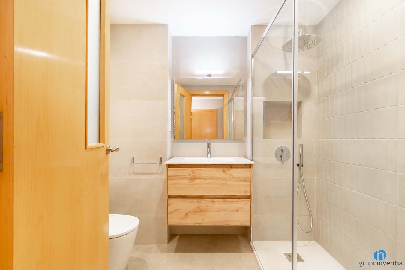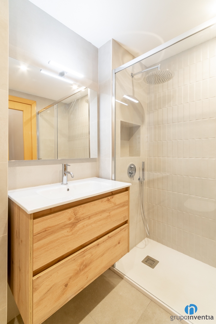 It is also complemented by the wood finishes that we can see in the new bathroom furniture. Specifically in the bathroom furniture and also in an auxiliary wardrobe. In the same way, the access door is also made of wood and has an opaque glass. Thanks to this detail, natural light also comes from other rooms.