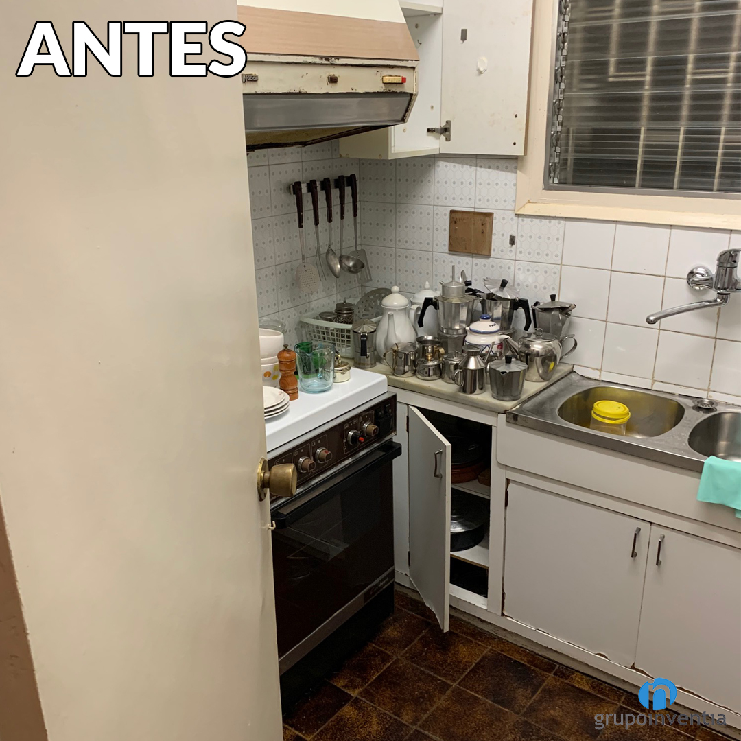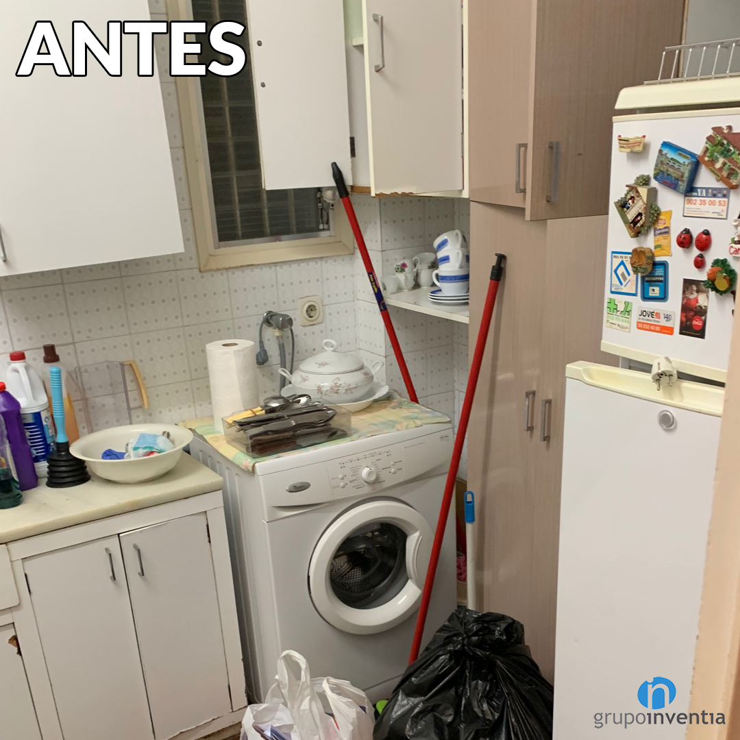 One of the first improvements in this flat renovation we see in the kitchen. It has gone from being an independent room to being open. In the section that used to occupy a wall, it now has a great kitchen bar. It has generated a perfect space for relaxed breakfasts and meals. It has also expanded the support and work surface in the kitchen.