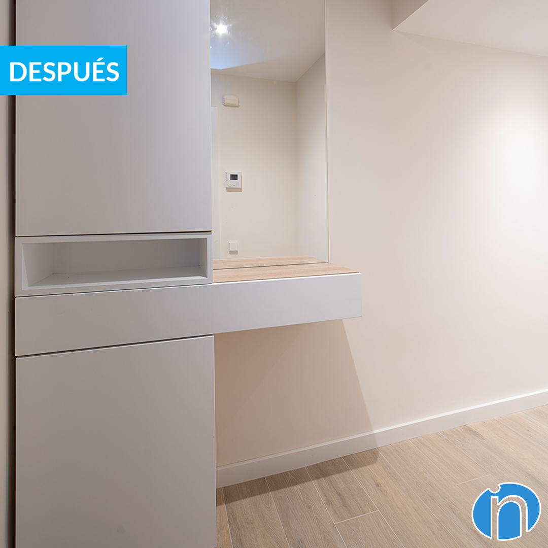 The original tiles have been removed and new white ones have been replaced. This generates a lot of light and spaciousness in the bathroom. Perfect features as it is a space for daily use. The standing washbasin has been replaced by a floating one and the front door has gone from normal to a sliding door.