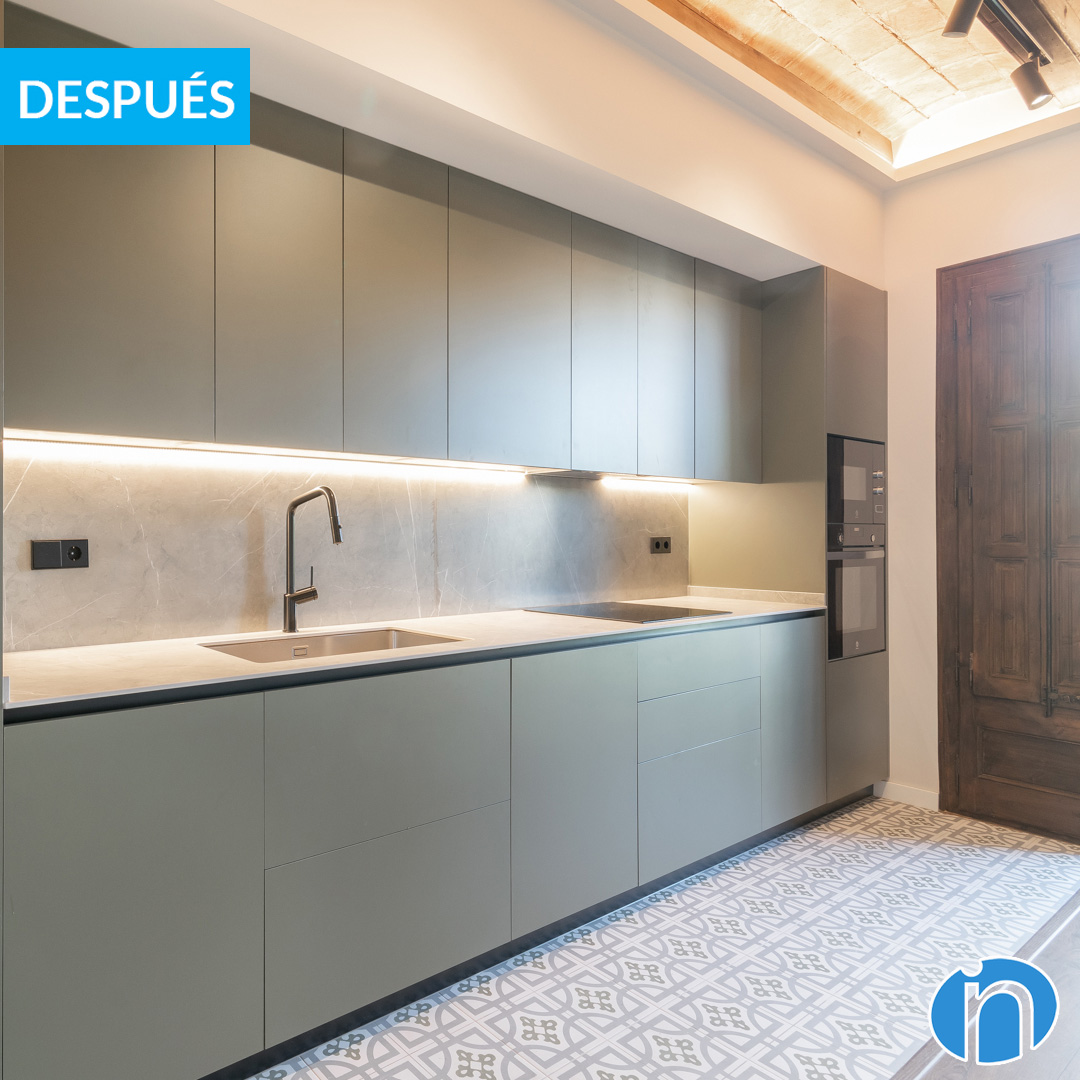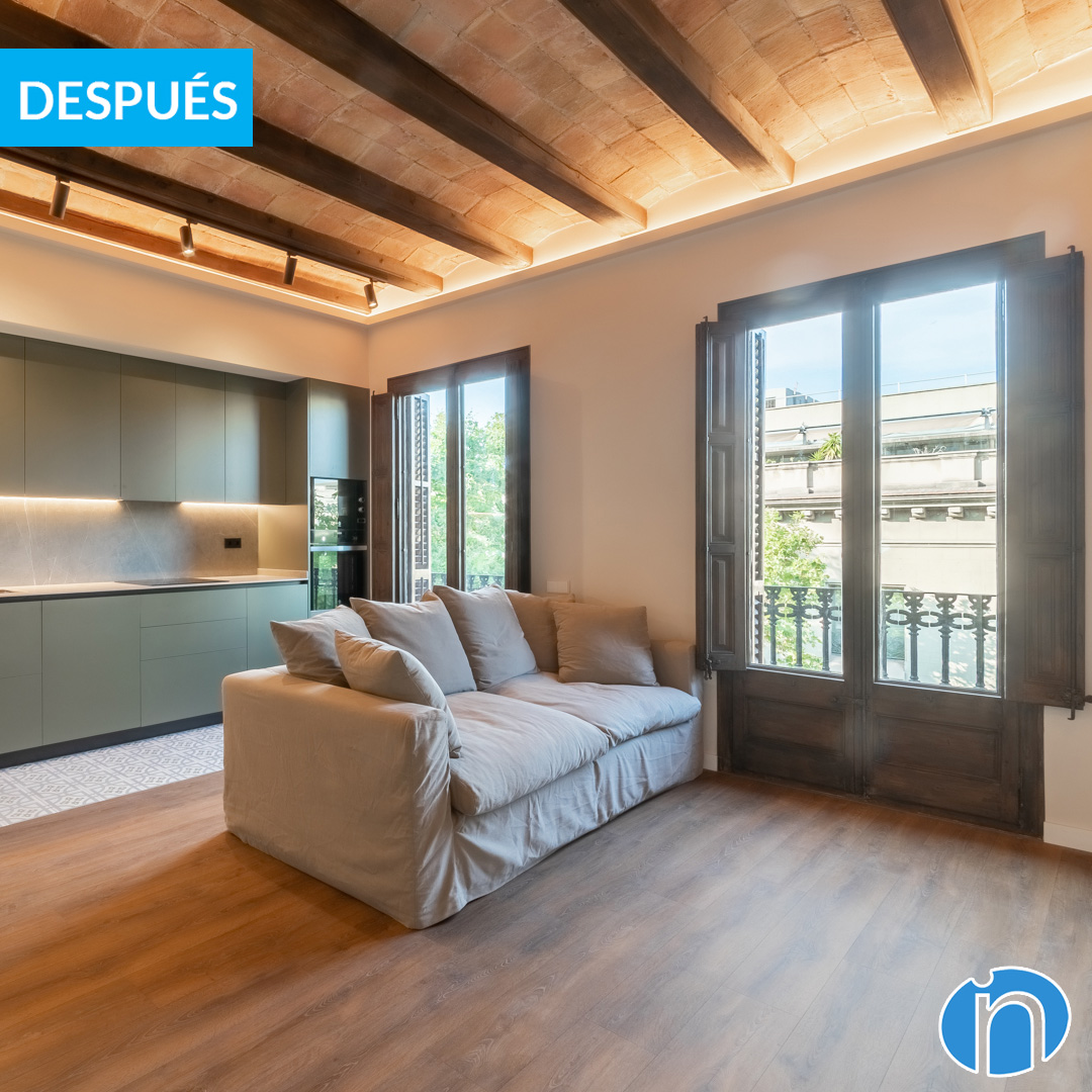 We have traveled to Bruc street in Barcelona to carry out the house renovation of a three-room flat. Now, this space has gone from being a conventional home to a contemporary and stylized home. All this thanks to a series of improvements that have optimized its functionality and aesthetics. This house renovation in Barcelona included the creation of an open kitchen, which, among other advantages, fosters a more sociable and dynamic atmosphere for residents.