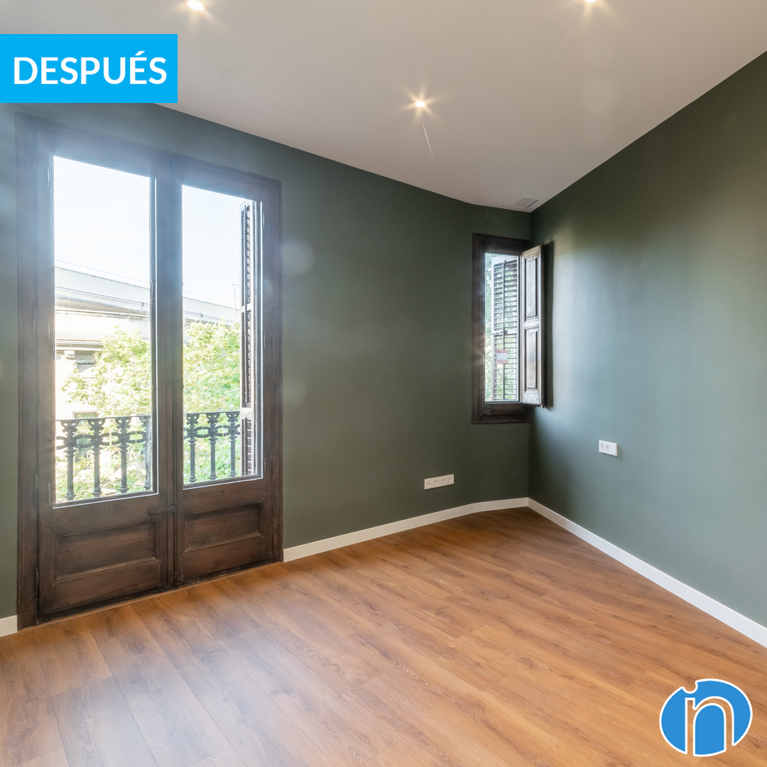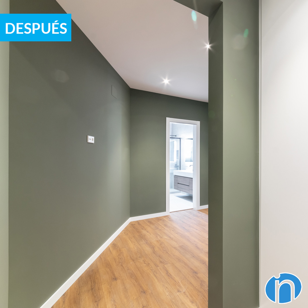 The walls of the bedrooms are dark green and create a cozy and warm atmosphere, ideal for rest. In addition, they combine with the new kitchen furniture, achieving a more integrated and homogeneous image. This new image is combined with a parquet floor in light wood tones.