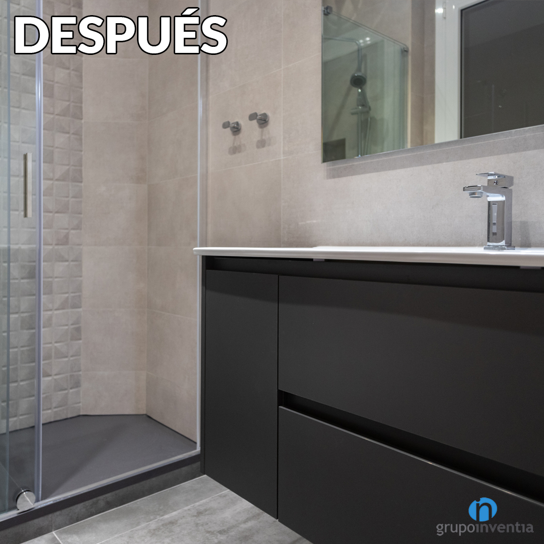A new bathroom has also been created in the original space occupied by the kitchen. This one is presented with a contemporary design just like the previous one and has a complete sanitary equipment. It consists of washbasin with storage unit, floating toilet and shower tray. For its part, the kitchen has been relocated to what was originally a bedroom.