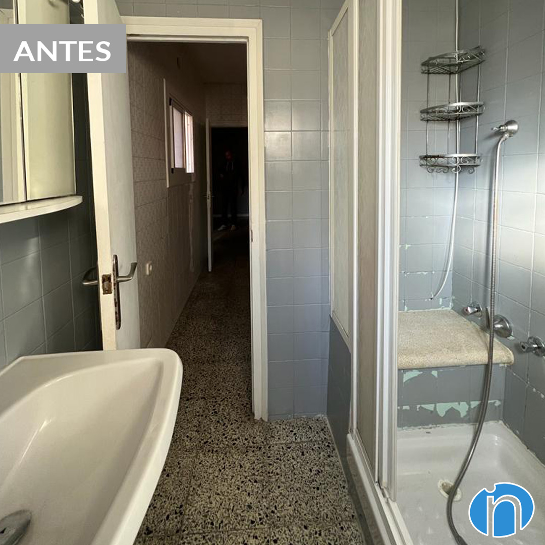 The original image was very overloaded and used dark colors that we have changed. We have tiled the walls with white and beige tiles. Now there is a greater feeling of spaciousness and light in the bathroom. You can also breathe a fresher and more welcoming atmosphere. We have changed the original terrazzo floor to a ceramic floor with a light wood finish.